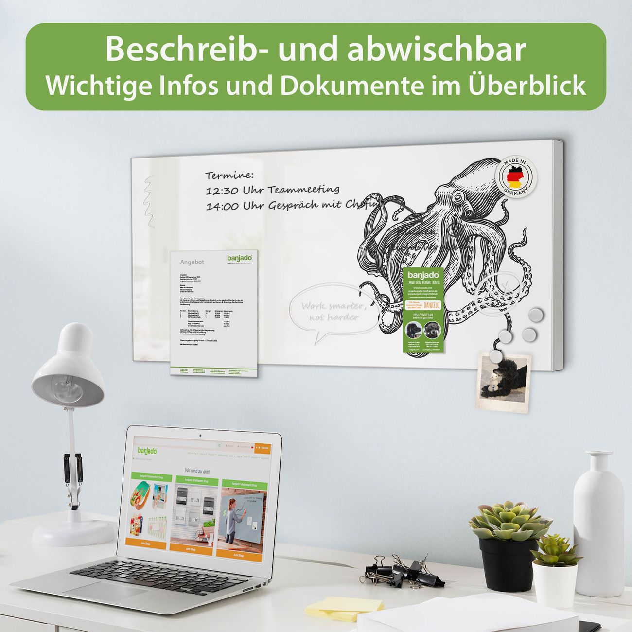 FUNKTION: Die banjado Magnettafel 78x37 cm im Design Motiv Oktopus 9 vereint Funktionalität und modernes Wohndesign auf stilvolle Weise. Diese hochwertige Magnetwand aus Metall hilft Ihnen dabei, Notizen, Fotos, Termine, Einkaufslisten oder Rezepte übersichtlich zu organisieren. Als praktisches Memoboard sorgt sie für Struktur im Alltag und setzt gleichzeitig einen dekorativen Akzent an Ihrer Wand. DESIGN: Die Metalltafel besteht aus robustem, lackiertem Stahl und ist mit allen handelsüblichen Magneten nutzbar. Besonders praktisch ist die beschreibbare Oberfläche. Sie können die Magnettafel ganz einfach mit Kreidestiften beschriften und die Inhalte bei Bedarf mit einem feuchten Tuch wieder entfernen. So eignet sich das Memoboard ideal für Wochenpläne, Menüpläne, To Do Listen oder kreative Botschaften. DETAILS: Mit ihrem großzügigen Querformat von 78x37 cm bietet die Magnettafel ausreichend Platz für Ihre Organisation. Das Motiv Motiv Oktopus 9 bringt eine warme, natürliche Optik in Küche, Flur, Büro oder Homeoffice und wirkt auch ohne Magnete oder Beschriftung wie ein modernes Wandbild. NUTZEN: Auf der Rückseite befinden sich vorgefertigte Löcher für eine schnelle und unkomplizierte Wandmontage. Jede banjado Magnettafel wird in Deutschland gefertigt und steht für Qualität, Langlebigkeit und liebevolle Verarbeitung. Dieses beschreibbare Memoboard ist die perfekte Kombination aus Metalltafel, Designobjekt und praktischer Magnetwand für Ihren Alltag. BANJADO: Wir sind ein kleines Team aus dem Herzen von Sachsen. Wir fertigen alle Artikel von Hand für Sie an, Sie erhalten keine preiswerte Importware. Auf Wunsch können Sie auch Ihr eigenes Foto auf die Magnettafel aufbringen, schreiben Sie uns an. Herzlichst, Ihr banjado-Team