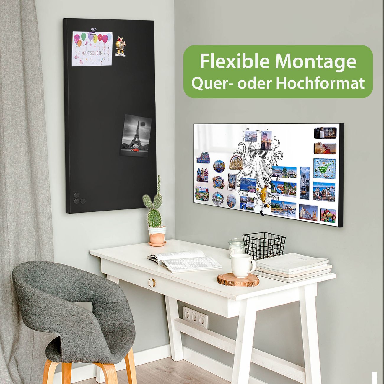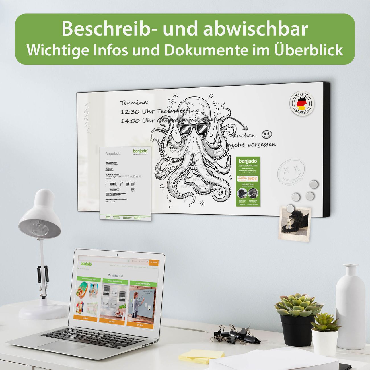 FUNKTION: Die banjado Magnettafel 78x37 cm im Design Motiv Oktopus mit Brille vereint Funktionalität und modernes Wohndesign auf stilvolle Weise. Diese hochwertige Magnetwand aus Metall hilft Ihnen dabei, Notizen, Fotos, Termine, Einkaufslisten oder Rezepte übersichtlich zu organisieren. Als praktisches Memoboard sorgt sie für Struktur im Alltag und setzt gleichzeitig einen dekorativen Akzent an Ihrer Wand. DESIGN: Die Metalltafel besteht aus robustem, lackiertem Stahl und ist mit allen handelsüblichen Magneten nutzbar. Besonders praktisch ist die beschreibbare Oberfläche. Sie können die Magnettafel ganz einfach mit Kreidestiften beschriften und die Inhalte bei Bedarf mit einem feuchten Tuch wieder entfernen. So eignet sich das Memoboard ideal für Wochenpläne, Menüpläne, To Do Listen oder kreative Botschaften. DETAILS: Mit ihrem großzügigen Querformat von 78x37 cm bietet die Magnettafel ausreichend Platz für Ihre Organisation. Das Motiv Motiv Oktopus mit Brille bringt eine warme, natürliche Optik in Küche, Flur, Büro oder Homeoffice und wirkt auch ohne Magnete oder Beschriftung wie ein modernes Wandbild. NUTZEN: Auf der Rückseite befinden sich vorgefertigte Löcher für eine schnelle und unkomplizierte Wandmontage. Jede banjado Magnettafel wird in Deutschland gefertigt und steht für Qualität, Langlebigkeit und liebevolle Verarbeitung. Dieses beschreibbare Memoboard ist die perfekte Kombination aus Metalltafel, Designobjekt und praktischer Magnetwand für Ihren Alltag. BANJADO: Wir sind ein kleines Team aus dem Herzen von Sachsen. Wir fertigen alle Artikel von Hand für Sie an, Sie erhalten keine preiswerte Importware. Auf Wunsch können Sie auch Ihr eigenes Foto auf die Magnettafel aufbringen, schreiben Sie uns an. Herzlichst, Ihr banjado-Team