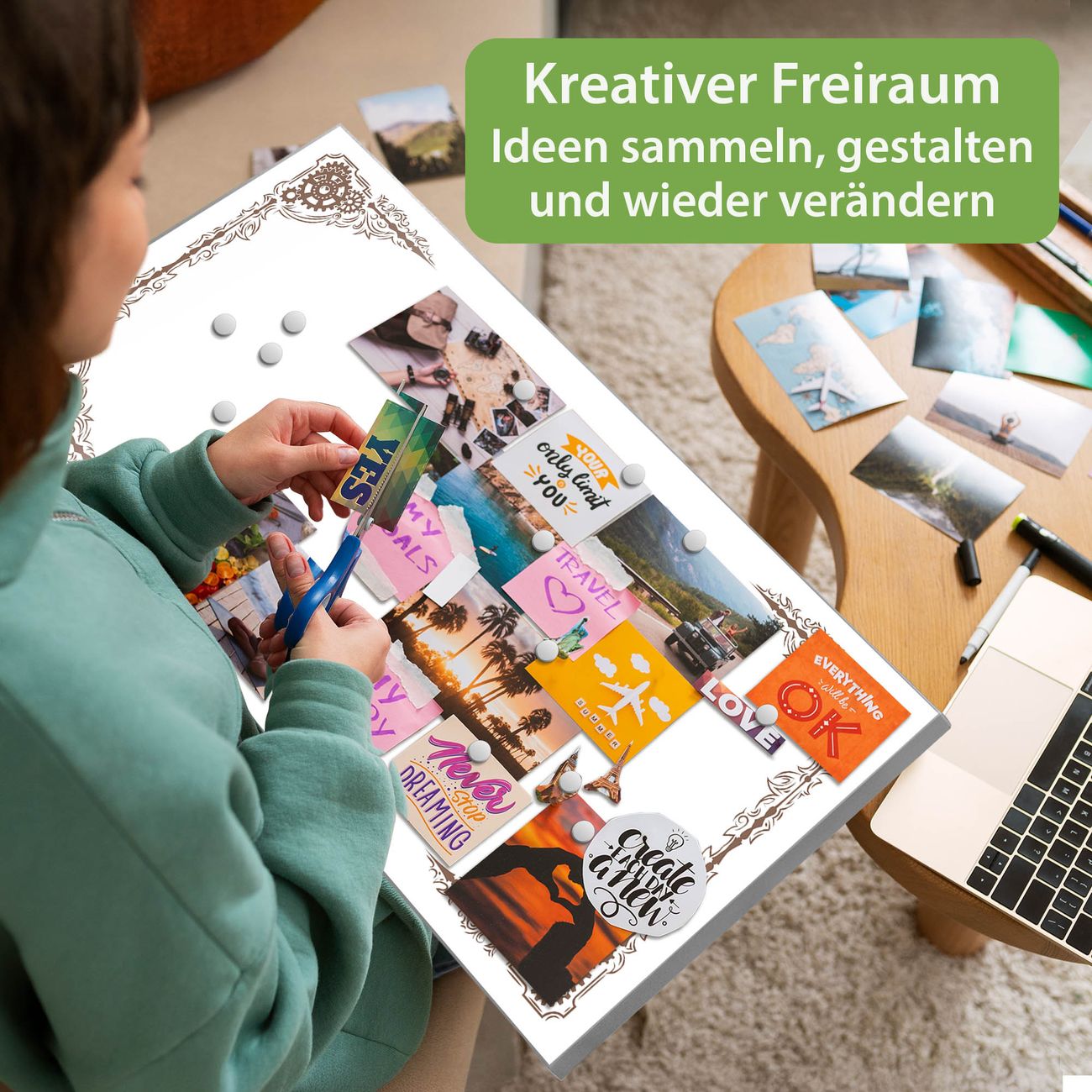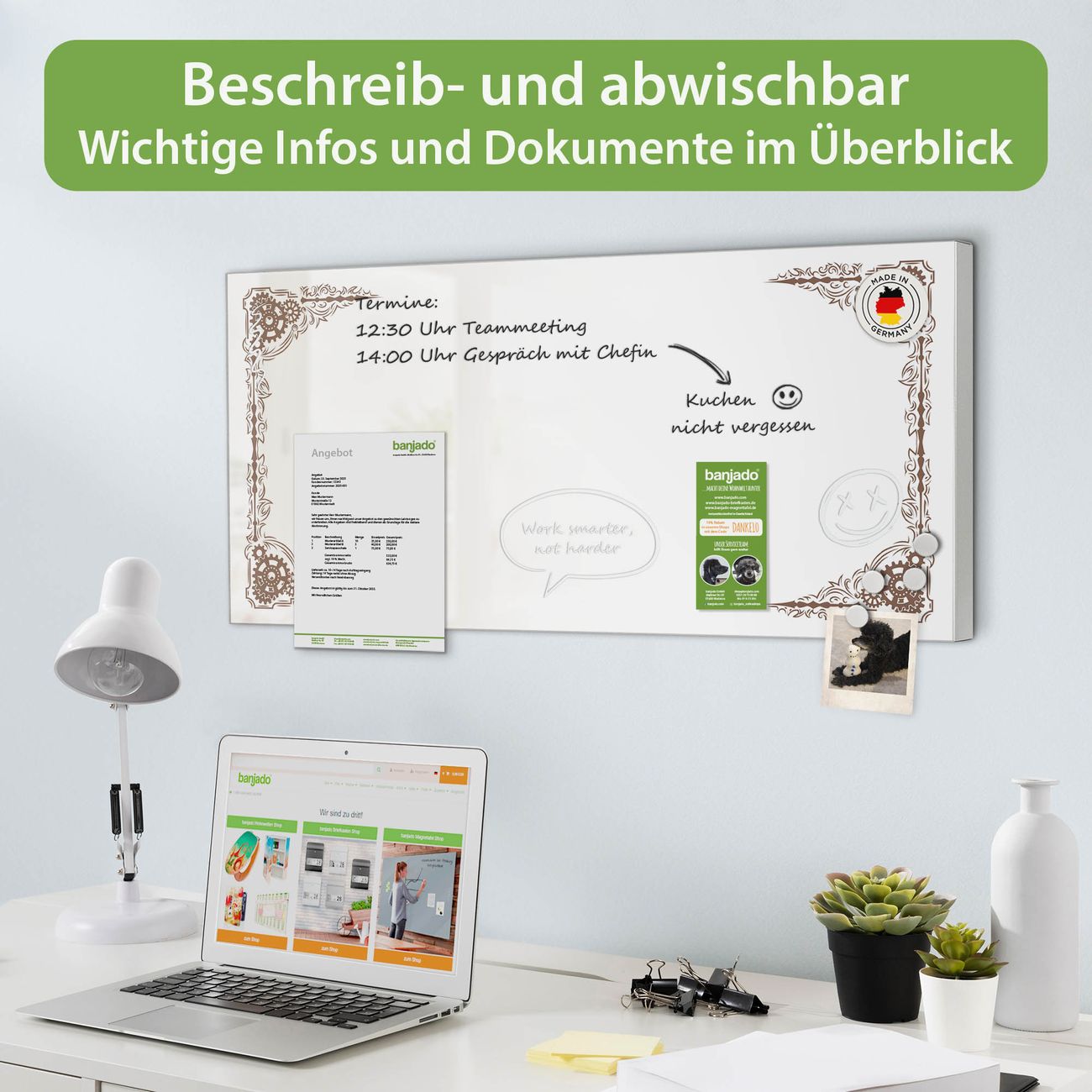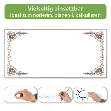 FUNKTION: Die banjado Magnettafel 78x37 cm im Design Motiv Ornamentaler Zahnräderrahmen vereint Funktionalität und modernes Wohndesign auf stilvolle Weise. Diese hochwertige Magnetwand aus Metall hilft Ihnen dabei, Notizen, Fotos, Termine, Einkaufslisten oder Rezepte übersichtlich zu organisieren. Als praktisches Memoboard sorgt sie für Struktur im Alltag und setzt gleichzeitig einen dekorativen Akzent an Ihrer Wand. DESIGN: Die Metalltafel besteht aus robustem, lackiertem Stahl und ist mit allen handelsüblichen Magneten nutzbar. Besonders praktisch ist die beschreibbare Oberfläche. Sie können die Magnettafel ganz einfach mit Kreidestiften beschriften und die Inhalte bei Bedarf mit einem feuchten Tuch wieder entfernen. So eignet sich das Memoboard ideal für Wochenpläne, Menüpläne, To Do Listen oder kreative Botschaften. DETAILS: Mit ihrem großzügigen Querformat von 78x37 cm bietet die Magnettafel ausreichend Platz für Ihre Organisation. Das Motiv Motiv Ornamentaler Zahnräderrahmen bringt eine warme, natürliche Optik in Küche, Flur, Büro oder Homeoffice und wirkt auch ohne Magnete oder Beschriftung wie ein modernes Wandbild. NUTZEN: Auf der Rückseite befinden sich vorgefertigte Löcher für eine schnelle und unkomplizierte Wandmontage. Jede banjado Magnettafel wird in Deutschland gefertigt und steht für Qualität, Langlebigkeit und liebevolle Verarbeitung. Dieses beschreibbare Memoboard ist die perfekte Kombination aus Metalltafel, Designobjekt und praktischer Magnetwand für Ihren Alltag. BANJADO: Wir sind ein kleines Team aus dem Herzen von Sachsen. Wir fertigen alle Artikel von Hand für Sie an, Sie erhalten keine preiswerte Importware. Auf Wunsch können Sie auch Ihr eigenes Foto auf die Magnettafel aufbringen, schreiben Sie uns an. Herzlichst, Ihr banjado-Team