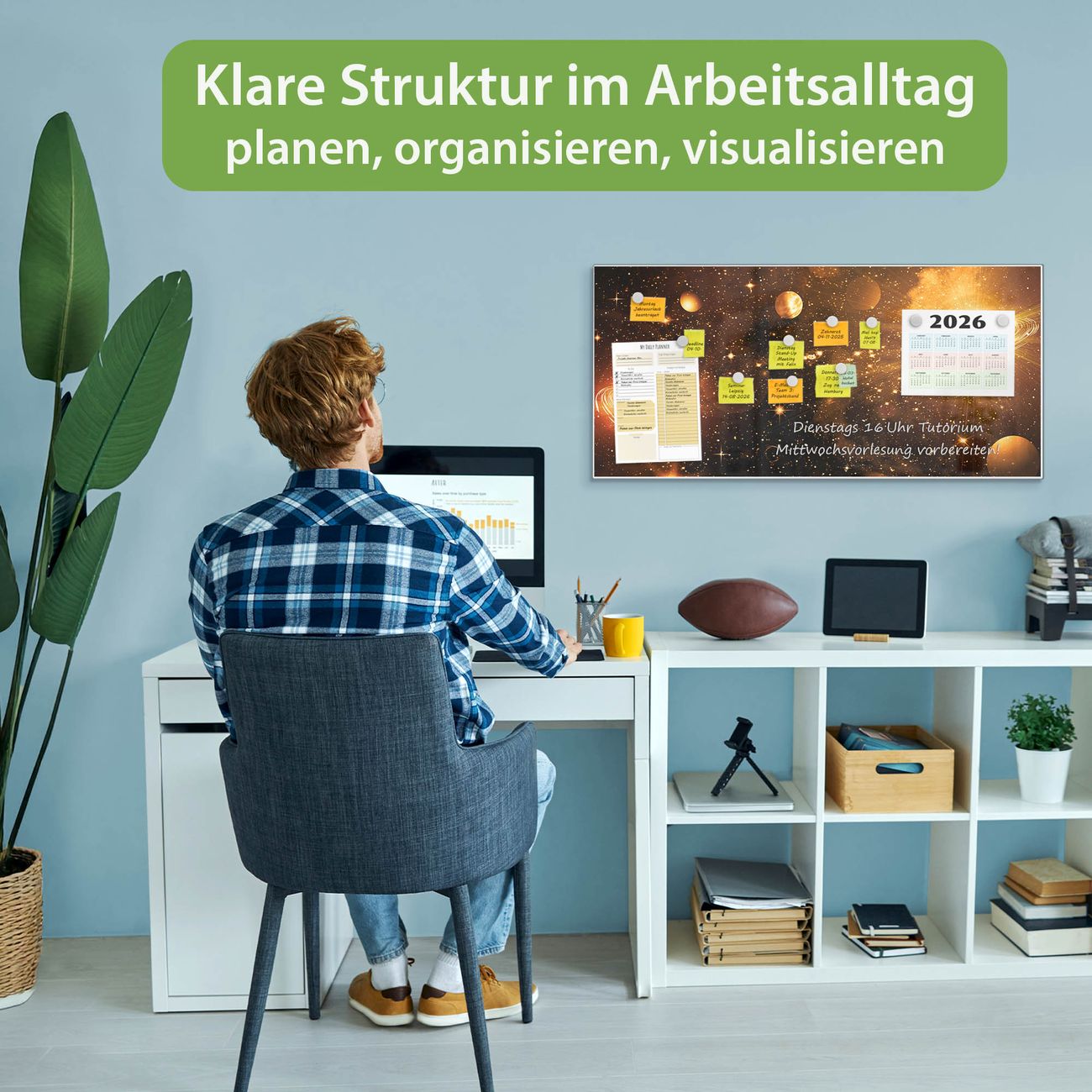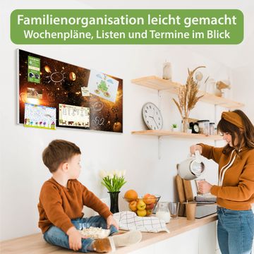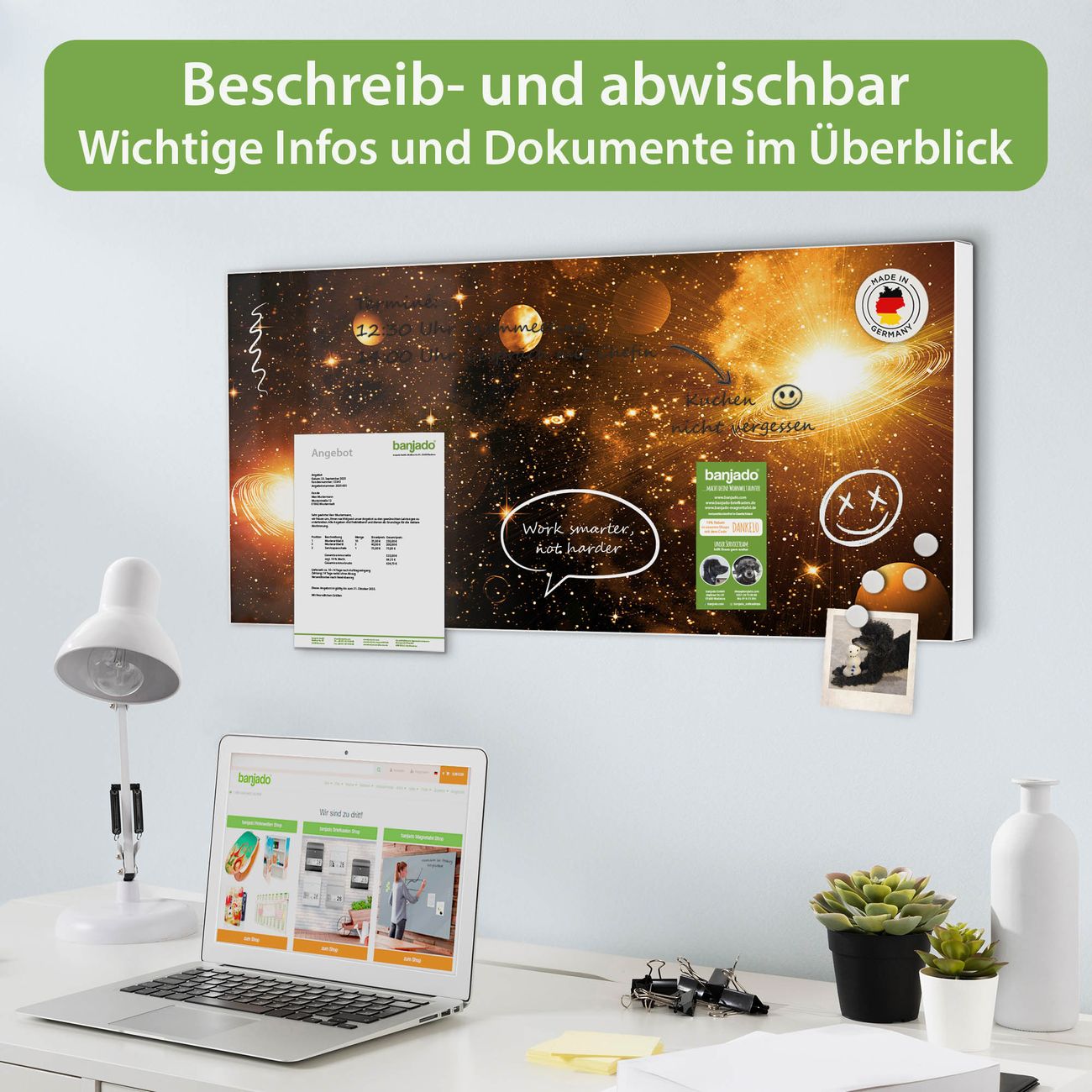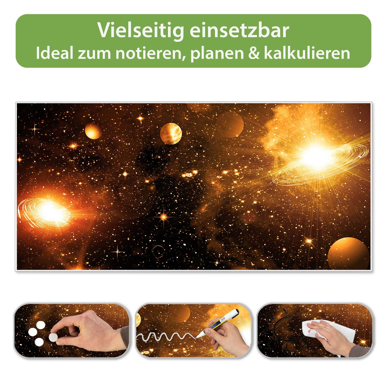 FUNKTION: Die banjado Magnettafel 78x37 cm im Design Motiv Outer Space vereint Funktionalität und modernes Wohndesign auf stilvolle Weise. Diese hochwertige Magnetwand aus Metall hilft Ihnen dabei, Notizen, Fotos, Termine, Einkaufslisten oder Rezepte übersichtlich zu organisieren. Als praktisches Memoboard sorgt sie für Struktur im Alltag und setzt gleichzeitig einen dekorativen Akzent an Ihrer Wand. DESIGN: Die Metalltafel besteht aus robustem, lackiertem Stahl und ist mit allen handelsüblichen Magneten nutzbar. Besonders praktisch ist die beschreibbare Oberfläche. Sie können die Magnettafel ganz einfach mit Kreidestiften beschriften und die Inhalte bei Bedarf mit einem feuchten Tuch wieder entfernen. So eignet sich das Memoboard ideal für Wochenpläne, Menüpläne, To Do Listen oder kreative Botschaften. DETAILS: Mit ihrem großzügigen Querformat von 78x37 cm bietet die Magnettafel ausreichend Platz für Ihre Organisation. Das Motiv Motiv Outer Space bringt eine warme, natürliche Optik in Küche, Flur, Büro oder Homeoffice und wirkt auch ohne Magnete oder Beschriftung wie ein modernes Wandbild. NUTZEN: Auf der Rückseite befinden sich vorgefertigte Löcher für eine schnelle und unkomplizierte Wandmontage. Jede banjado Magnettafel wird in Deutschland gefertigt und steht für Qualität, Langlebigkeit und liebevolle Verarbeitung. Dieses beschreibbare Memoboard ist die perfekte Kombination aus Metalltafel, Designobjekt und praktischer Magnetwand für Ihren Alltag. BANJADO: Wir sind ein kleines Team aus dem Herzen von Sachsen. Wir fertigen alle Artikel von Hand für Sie an, Sie erhalten keine preiswerte Importware. Auf Wunsch können Sie auch Ihr eigenes Foto auf die Magnettafel aufbringen, schreiben Sie uns an. Herzlichst, Ihr banjado-Team