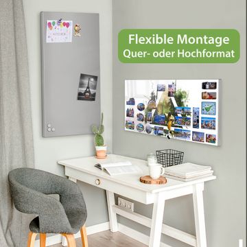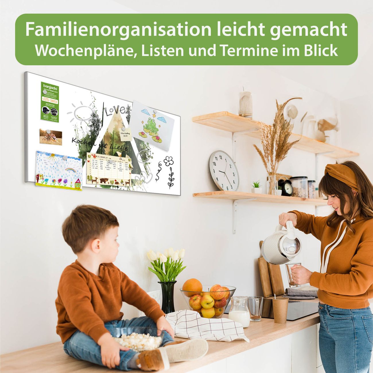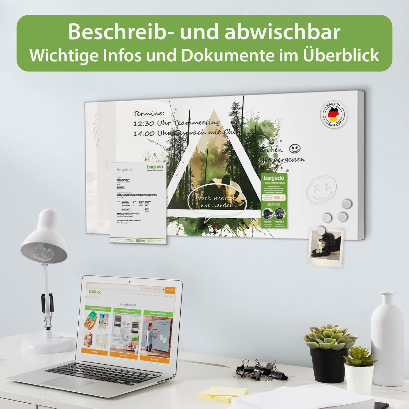 FUNKTION: Die banjado Magnettafel 78x37 cm im Design Motiv Panda im Wald Dreieck vereint Funktionalität und modernes Wohndesign auf stilvolle Weise. Diese hochwertige Magnetwand aus Metall hilft Ihnen dabei, Notizen, Fotos, Termine, Einkaufslisten oder Rezepte übersichtlich zu organisieren. Als praktisches Memoboard sorgt sie für Struktur im Alltag und setzt gleichzeitig einen dekorativen Akzent an Ihrer Wand. DESIGN: Die Metalltafel besteht aus robustem, lackiertem Stahl und ist mit allen handelsüblichen Magneten nutzbar. Besonders praktisch ist die beschreibbare Oberfläche. Sie können die Magnettafel ganz einfach mit Kreidestiften beschriften und die Inhalte bei Bedarf mit einem feuchten Tuch wieder entfernen. So eignet sich das Memoboard ideal für Wochenpläne, Menüpläne, To Do Listen oder kreative Botschaften. DETAILS: Mit ihrem großzügigen Querformat von 78x37 cm bietet die Magnettafel ausreichend Platz für Ihre Organisation. Das Motiv Motiv Panda im Wald Dreieck bringt eine warme, natürliche Optik in Küche, Flur, Büro oder Homeoffice und wirkt auch ohne Magnete oder Beschriftung wie ein modernes Wandbild. NUTZEN: Auf der Rückseite befinden sich vorgefertigte Löcher für eine schnelle und unkomplizierte Wandmontage. Jede banjado Magnettafel wird in Deutschland gefertigt und steht für Qualität, Langlebigkeit und liebevolle Verarbeitung. Dieses beschreibbare Memoboard ist die perfekte Kombination aus Metalltafel, Designobjekt und praktischer Magnetwand für Ihren Alltag. BANJADO: Wir sind ein kleines Team aus dem Herzen von Sachsen. Wir fertigen alle Artikel von Hand für Sie an, Sie erhalten keine preiswerte Importware. Auf Wunsch können Sie auch Ihr eigenes Foto auf die Magnettafel aufbringen, schreiben Sie uns an. Herzlichst, Ihr banjado-Team