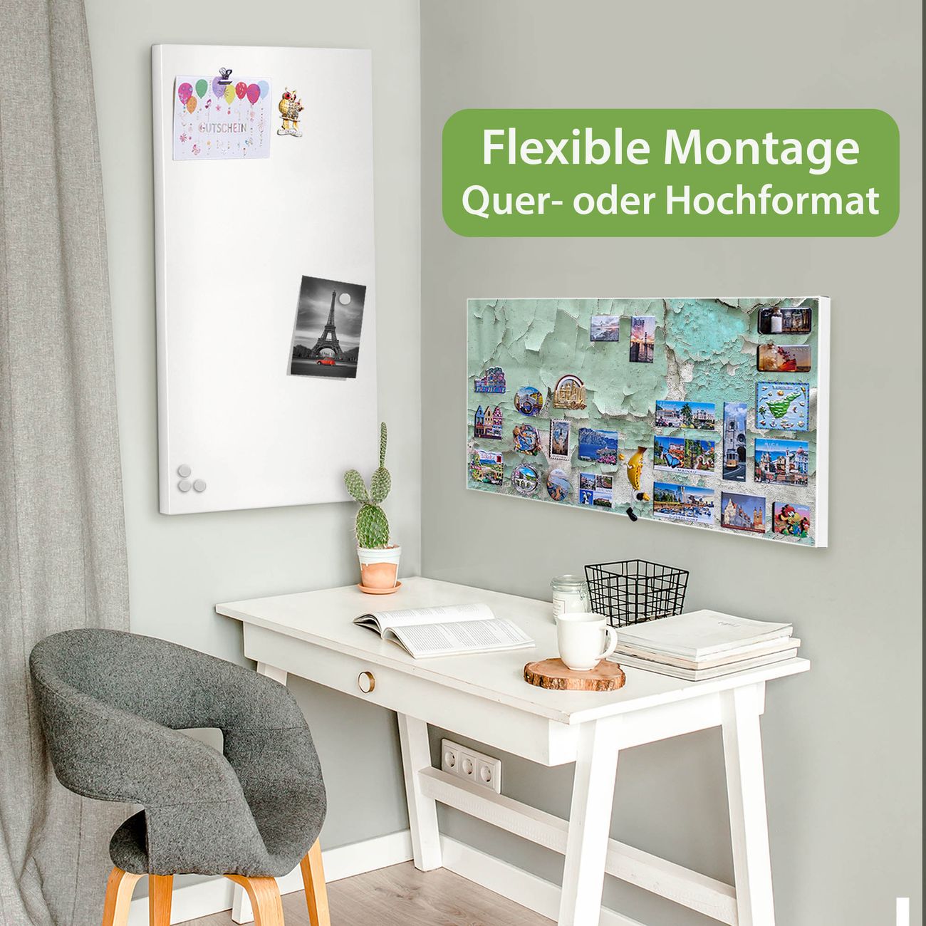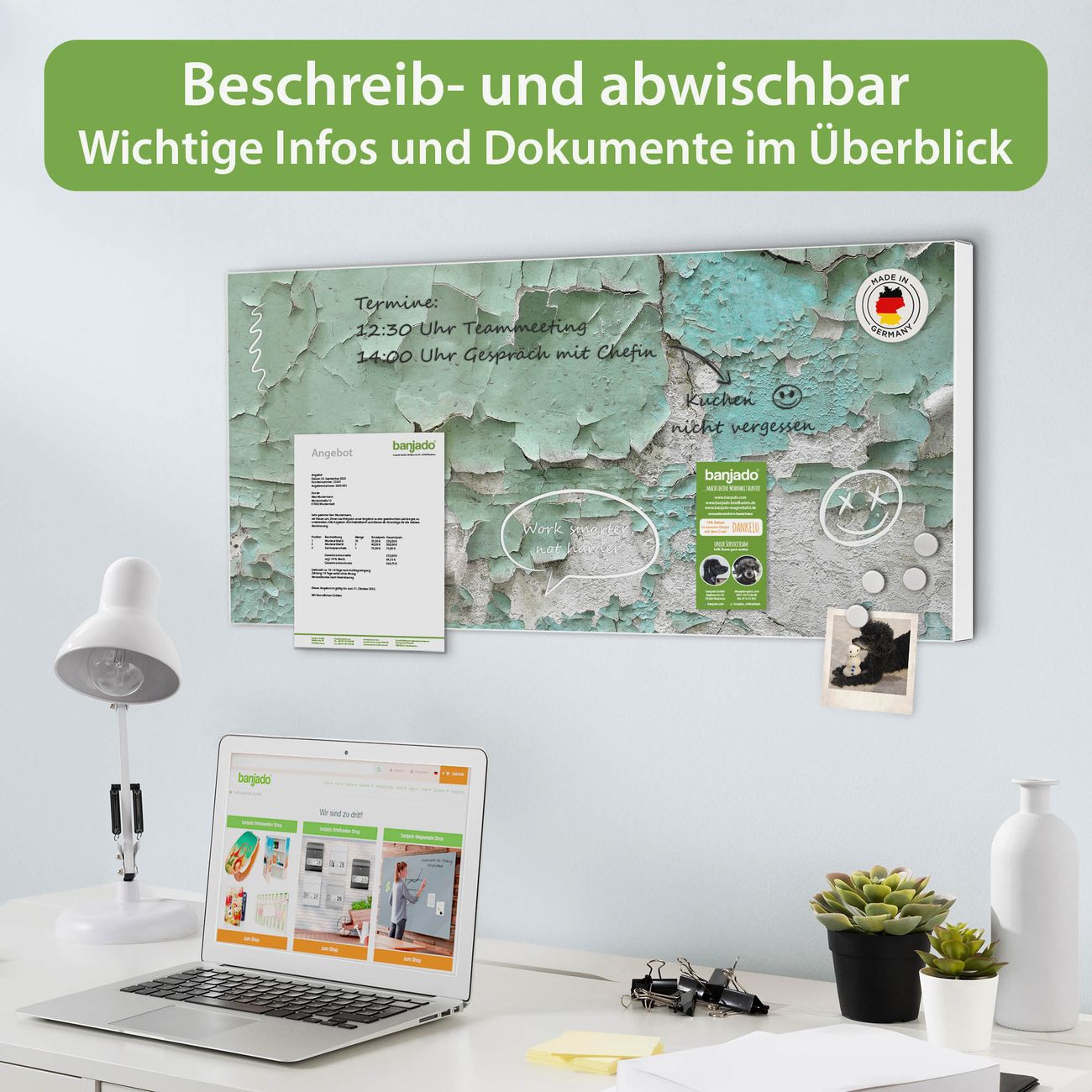 FUNKTION: Die banjado Magnettafel 78x37 cm im Design Motiv Patina Mint vereint Funktionalität und modernes Wohndesign auf stilvolle Weise. Diese hochwertige Magnetwand aus Metall hilft Ihnen dabei, Notizen, Fotos, Termine, Einkaufslisten oder Rezepte übersichtlich zu organisieren. Als praktisches Memoboard sorgt sie für Struktur im Alltag und setzt gleichzeitig einen dekorativen Akzent an Ihrer Wand. DESIGN: Die Metalltafel besteht aus robustem, lackiertem Stahl und ist mit allen handelsüblichen Magneten nutzbar. Besonders praktisch ist die beschreibbare Oberfläche. Sie können die Magnettafel ganz einfach mit Kreidestiften beschriften und die Inhalte bei Bedarf mit einem feuchten Tuch wieder entfernen. So eignet sich das Memoboard ideal für Wochenpläne, Menüpläne, To Do Listen oder kreative Botschaften. DETAILS: Mit ihrem großzügigen Querformat von 78x37 cm bietet die Magnettafel ausreichend Platz für Ihre Organisation. Das Motiv Motiv Patina Mint bringt eine warme, natürliche Optik in Küche, Flur, Büro oder Homeoffice und wirkt auch ohne Magnete oder Beschriftung wie ein modernes Wandbild. NUTZEN: Auf der Rückseite befinden sich vorgefertigte Löcher für eine schnelle und unkomplizierte Wandmontage. Jede banjado Magnettafel wird in Deutschland gefertigt und steht für Qualität, Langlebigkeit und liebevolle Verarbeitung. Dieses beschreibbare Memoboard ist die perfekte Kombination aus Metalltafel, Designobjekt und praktischer Magnetwand für Ihren Alltag. BANJADO: Wir sind ein kleines Team aus dem Herzen von Sachsen. Wir fertigen alle Artikel von Hand für Sie an, Sie erhalten keine preiswerte Importware. Auf Wunsch können Sie auch Ihr eigenes Foto auf die Magnettafel aufbringen, schreiben Sie uns an. Herzlichst, Ihr banjado-Team