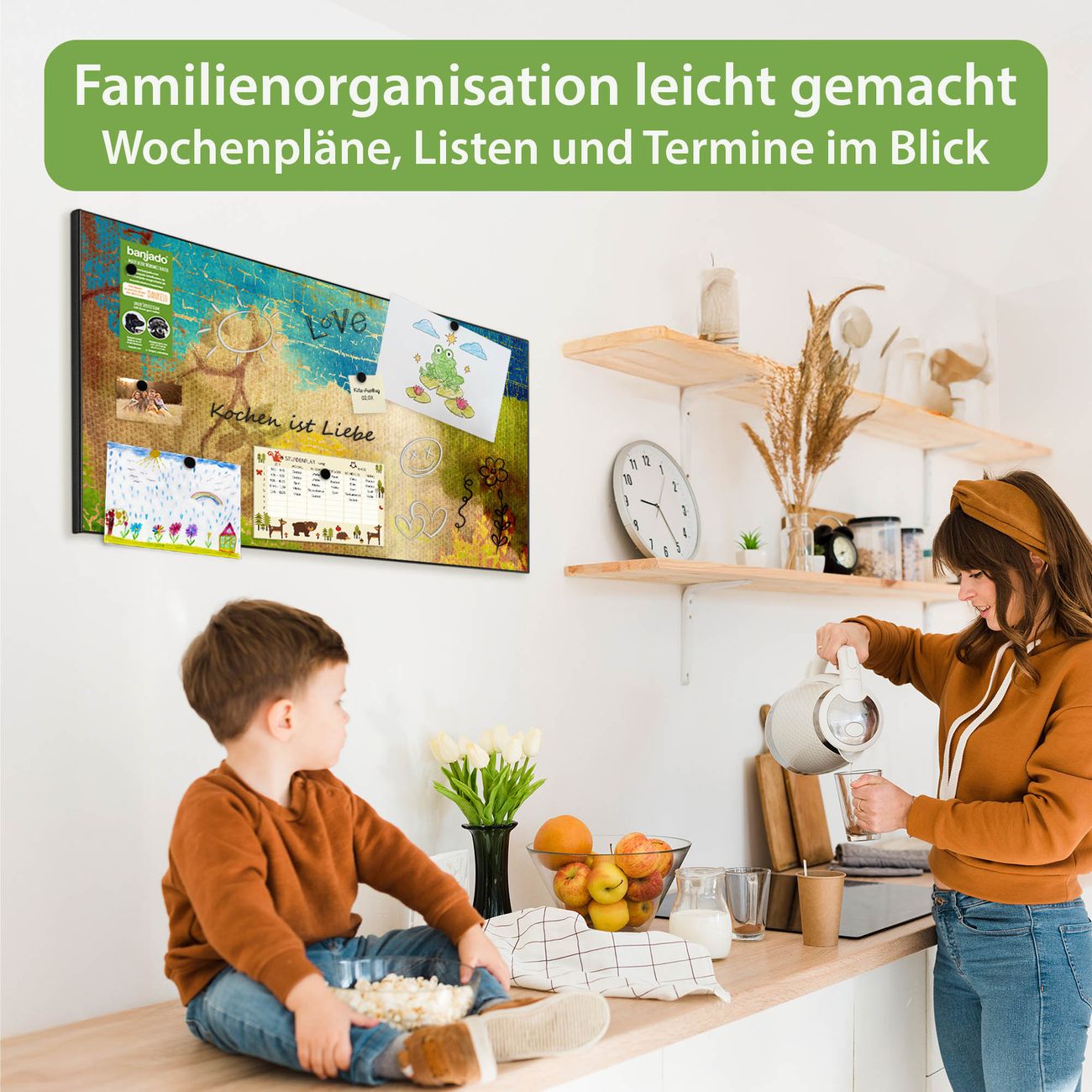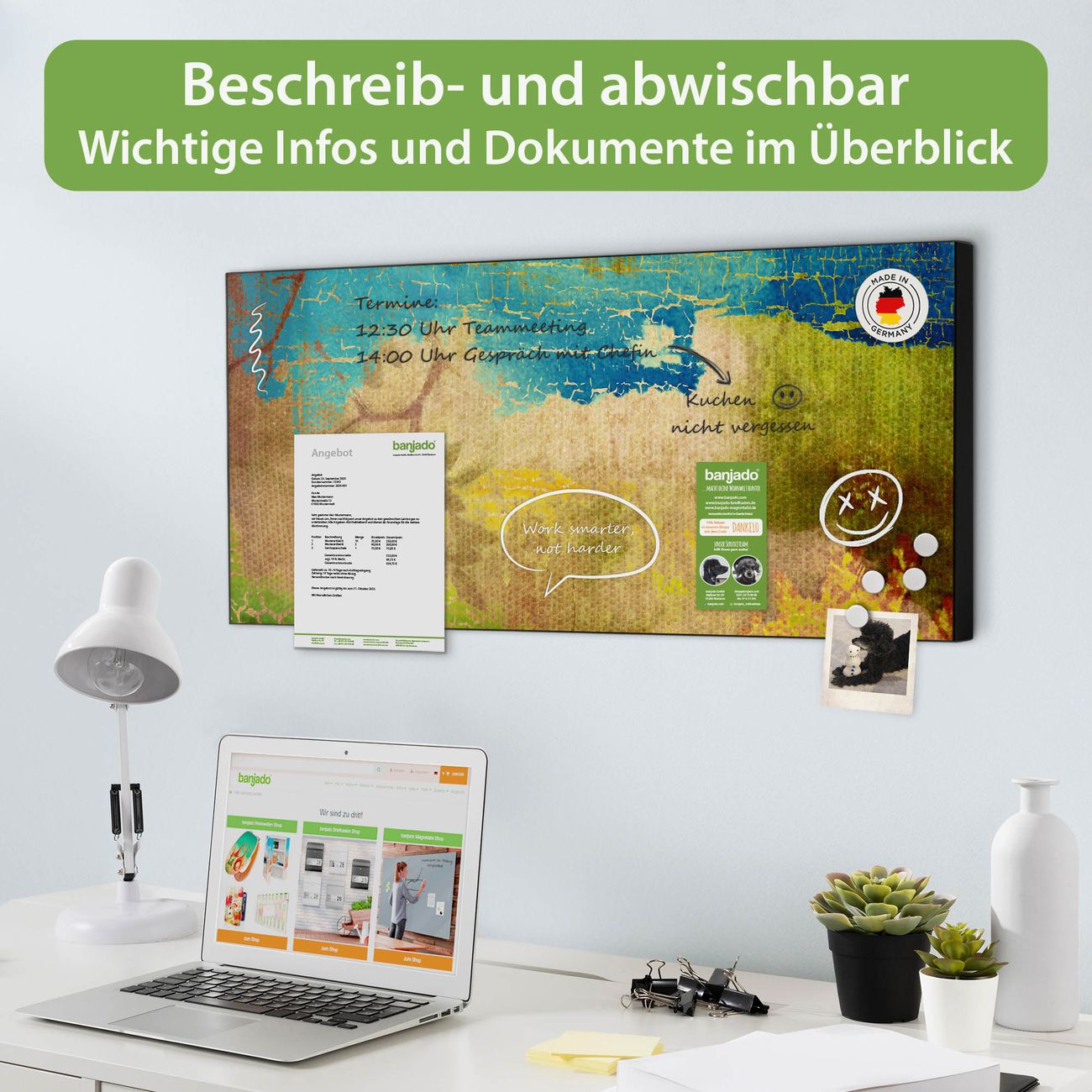 FUNKTION: Die banjado Magnettafel 78x37 cm im Design Motiv Patina vereint Funktionalität und modernes Wohndesign auf stilvolle Weise. Diese hochwertige Magnetwand aus Metall hilft Ihnen dabei, Notizen, Fotos, Termine, Einkaufslisten oder Rezepte übersichtlich zu organisieren. Als praktisches Memoboard sorgt sie für Struktur im Alltag und setzt gleichzeitig einen dekorativen Akzent an Ihrer Wand. DESIGN: Die Metalltafel besteht aus robustem, lackiertem Stahl und ist mit allen handelsüblichen Magneten nutzbar. Besonders praktisch ist die beschreibbare Oberfläche. Sie können die Magnettafel ganz einfach mit Kreidestiften beschriften und die Inhalte bei Bedarf mit einem feuchten Tuch wieder entfernen. So eignet sich das Memoboard ideal für Wochenpläne, Menüpläne, To Do Listen oder kreative Botschaften. DETAILS: Mit ihrem großzügigen Querformat von 78x37 cm bietet die Magnettafel ausreichend Platz für Ihre Organisation. Das Motiv Motiv Patina bringt eine warme, natürliche Optik in Küche, Flur, Büro oder Homeoffice und wirkt auch ohne Magnete oder Beschriftung wie ein modernes Wandbild. NUTZEN: Auf der Rückseite befinden sich vorgefertigte Löcher für eine schnelle und unkomplizierte Wandmontage. Jede banjado Magnettafel wird in Deutschland gefertigt und steht für Qualität, Langlebigkeit und liebevolle Verarbeitung. Dieses beschreibbare Memoboard ist die perfekte Kombination aus Metalltafel, Designobjekt und praktischer Magnetwand für Ihren Alltag. BANJADO: Wir sind ein kleines Team aus dem Herzen von Sachsen. Wir fertigen alle Artikel von Hand für Sie an, Sie erhalten keine preiswerte Importware. Auf Wunsch können Sie auch Ihr eigenes Foto auf die Magnettafel aufbringen, schreiben Sie uns an. Herzlichst, Ihr banjado-Team
