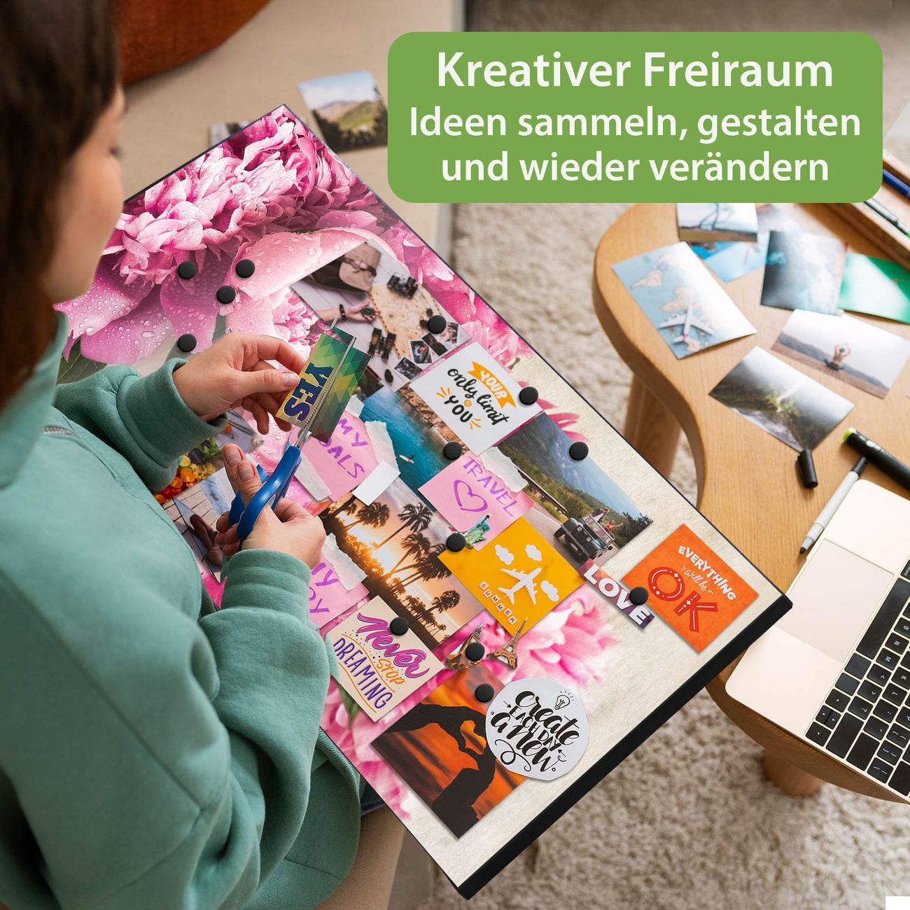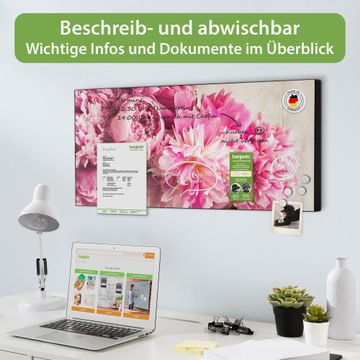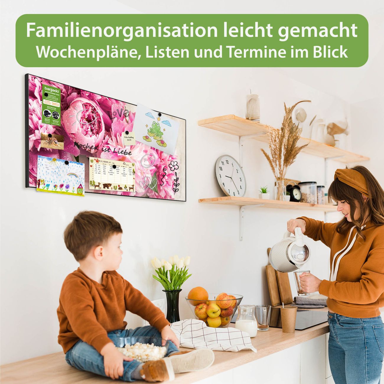 FUNKTION: Die banjado Magnettafel 78x37 cm im Design Motiv Pfingstrose vereint Funktionalität und modernes Wohndesign auf stilvolle Weise. Diese hochwertige Magnetwand aus Metall hilft Ihnen dabei, Notizen, Fotos, Termine, Einkaufslisten oder Rezepte übersichtlich zu organisieren. Als praktisches Memoboard sorgt sie für Struktur im Alltag und setzt gleichzeitig einen dekorativen Akzent an Ihrer Wand. DESIGN: Die Metalltafel besteht aus robustem, lackiertem Stahl und ist mit allen handelsüblichen Magneten nutzbar. Besonders praktisch ist die beschreibbare Oberfläche. Sie können die Magnettafel ganz einfach mit Kreidestiften beschriften und die Inhalte bei Bedarf mit einem feuchten Tuch wieder entfernen. So eignet sich das Memoboard ideal für Wochenpläne, Menüpläne, To Do Listen oder kreative Botschaften. DETAILS: Mit ihrem großzügigen Querformat von 78x37 cm bietet die Magnettafel ausreichend Platz für Ihre Organisation. Das Motiv Motiv Pfingstrose bringt eine warme, natürliche Optik in Küche, Flur, Büro oder Homeoffice und wirkt auch ohne Magnete oder Beschriftung wie ein modernes Wandbild. NUTZEN: Auf der Rückseite befinden sich vorgefertigte Löcher für eine schnelle und unkomplizierte Wandmontage. Jede banjado Magnettafel wird in Deutschland gefertigt und steht für Qualität, Langlebigkeit und liebevolle Verarbeitung. Dieses beschreibbare Memoboard ist die perfekte Kombination aus Metalltafel, Designobjekt und praktischer Magnetwand für Ihren Alltag. BANJADO: Wir sind ein kleines Team aus dem Herzen von Sachsen. Wir fertigen alle Artikel von Hand für Sie an, Sie erhalten keine preiswerte Importware. Auf Wunsch können Sie auch Ihr eigenes Foto auf die Magnettafel aufbringen, schreiben Sie uns an. Herzlichst, Ihr banjado-Team