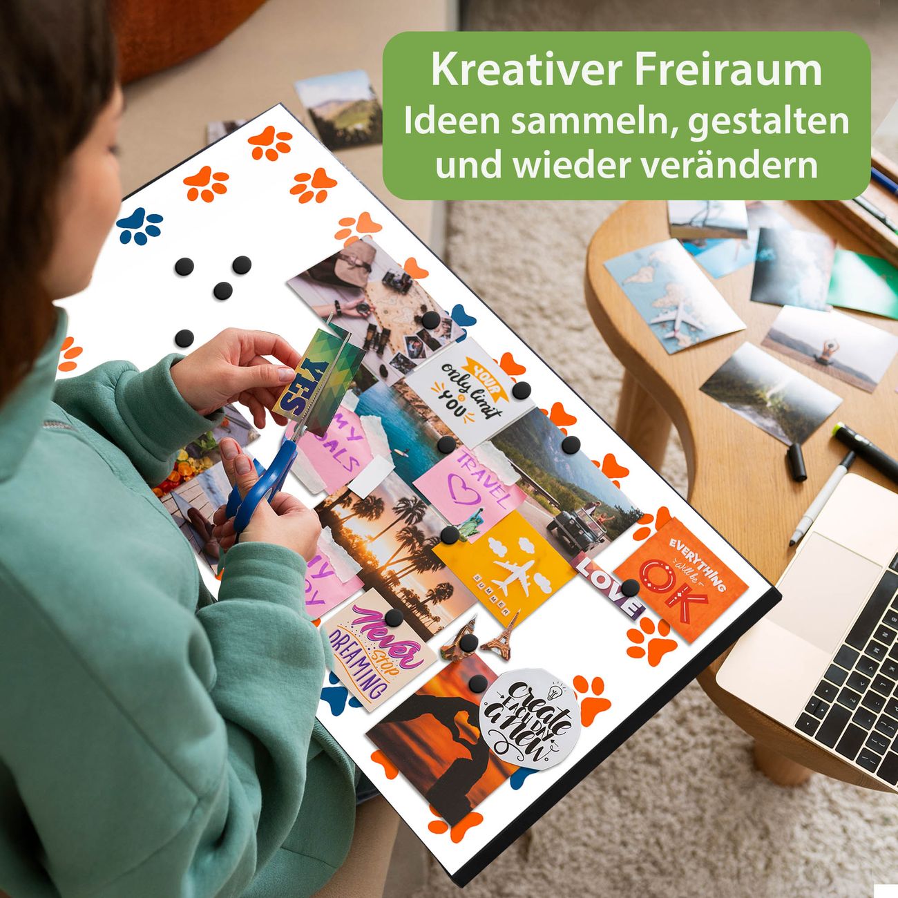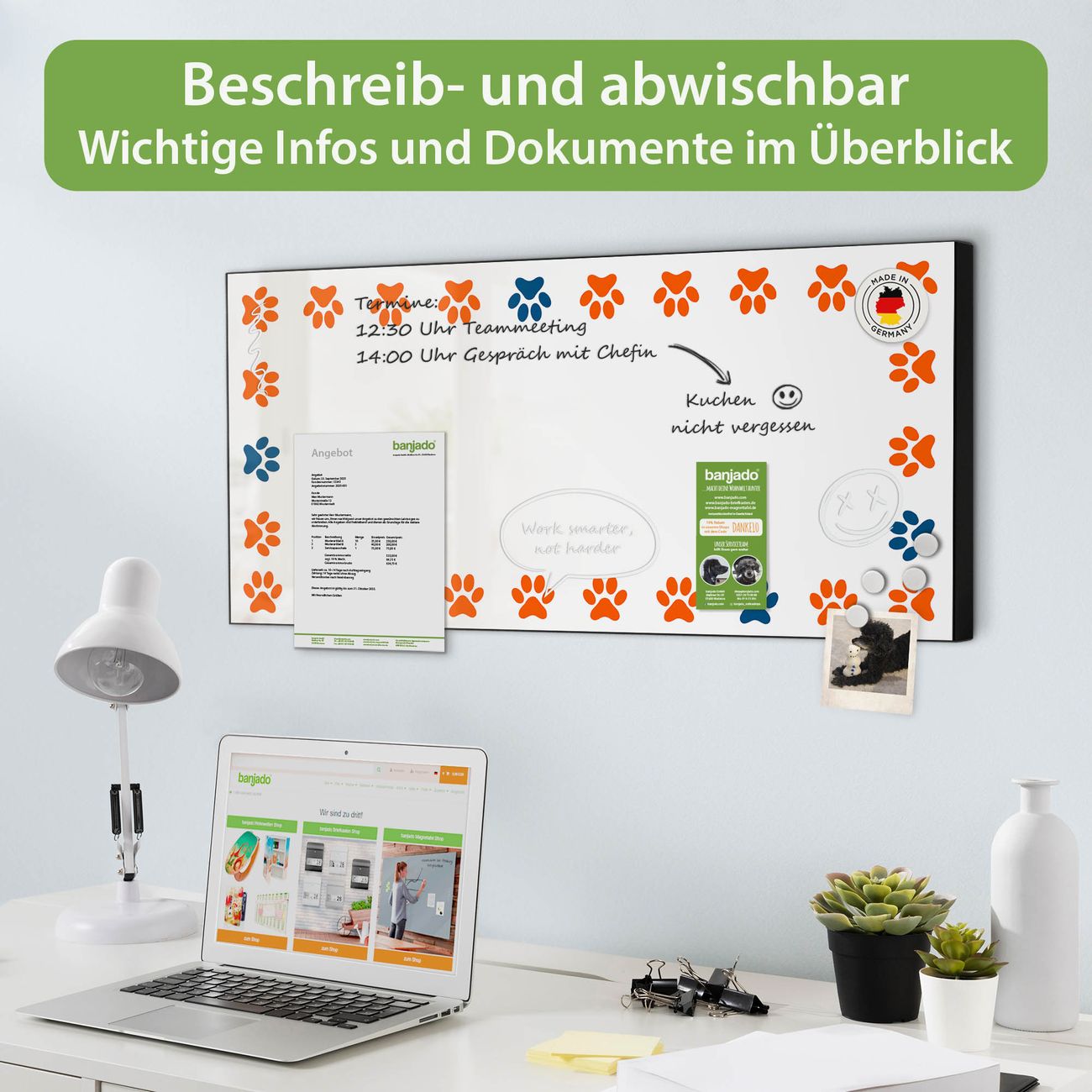 FUNKTION: Die banjado Magnettafel 78x37 cm im Design Motiv Pfotenrahmen vereint Funktionalität und modernes Wohndesign auf stilvolle Weise. Diese hochwertige Magnetwand aus Metall hilft Ihnen dabei, Notizen, Fotos, Termine, Einkaufslisten oder Rezepte übersichtlich zu organisieren. Als praktisches Memoboard sorgt sie für Struktur im Alltag und setzt gleichzeitig einen dekorativen Akzent an Ihrer Wand. DESIGN: Die Metalltafel besteht aus robustem, lackiertem Stahl und ist mit allen handelsüblichen Magneten nutzbar. Besonders praktisch ist die beschreibbare Oberfläche. Sie können die Magnettafel ganz einfach mit Kreidestiften beschriften und die Inhalte bei Bedarf mit einem feuchten Tuch wieder entfernen. So eignet sich das Memoboard ideal für Wochenpläne, Menüpläne, To Do Listen oder kreative Botschaften. DETAILS: Mit ihrem großzügigen Querformat von 78x37 cm bietet die Magnettafel ausreichend Platz für Ihre Organisation. Das Motiv Motiv Pfotenrahmen bringt eine warme, natürliche Optik in Küche, Flur, Büro oder Homeoffice und wirkt auch ohne Magnete oder Beschriftung wie ein modernes Wandbild. NUTZEN: Auf der Rückseite befinden sich vorgefertigte Löcher für eine schnelle und unkomplizierte Wandmontage. Jede banjado Magnettafel wird in Deutschland gefertigt und steht für Qualität, Langlebigkeit und liebevolle Verarbeitung. Dieses beschreibbare Memoboard ist die perfekte Kombination aus Metalltafel, Designobjekt und praktischer Magnetwand für Ihren Alltag. BANJADO: Wir sind ein kleines Team aus dem Herzen von Sachsen. Wir fertigen alle Artikel von Hand für Sie an, Sie erhalten keine preiswerte Importware. Auf Wunsch können Sie auch Ihr eigenes Foto auf die Magnettafel aufbringen, schreiben Sie uns an. Herzlichst, Ihr banjado-Team