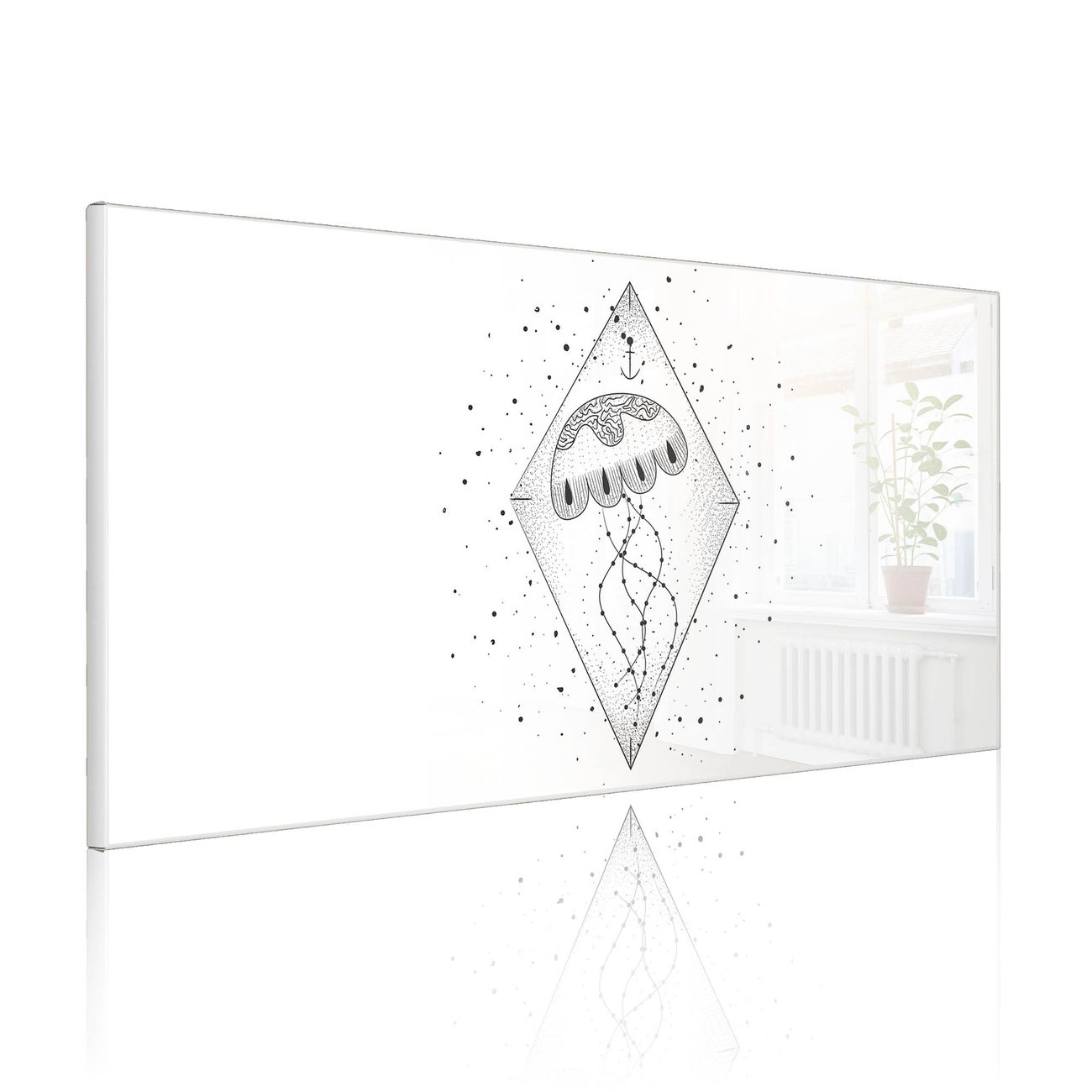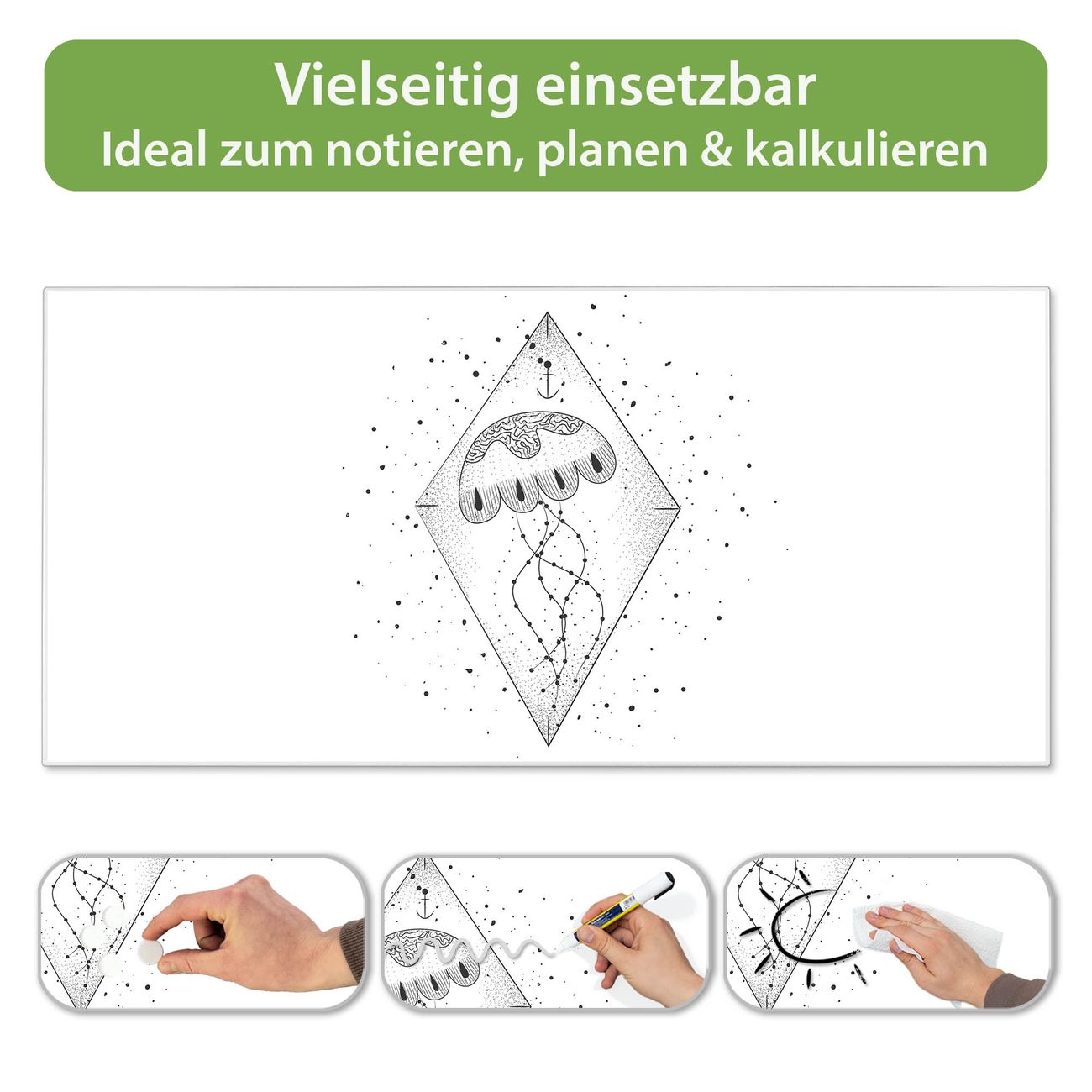FUNKTION: Die banjado Magnettafel 78x37 cm im Design Motiv Quallenprisma 2 vereint Funktionalität und modernes Wohndesign auf stilvolle Weise. Diese hochwertige Magnetwand aus Metall hilft Ihnen dabei, Notizen, Fotos, Termine, Einkaufslisten oder Rezepte übersichtlich zu organisieren. Als praktisches Memoboard sorgt sie für Struktur im Alltag und setzt gleichzeitig einen dekorativen Akzent an Ihrer Wand. DESIGN: Die Metalltafel besteht aus robustem, lackiertem Stahl und ist mit allen handelsüblichen Magneten nutzbar. Besonders praktisch ist die beschreibbare Oberfläche. Sie können die Magnettafel ganz einfach mit Kreidestiften beschriften und die Inhalte bei Bedarf mit einem feuchten Tuch wieder entfernen. So eignet sich das Memoboard ideal für Wochenpläne, Menüpläne, To Do Listen oder kreative Botschaften. DETAILS: Mit ihrem großzügigen Querformat von 78x37 cm bietet die Magnettafel ausreichend Platz für Ihre Organisation. Das Motiv Motiv Quallenprisma 2 bringt eine warme, natürliche Optik in Küche, Flur, Büro oder Homeoffice und wirkt auch ohne Magnete oder Beschriftung wie ein modernes Wandbild. NUTZEN: Auf der Rückseite befinden sich vorgefertigte Löcher für eine schnelle und unkomplizierte Wandmontage. Jede banjado Magnettafel wird in Deutschland gefertigt und steht für Qualität, Langlebigkeit und liebevolle Verarbeitung. Dieses beschreibbare Memoboard ist die perfekte Kombination aus Metalltafel, Designobjekt und praktischer Magnetwand für Ihren Alltag. BANJADO: Wir sind ein kleines Team aus dem Herzen von Sachsen. Wir fertigen alle Artikel von Hand für Sie an, Sie erhalten keine preiswerte Importware. Auf Wunsch können Sie auch Ihr eigenes Foto auf die Magnettafel aufbringen, schreiben Sie uns an. Herzlichst, Ihr banjado-Team