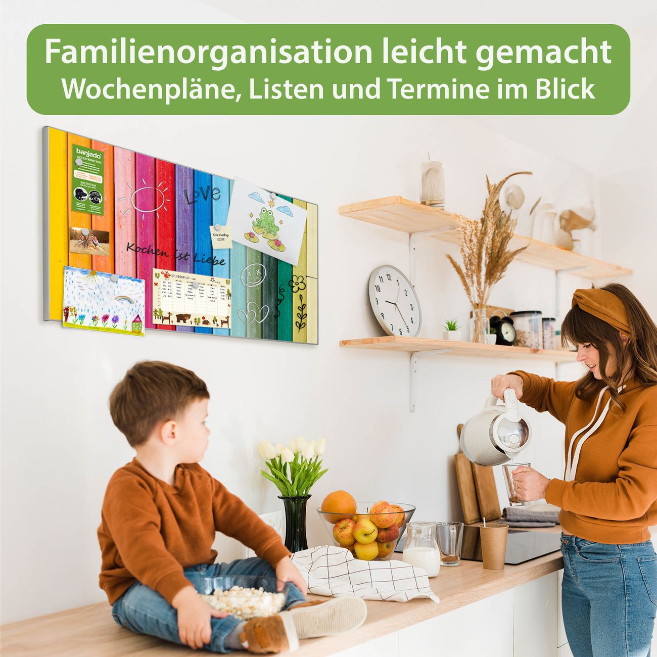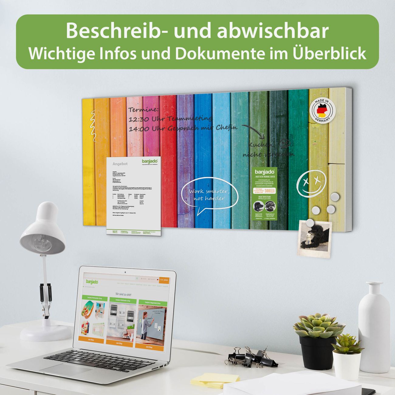 FUNKTION: Die banjado Magnettafel 78x37 cm im Design Motiv Regenbogenfarben vereint Funktionalität und modernes Wohndesign auf stilvolle Weise. Diese hochwertige Magnetwand aus Metall hilft Ihnen dabei, Notizen, Fotos, Termine, Einkaufslisten oder Rezepte übersichtlich zu organisieren. Als praktisches Memoboard sorgt sie für Struktur im Alltag und setzt gleichzeitig einen dekorativen Akzent an Ihrer Wand. DESIGN: Die Metalltafel besteht aus robustem, lackiertem Stahl und ist mit allen handelsüblichen Magneten nutzbar. Besonders praktisch ist die beschreibbare Oberfläche. Sie können die Magnettafel ganz einfach mit Kreidestiften beschriften und die Inhalte bei Bedarf mit einem feuchten Tuch wieder entfernen. So eignet sich das Memoboard ideal für Wochenpläne, Menüpläne, To Do Listen oder kreative Botschaften. DETAILS: Mit ihrem großzügigen Querformat von 78x37 cm bietet die Magnettafel ausreichend Platz für Ihre Organisation. Das Motiv Motiv Regenbogenfarben bringt eine warme, natürliche Optik in Küche, Flur, Büro oder Homeoffice und wirkt auch ohne Magnete oder Beschriftung wie ein modernes Wandbild. NUTZEN: Auf der Rückseite befinden sich vorgefertigte Löcher für eine schnelle und unkomplizierte Wandmontage. Jede banjado Magnettafel wird in Deutschland gefertigt und steht für Qualität, Langlebigkeit und liebevolle Verarbeitung. Dieses beschreibbare Memoboard ist die perfekte Kombination aus Metalltafel, Designobjekt und praktischer Magnetwand für Ihren Alltag. BANJADO: Wir sind ein kleines Team aus dem Herzen von Sachsen. Wir fertigen alle Artikel von Hand für Sie an, Sie erhalten keine preiswerte Importware. Auf Wunsch können Sie auch Ihr eigenes Foto auf die Magnettafel aufbringen, schreiben Sie uns an. Herzlichst, Ihr banjado-Team