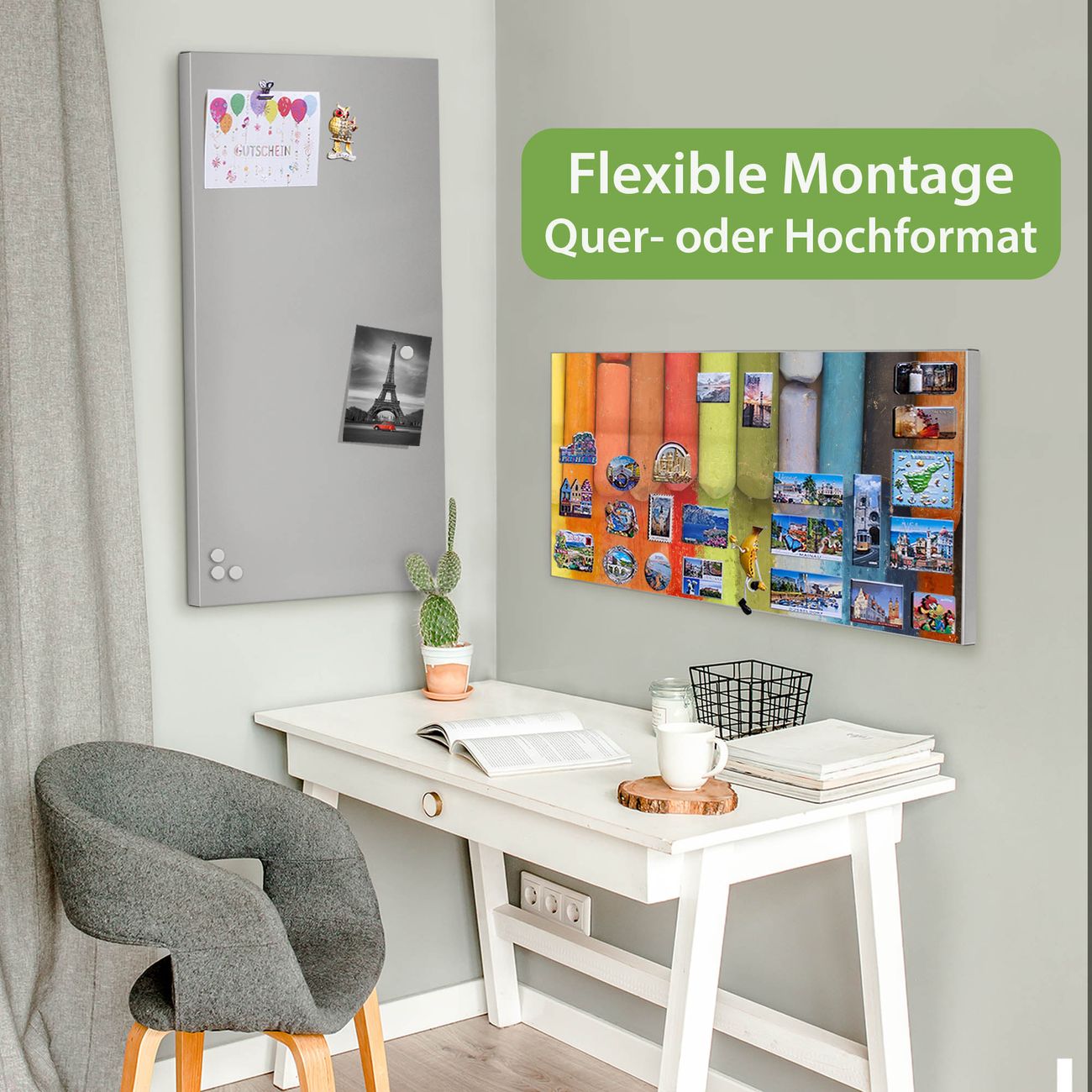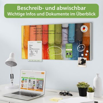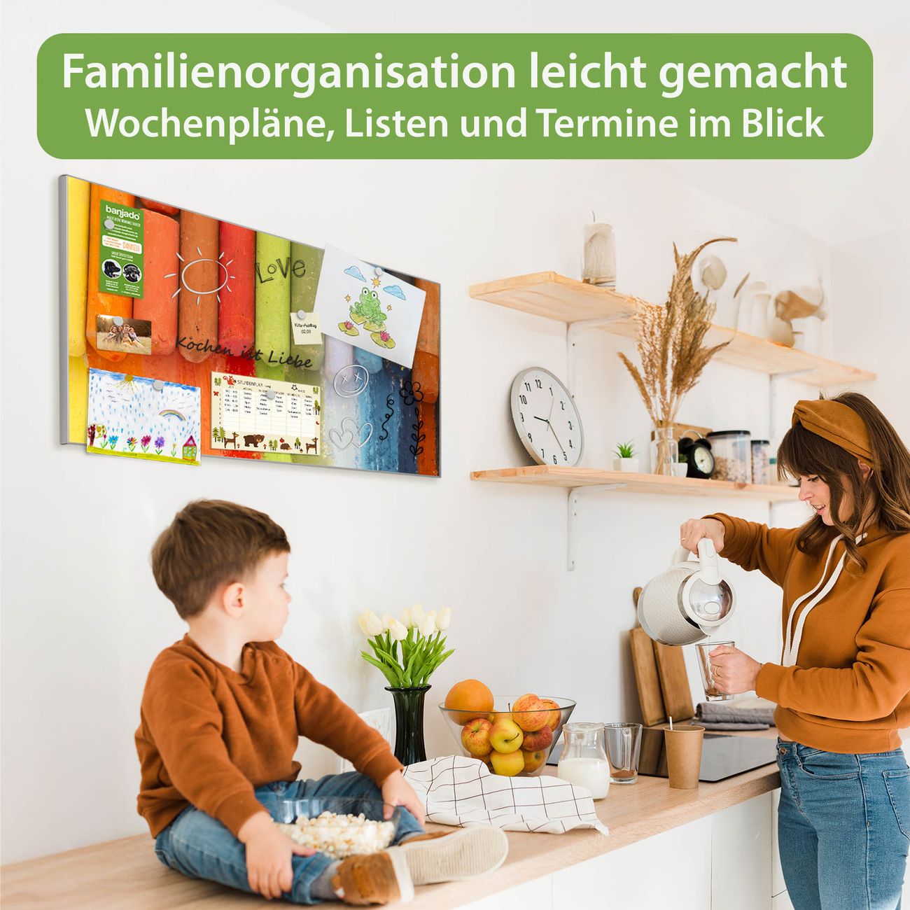 FUNKTION: Die banjado Magnettafel 78x37 cm im Design Motiv Regenbogenkreide vereint Funktionalität und modernes Wohndesign auf stilvolle Weise. Diese hochwertige Magnetwand aus Metall hilft Ihnen dabei, Notizen, Fotos, Termine, Einkaufslisten oder Rezepte übersichtlich zu organisieren. Als praktisches Memoboard sorgt sie für Struktur im Alltag und setzt gleichzeitig einen dekorativen Akzent an Ihrer Wand. DESIGN: Die Metalltafel besteht aus robustem, lackiertem Stahl und ist mit allen handelsüblichen Magneten nutzbar. Besonders praktisch ist die beschreibbare Oberfläche. Sie können die Magnettafel ganz einfach mit Kreidestiften beschriften und die Inhalte bei Bedarf mit einem feuchten Tuch wieder entfernen. So eignet sich das Memoboard ideal für Wochenpläne, Menüpläne, To Do Listen oder kreative Botschaften. DETAILS: Mit ihrem großzügigen Querformat von 78x37 cm bietet die Magnettafel ausreichend Platz für Ihre Organisation. Das Motiv Motiv Regenbogenkreide bringt eine warme, natürliche Optik in Küche, Flur, Büro oder Homeoffice und wirkt auch ohne Magnete oder Beschriftung wie ein modernes Wandbild. NUTZEN: Auf der Rückseite befinden sich vorgefertigte Löcher für eine schnelle und unkomplizierte Wandmontage. Jede banjado Magnettafel wird in Deutschland gefertigt und steht für Qualität, Langlebigkeit und liebevolle Verarbeitung. Dieses beschreibbare Memoboard ist die perfekte Kombination aus Metalltafel, Designobjekt und praktischer Magnetwand für Ihren Alltag. BANJADO: Wir sind ein kleines Team aus dem Herzen von Sachsen. Wir fertigen alle Artikel von Hand für Sie an, Sie erhalten keine preiswerte Importware. Auf Wunsch können Sie auch Ihr eigenes Foto auf die Magnettafel aufbringen, schreiben Sie uns an. Herzlichst, Ihr banjado-Team