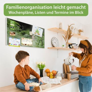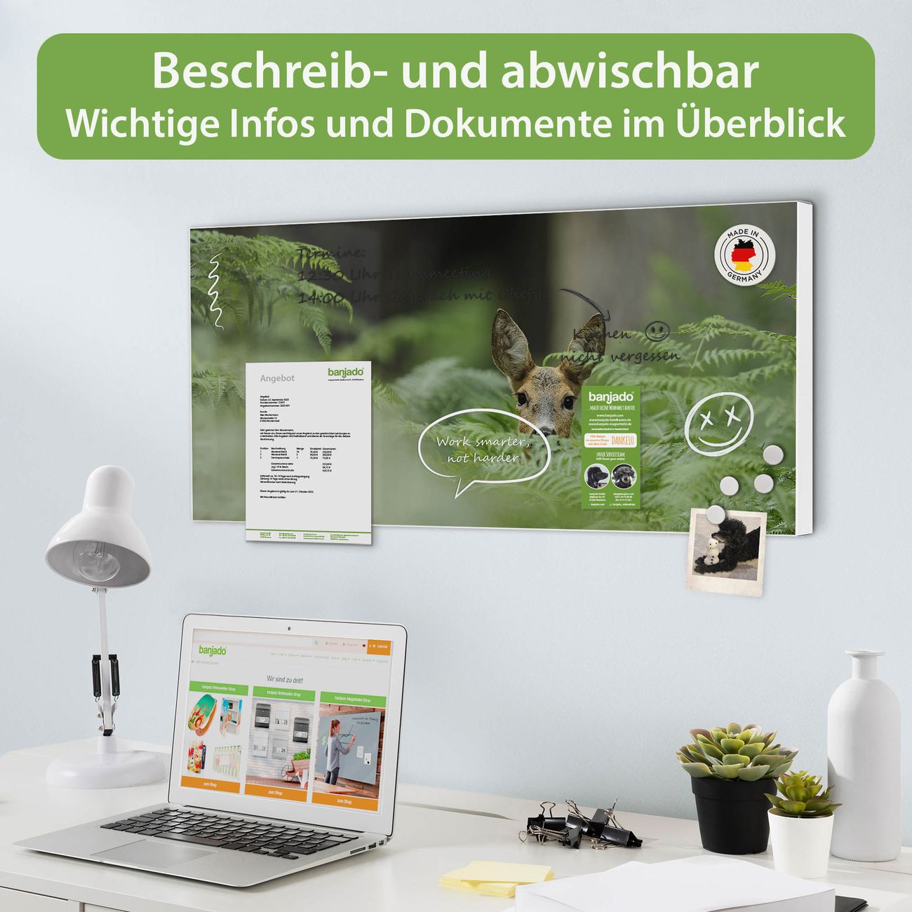 FUNKTION: Die banjado Magnettafel 78x37 cm im Design Motiv Reh vereint Funktionalität und modernes Wohndesign auf stilvolle Weise. Diese hochwertige Magnetwand aus Metall hilft Ihnen dabei, Notizen, Fotos, Termine, Einkaufslisten oder Rezepte übersichtlich zu organisieren. Als praktisches Memoboard sorgt sie für Struktur im Alltag und setzt gleichzeitig einen dekorativen Akzent an Ihrer Wand. DESIGN: Die Metalltafel besteht aus robustem, lackiertem Stahl und ist mit allen handelsüblichen Magneten nutzbar. Besonders praktisch ist die beschreibbare Oberfläche. Sie können die Magnettafel ganz einfach mit Kreidestiften beschriften und die Inhalte bei Bedarf mit einem feuchten Tuch wieder entfernen. So eignet sich das Memoboard ideal für Wochenpläne, Menüpläne, To Do Listen oder kreative Botschaften. DETAILS: Mit ihrem großzügigen Querformat von 78x37 cm bietet die Magnettafel ausreichend Platz für Ihre Organisation. Das Motiv Motiv Reh bringt eine warme, natürliche Optik in Küche, Flur, Büro oder Homeoffice und wirkt auch ohne Magnete oder Beschriftung wie ein modernes Wandbild. NUTZEN: Auf der Rückseite befinden sich vorgefertigte Löcher für eine schnelle und unkomplizierte Wandmontage. Jede banjado Magnettafel wird in Deutschland gefertigt und steht für Qualität, Langlebigkeit und liebevolle Verarbeitung. Dieses beschreibbare Memoboard ist die perfekte Kombination aus Metalltafel, Designobjekt und praktischer Magnetwand für Ihren Alltag. BANJADO: Wir sind ein kleines Team aus dem Herzen von Sachsen. Wir fertigen alle Artikel von Hand für Sie an, Sie erhalten keine preiswerte Importware. Auf Wunsch können Sie auch Ihr eigenes Foto auf die Magnettafel aufbringen, schreiben Sie uns an. Herzlichst, Ihr banjado-Team