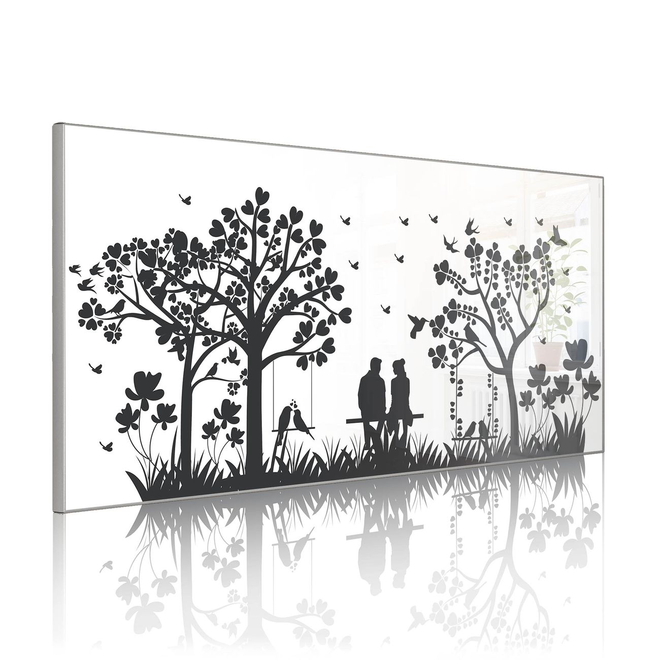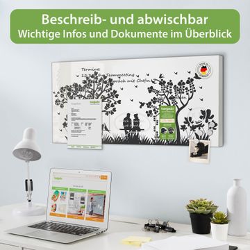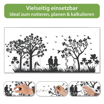 FUNKTION: Die banjado Magnettafel 78x37 cm im Design Motiv Romantische Silhouette im Park vereint Funktionalität und modernes Wohndesign auf stilvolle Weise. Diese hochwertige Magnetwand aus Metall hilft Ihnen dabei, Notizen, Fotos, Termine, Einkaufslisten oder Rezepte übersichtlich zu organisieren. Als praktisches Memoboard sorgt sie für Struktur im Alltag und setzt gleichzeitig einen dekorativen Akzent an Ihrer Wand. DESIGN: Die Metalltafel besteht aus robustem, lackiertem Stahl und ist mit allen handelsüblichen Magneten nutzbar. Besonders praktisch ist die beschreibbare Oberfläche. Sie können die Magnettafel ganz einfach mit Kreidestiften beschriften und die Inhalte bei Bedarf mit einem feuchten Tuch wieder entfernen. So eignet sich das Memoboard ideal für Wochenpläne, Menüpläne, To Do Listen oder kreative Botschaften. DETAILS: Mit ihrem großzügigen Querformat von 78x37 cm bietet die Magnettafel ausreichend Platz für Ihre Organisation. Das Motiv Motiv Romantische Silhouette im Park bringt eine warme, natürliche Optik in Küche, Flur, Büro oder Homeoffice und wirkt auch ohne Magnete oder Beschriftung wie ein modernes Wandbild. NUTZEN: Auf der Rückseite befinden sich vorgefertigte Löcher für eine schnelle und unkomplizierte Wandmontage. Jede banjado Magnettafel wird in Deutschland gefertigt und steht für Qualität, Langlebigkeit und liebevolle Verarbeitung. Dieses beschreibbare Memoboard ist die perfekte Kombination aus Metalltafel, Designobjekt und praktischer Magnetwand für Ihren Alltag. BANJADO: Wir sind ein kleines Team aus dem Herzen von Sachsen. Wir fertigen alle Artikel von Hand für Sie an, Sie erhalten keine preiswerte Importware. Auf Wunsch können Sie auch Ihr eigenes Foto auf die Magnettafel aufbringen, schreiben Sie uns an. Herzlichst, Ihr banjado-Team
