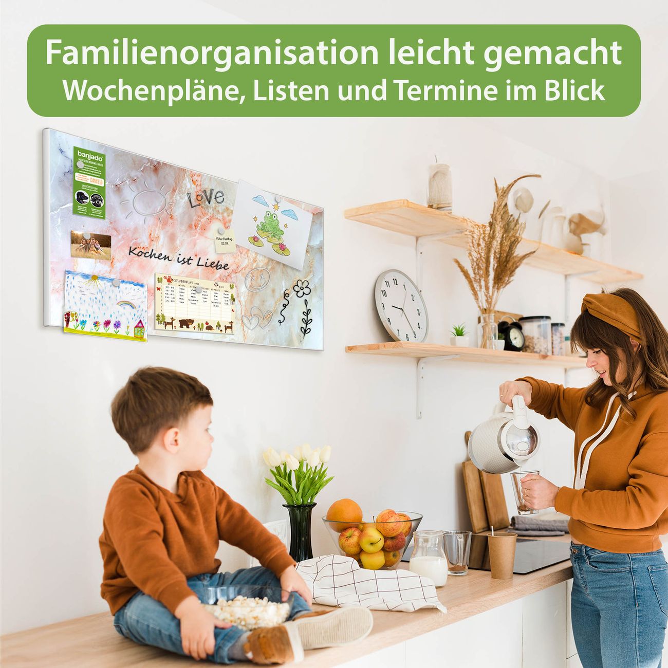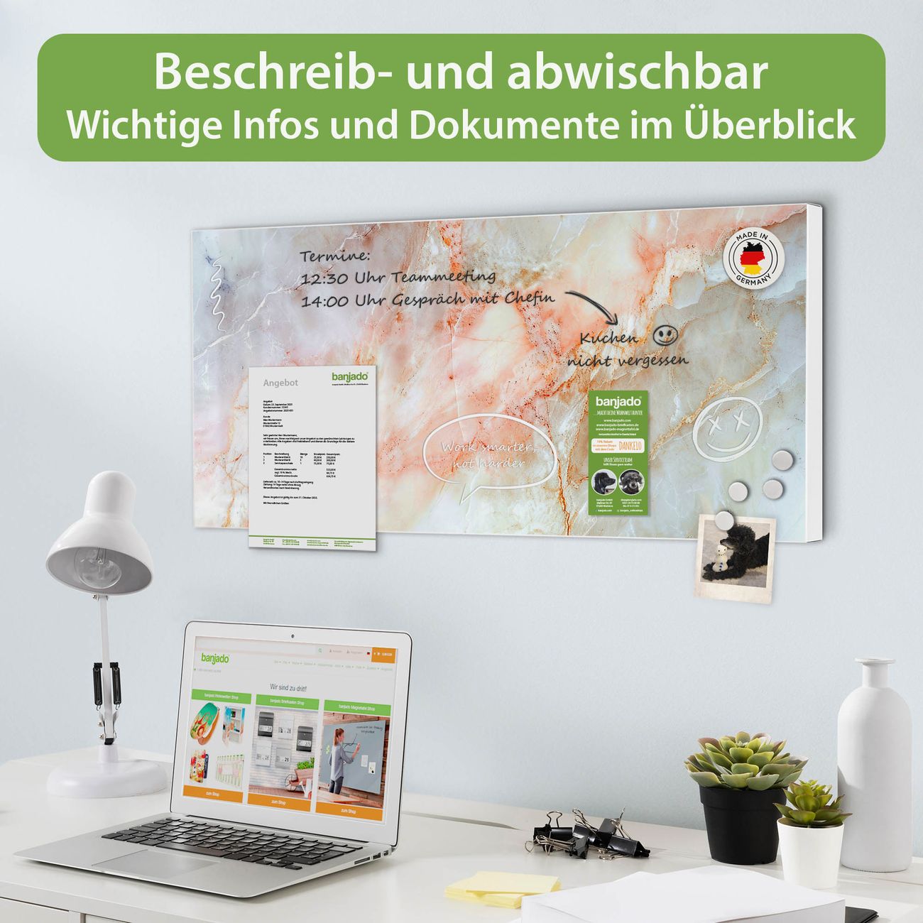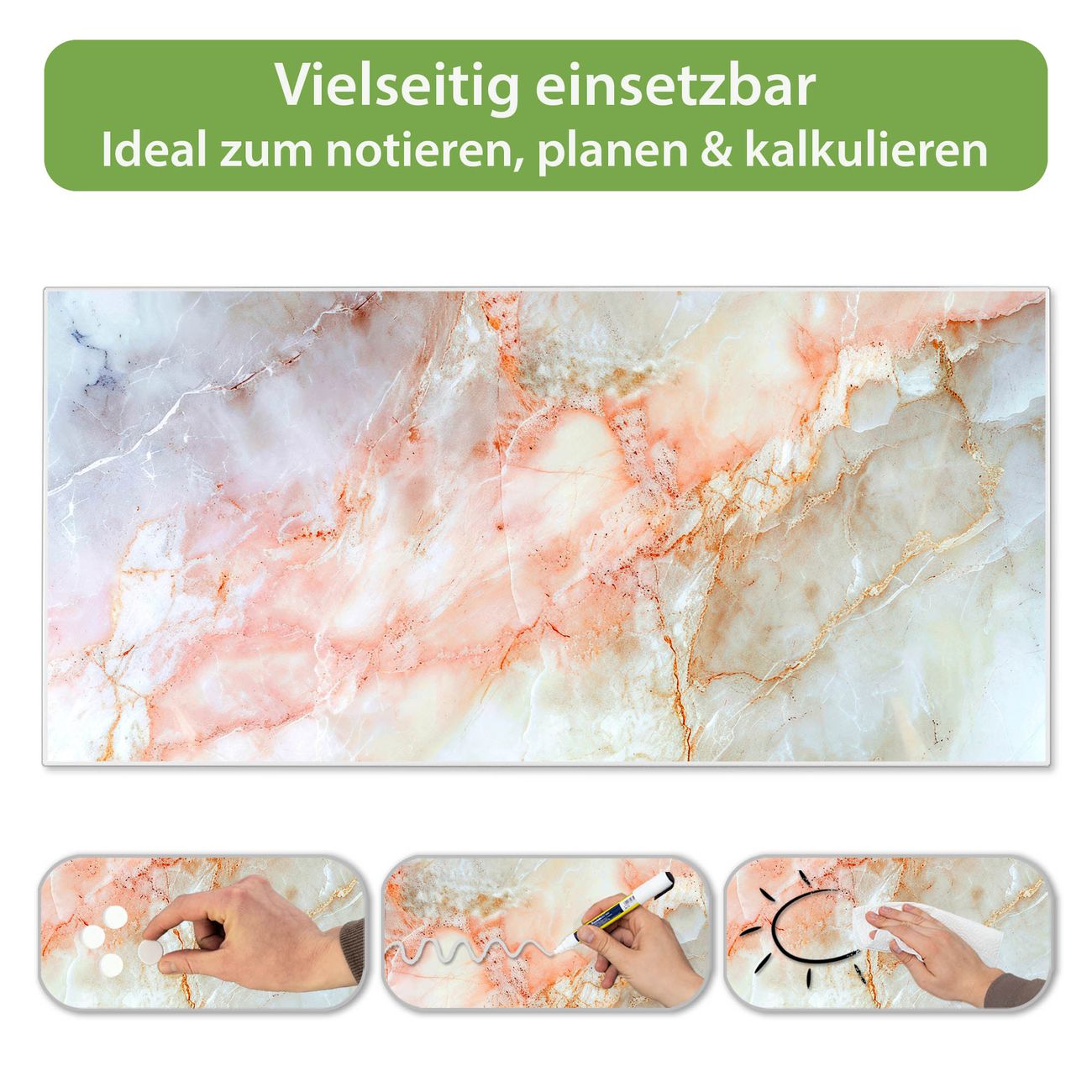 FUNKTION: Die banjado Magnettafel 78x37 cm im Design Motiv Rosa Marmor vereint Funktionalität und modernes Wohndesign auf stilvolle Weise. Diese hochwertige Magnetwand aus Metall hilft Ihnen dabei, Notizen, Fotos, Termine, Einkaufslisten oder Rezepte übersichtlich zu organisieren. Als praktisches Memoboard sorgt sie für Struktur im Alltag und setzt gleichzeitig einen dekorativen Akzent an Ihrer Wand. DESIGN: Die Metalltafel besteht aus robustem, lackiertem Stahl und ist mit allen handelsüblichen Magneten nutzbar. Besonders praktisch ist die beschreibbare Oberfläche. Sie können die Magnettafel ganz einfach mit Kreidestiften beschriften und die Inhalte bei Bedarf mit einem feuchten Tuch wieder entfernen. So eignet sich das Memoboard ideal für Wochenpläne, Menüpläne, To Do Listen oder kreative Botschaften. DETAILS: Mit ihrem großzügigen Querformat von 78x37 cm bietet die Magnettafel ausreichend Platz für Ihre Organisation. Das Motiv Motiv Rosa Marmor bringt eine warme, natürliche Optik in Küche, Flur, Büro oder Homeoffice und wirkt auch ohne Magnete oder Beschriftung wie ein modernes Wandbild. NUTZEN: Auf der Rückseite befinden sich vorgefertigte Löcher für eine schnelle und unkomplizierte Wandmontage. Jede banjado Magnettafel wird in Deutschland gefertigt und steht für Qualität, Langlebigkeit und liebevolle Verarbeitung. Dieses beschreibbare Memoboard ist die perfekte Kombination aus Metalltafel, Designobjekt und praktischer Magnetwand für Ihren Alltag. BANJADO: Wir sind ein kleines Team aus dem Herzen von Sachsen. Wir fertigen alle Artikel von Hand für Sie an, Sie erhalten keine preiswerte Importware. Auf Wunsch können Sie auch Ihr eigenes Foto auf die Magnettafel aufbringen, schreiben Sie uns an. Herzlichst, Ihr banjado-Team