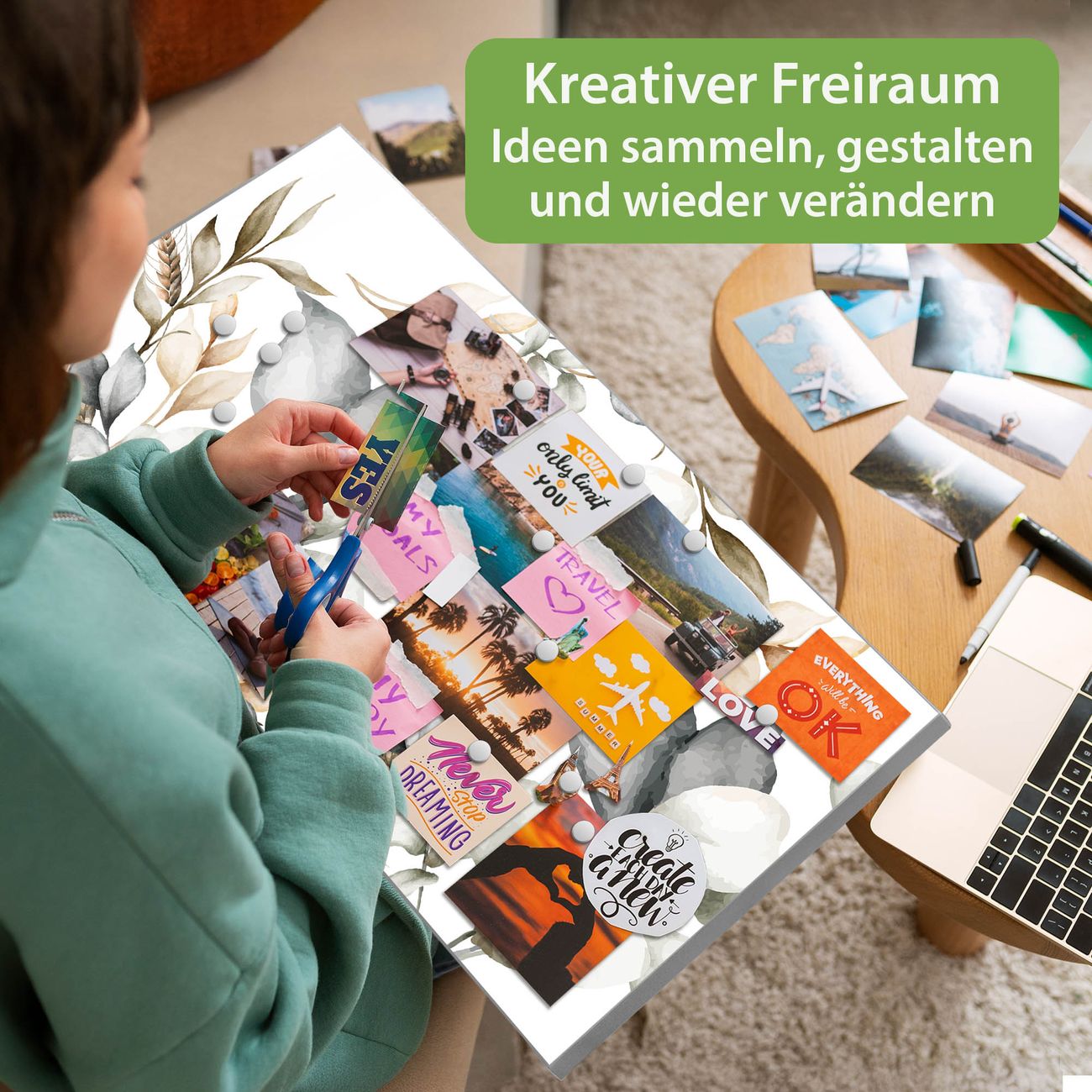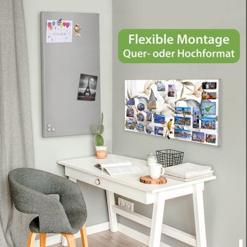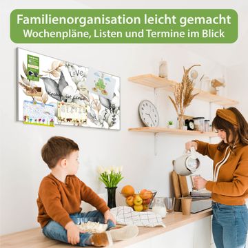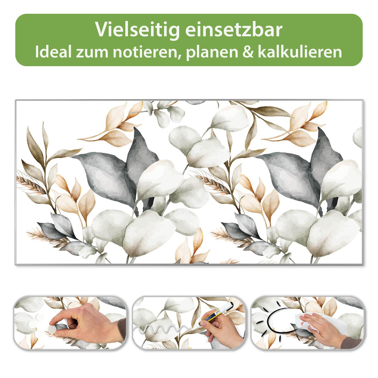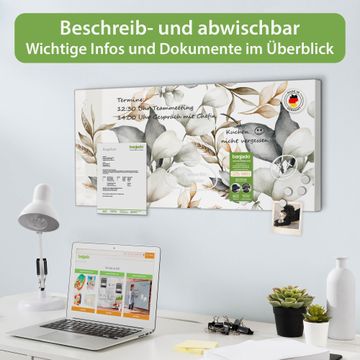 FUNKTION: Die banjado Magnettafel 78x37 cm im Design Motiv Sanfte Blätter vereint Funktionalität und modernes Wohndesign auf stilvolle Weise. Diese hochwertige Magnetwand aus Metall hilft Ihnen dabei, Notizen, Fotos, Termine, Einkaufslisten oder Rezepte übersichtlich zu organisieren. Als praktisches Memoboard sorgt sie für Struktur im Alltag und setzt gleichzeitig einen dekorativen Akzent an Ihrer Wand. DESIGN: Die Metalltafel besteht aus robustem, lackiertem Stahl und ist mit allen handelsüblichen Magneten nutzbar. Besonders praktisch ist die beschreibbare Oberfläche. Sie können die Magnettafel ganz einfach mit Kreidestiften beschriften und die Inhalte bei Bedarf mit einem feuchten Tuch wieder entfernen. So eignet sich das Memoboard ideal für Wochenpläne, Menüpläne, To Do Listen oder kreative Botschaften. DETAILS: Mit ihrem großzügigen Querformat von 78x37 cm bietet die Magnettafel ausreichend Platz für Ihre Organisation. Das Motiv Motiv Sanfte Blätter bringt eine warme, natürliche Optik in Küche, Flur, Büro oder Homeoffice und wirkt auch ohne Magnete oder Beschriftung wie ein modernes Wandbild. NUTZEN: Auf der Rückseite befinden sich vorgefertigte Löcher für eine schnelle und unkomplizierte Wandmontage. Jede banjado Magnettafel wird in Deutschland gefertigt und steht für Qualität, Langlebigkeit und liebevolle Verarbeitung. Dieses beschreibbare Memoboard ist die perfekte Kombination aus Metalltafel, Designobjekt und praktischer Magnetwand für Ihren Alltag. BANJADO: Wir sind ein kleines Team aus dem Herzen von Sachsen. Wir fertigen alle Artikel von Hand für Sie an, Sie erhalten keine preiswerte Importware. Auf Wunsch können Sie auch Ihr eigenes Foto auf die Magnettafel aufbringen, schreiben Sie uns an. Herzlichst, Ihr banjado-Team