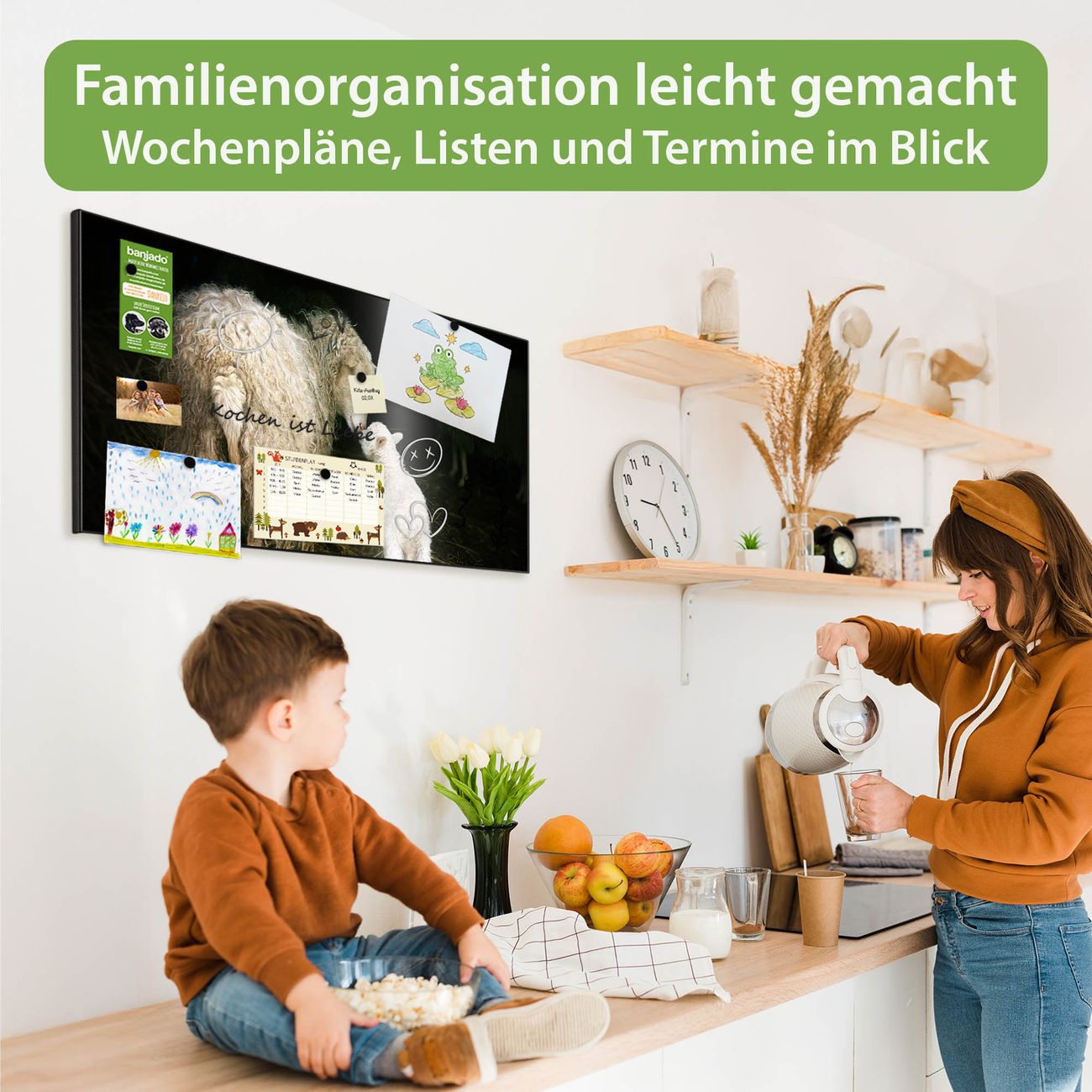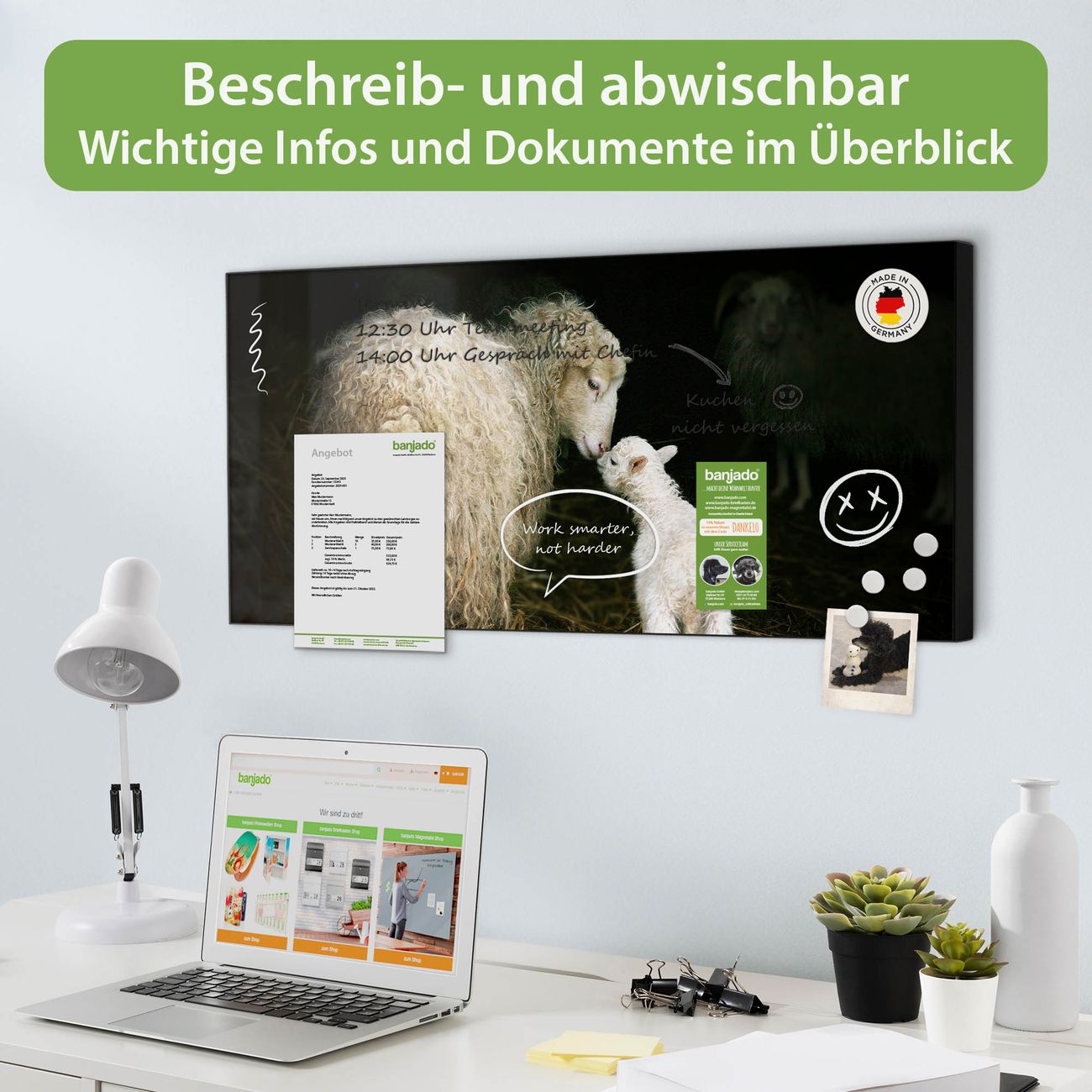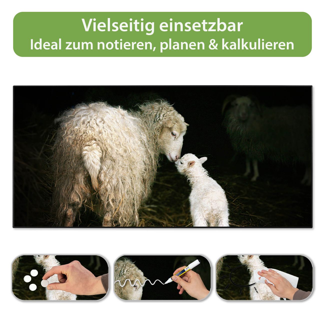 FUNKTION: Die banjado Magnettafel 78x37 cm im Design Motiv Schaf Und Lamm vereint Funktionalität und modernes Wohndesign auf stilvolle Weise. Diese hochwertige Magnetwand aus Metall hilft Ihnen dabei, Notizen, Fotos, Termine, Einkaufslisten oder Rezepte übersichtlich zu organisieren. Als praktisches Memoboard sorgt sie für Struktur im Alltag und setzt gleichzeitig einen dekorativen Akzent an Ihrer Wand. DESIGN: Die Metalltafel besteht aus robustem, lackiertem Stahl und ist mit allen handelsüblichen Magneten nutzbar. Besonders praktisch ist die beschreibbare Oberfläche. Sie können die Magnettafel ganz einfach mit Kreidestiften beschriften und die Inhalte bei Bedarf mit einem feuchten Tuch wieder entfernen. So eignet sich das Memoboard ideal für Wochenpläne, Menüpläne, To Do Listen oder kreative Botschaften. DETAILS: Mit ihrem großzügigen Querformat von 78x37 cm bietet die Magnettafel ausreichend Platz für Ihre Organisation. Das Motiv Motiv Schaf Und Lamm bringt eine warme, natürliche Optik in Küche, Flur, Büro oder Homeoffice und wirkt auch ohne Magnete oder Beschriftung wie ein modernes Wandbild. NUTZEN: Auf der Rückseite befinden sich vorgefertigte Löcher für eine schnelle und unkomplizierte Wandmontage. Jede banjado Magnettafel wird in Deutschland gefertigt und steht für Qualität, Langlebigkeit und liebevolle Verarbeitung. Dieses beschreibbare Memoboard ist die perfekte Kombination aus Metalltafel, Designobjekt und praktischer Magnetwand für Ihren Alltag. BANJADO: Wir sind ein kleines Team aus dem Herzen von Sachsen. Wir fertigen alle Artikel von Hand für Sie an, Sie erhalten keine preiswerte Importware. Auf Wunsch können Sie auch Ihr eigenes Foto auf die Magnettafel aufbringen, schreiben Sie uns an. Herzlichst, Ihr banjado-Team
