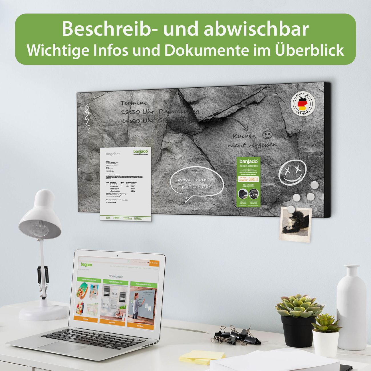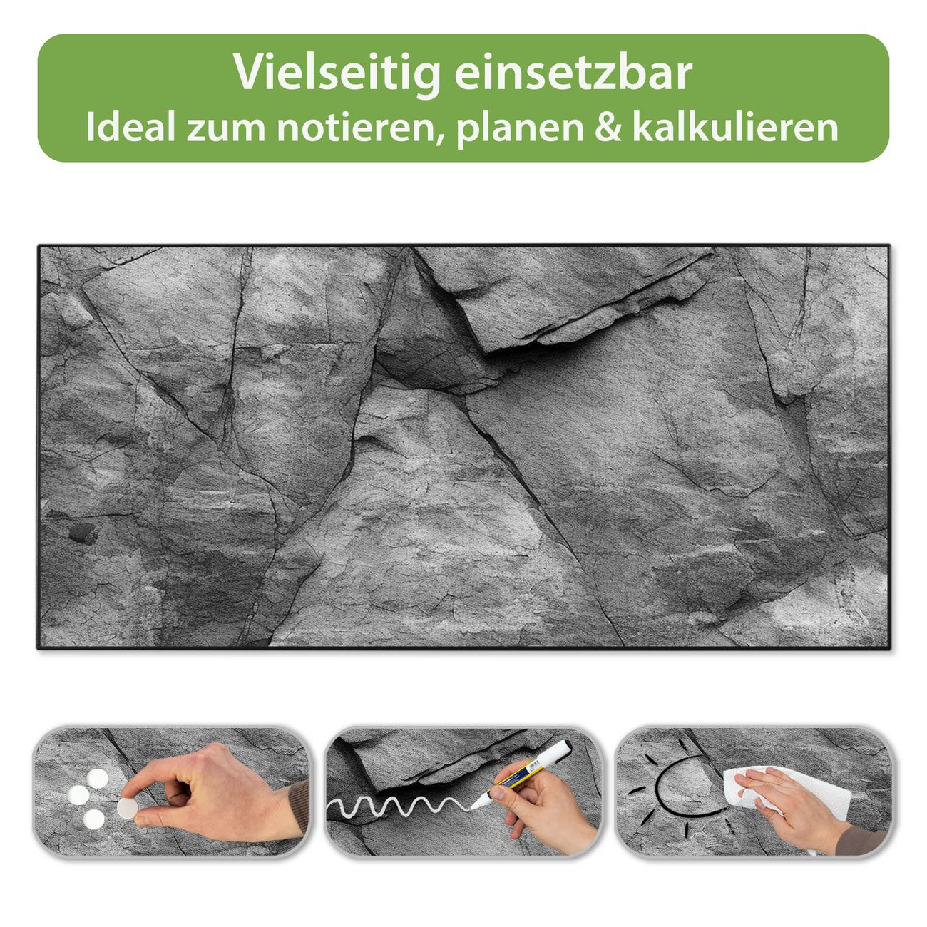 FUNKTION: Die banjado Magnettafel 78x37 cm im Design Motiv Schiefer Platte 2 vereint Funktionalität und modernes Wohndesign auf stilvolle Weise. Diese hochwertige Magnetwand aus Metall hilft Ihnen dabei, Notizen, Fotos, Termine, Einkaufslisten oder Rezepte übersichtlich zu organisieren. Als praktisches Memoboard sorgt sie für Struktur im Alltag und setzt gleichzeitig einen dekorativen Akzent an Ihrer Wand. DESIGN: Die Metalltafel besteht aus robustem, lackiertem Stahl und ist mit allen handelsüblichen Magneten nutzbar. Besonders praktisch ist die beschreibbare Oberfläche. Sie können die Magnettafel ganz einfach mit Kreidestiften beschriften und die Inhalte bei Bedarf mit einem feuchten Tuch wieder entfernen. So eignet sich das Memoboard ideal für Wochenpläne, Menüpläne, To Do Listen oder kreative Botschaften. DETAILS: Mit ihrem großzügigen Querformat von 78x37 cm bietet die Magnettafel ausreichend Platz für Ihre Organisation. Das Motiv Motiv Schiefer Platte 2 bringt eine warme, natürliche Optik in Küche, Flur, Büro oder Homeoffice und wirkt auch ohne Magnete oder Beschriftung wie ein modernes Wandbild. NUTZEN: Auf der Rückseite befinden sich vorgefertigte Löcher für eine schnelle und unkomplizierte Wandmontage. Jede banjado Magnettafel wird in Deutschland gefertigt und steht für Qualität, Langlebigkeit und liebevolle Verarbeitung. Dieses beschreibbare Memoboard ist die perfekte Kombination aus Metalltafel, Designobjekt und praktischer Magnetwand für Ihren Alltag. BANJADO: Wir sind ein kleines Team aus dem Herzen von Sachsen. Wir fertigen alle Artikel von Hand für Sie an, Sie erhalten keine preiswerte Importware. Auf Wunsch können Sie auch Ihr eigenes Foto auf die Magnettafel aufbringen, schreiben Sie uns an. Herzlichst, Ihr banjado-Team