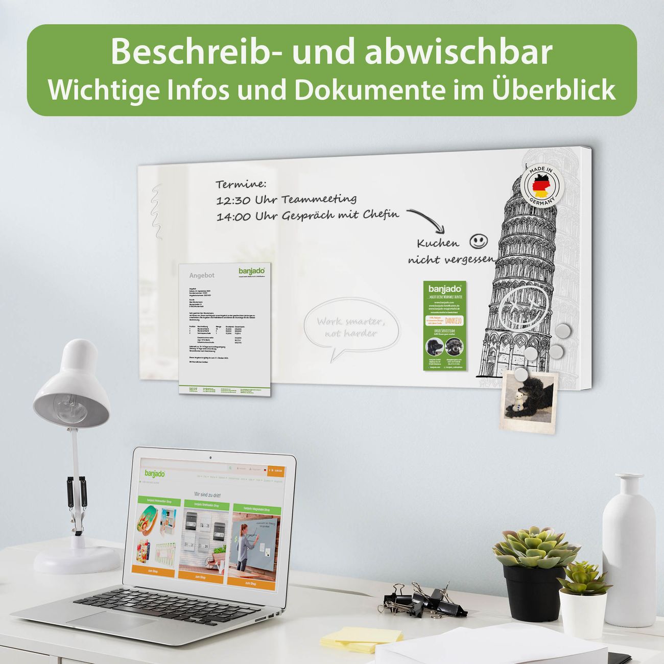 FUNKTION: Die banjado Magnettafel 78x37 cm im Design Motiv Schiefer Turm von Pisa Skizze vereint Funktionalität und modernes Wohndesign auf stilvolle Weise. Diese hochwertige Magnetwand aus Metall hilft Ihnen dabei, Notizen, Fotos, Termine, Einkaufslisten oder Rezepte übersichtlich zu organisieren. Als praktisches Memoboard sorgt sie für Struktur im Alltag und setzt gleichzeitig einen dekorativen Akzent an Ihrer Wand. DESIGN: Die Metalltafel besteht aus robustem, lackiertem Stahl und ist mit allen handelsüblichen Magneten nutzbar. Besonders praktisch ist die beschreibbare Oberfläche. Sie können die Magnettafel ganz einfach mit Kreidestiften beschriften und die Inhalte bei Bedarf mit einem feuchten Tuch wieder entfernen. So eignet sich das Memoboard ideal für Wochenpläne, Menüpläne, To Do Listen oder kreative Botschaften. DETAILS: Mit ihrem großzügigen Querformat von 78x37 cm bietet die Magnettafel ausreichend Platz für Ihre Organisation. Das Motiv Motiv Schiefer Turm von Pisa Skizze bringt eine warme, natürliche Optik in Küche, Flur, Büro oder Homeoffice und wirkt auch ohne Magnete oder Beschriftung wie ein modernes Wandbild. NUTZEN: Auf der Rückseite befinden sich vorgefertigte Löcher für eine schnelle und unkomplizierte Wandmontage. Jede banjado Magnettafel wird in Deutschland gefertigt und steht für Qualität, Langlebigkeit und liebevolle Verarbeitung. Dieses beschreibbare Memoboard ist die perfekte Kombination aus Metalltafel, Designobjekt und praktischer Magnetwand für Ihren Alltag. BANJADO: Wir sind ein kleines Team aus dem Herzen von Sachsen. Wir fertigen alle Artikel von Hand für Sie an, Sie erhalten keine preiswerte Importware. Auf Wunsch können Sie auch Ihr eigenes Foto auf die Magnettafel aufbringen, schreiben Sie uns an. Herzlichst, Ihr banjado-Team