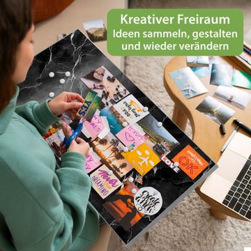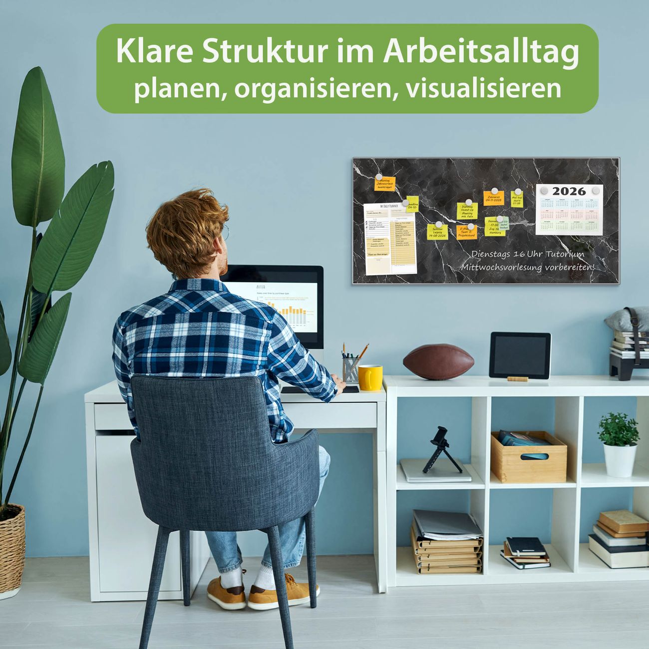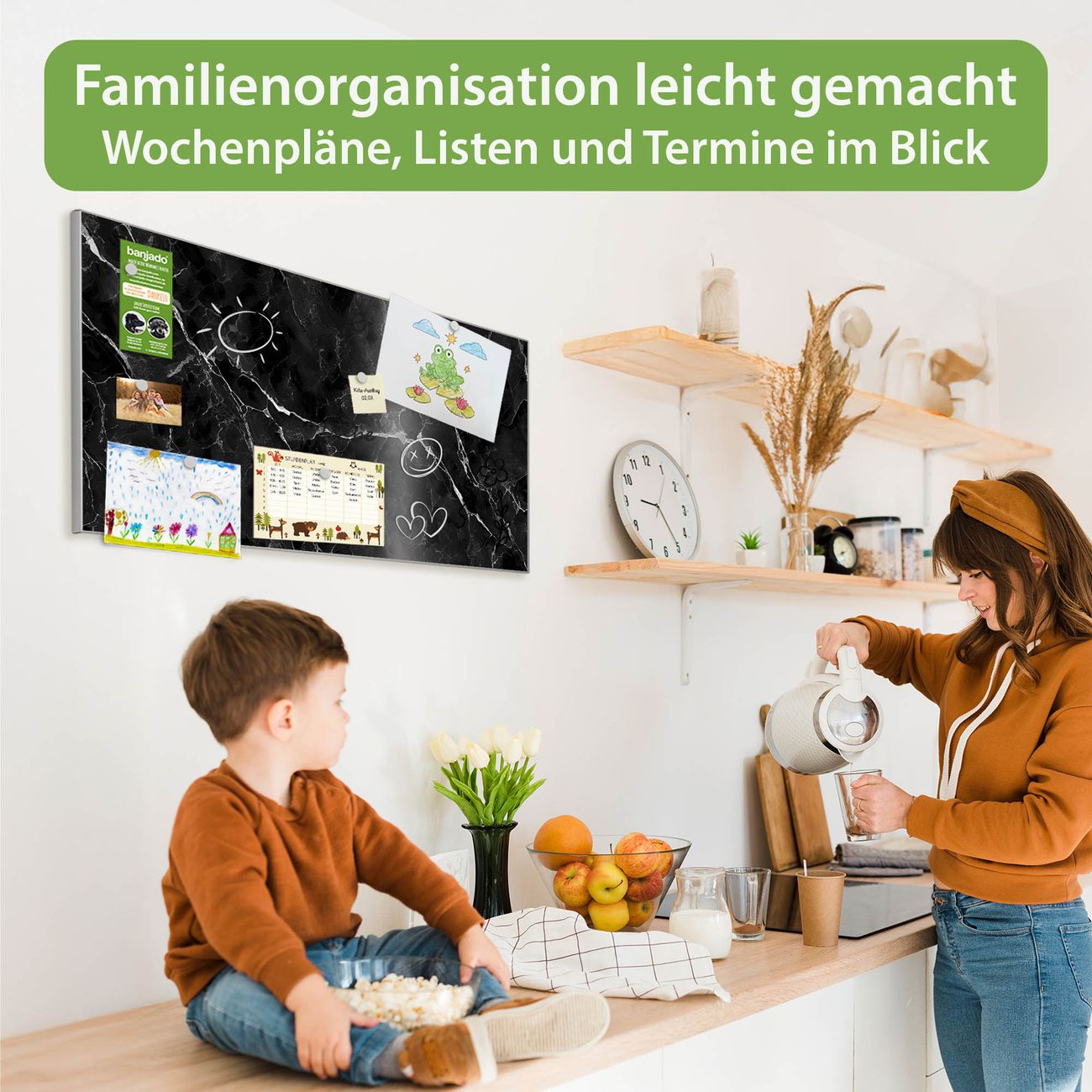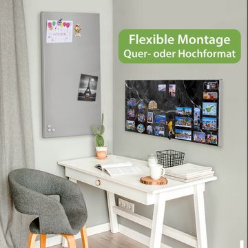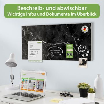 FUNKTION: Die banjado Magnettafel 78x37 cm im Design Motiv Schwarzgrauer Marmor vereint Funktionalität und modernes Wohndesign auf stilvolle Weise. Diese hochwertige Magnetwand aus Metall hilft Ihnen dabei, Notizen, Fotos, Termine, Einkaufslisten oder Rezepte übersichtlich zu organisieren. Als praktisches Memoboard sorgt sie für Struktur im Alltag und setzt gleichzeitig einen dekorativen Akzent an Ihrer Wand. DESIGN: Die Metalltafel besteht aus robustem, lackiertem Stahl und ist mit allen handelsüblichen Magneten nutzbar. Besonders praktisch ist die beschreibbare Oberfläche. Sie können die Magnettafel ganz einfach mit Kreidestiften beschriften und die Inhalte bei Bedarf mit einem feuchten Tuch wieder entfernen. So eignet sich das Memoboard ideal für Wochenpläne, Menüpläne, To Do Listen oder kreative Botschaften. DETAILS: Mit ihrem großzügigen Querformat von 78x37 cm bietet die Magnettafel ausreichend Platz für Ihre Organisation. Das Motiv Motiv Schwarzgrauer Marmor bringt eine warme, natürliche Optik in Küche, Flur, Büro oder Homeoffice und wirkt auch ohne Magnete oder Beschriftung wie ein modernes Wandbild. NUTZEN: Auf der Rückseite befinden sich vorgefertigte Löcher für eine schnelle und unkomplizierte Wandmontage. Jede banjado Magnettafel wird in Deutschland gefertigt und steht für Qualität, Langlebigkeit und liebevolle Verarbeitung. Dieses beschreibbare Memoboard ist die perfekte Kombination aus Metalltafel, Designobjekt und praktischer Magnetwand für Ihren Alltag. BANJADO: Wir sind ein kleines Team aus dem Herzen von Sachsen. Wir fertigen alle Artikel von Hand für Sie an, Sie erhalten keine preiswerte Importware. Auf Wunsch können Sie auch Ihr eigenes Foto auf die Magnettafel aufbringen, schreiben Sie uns an. Herzlichst, Ihr banjado-Team