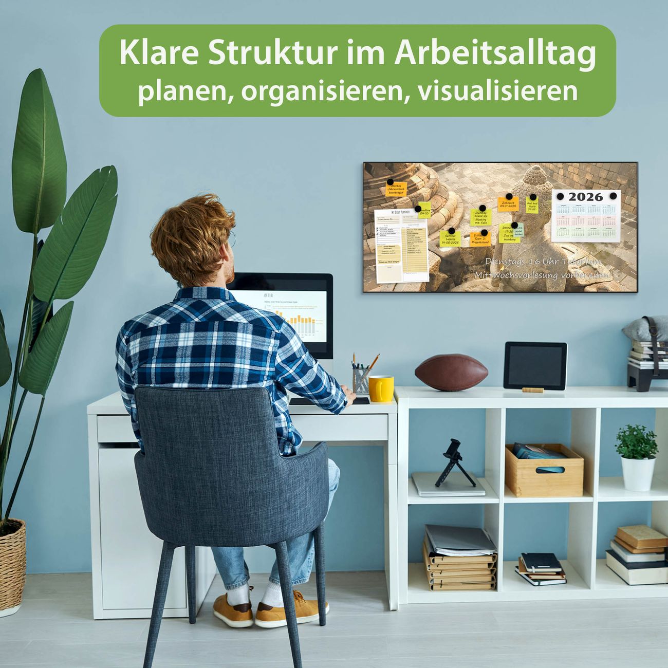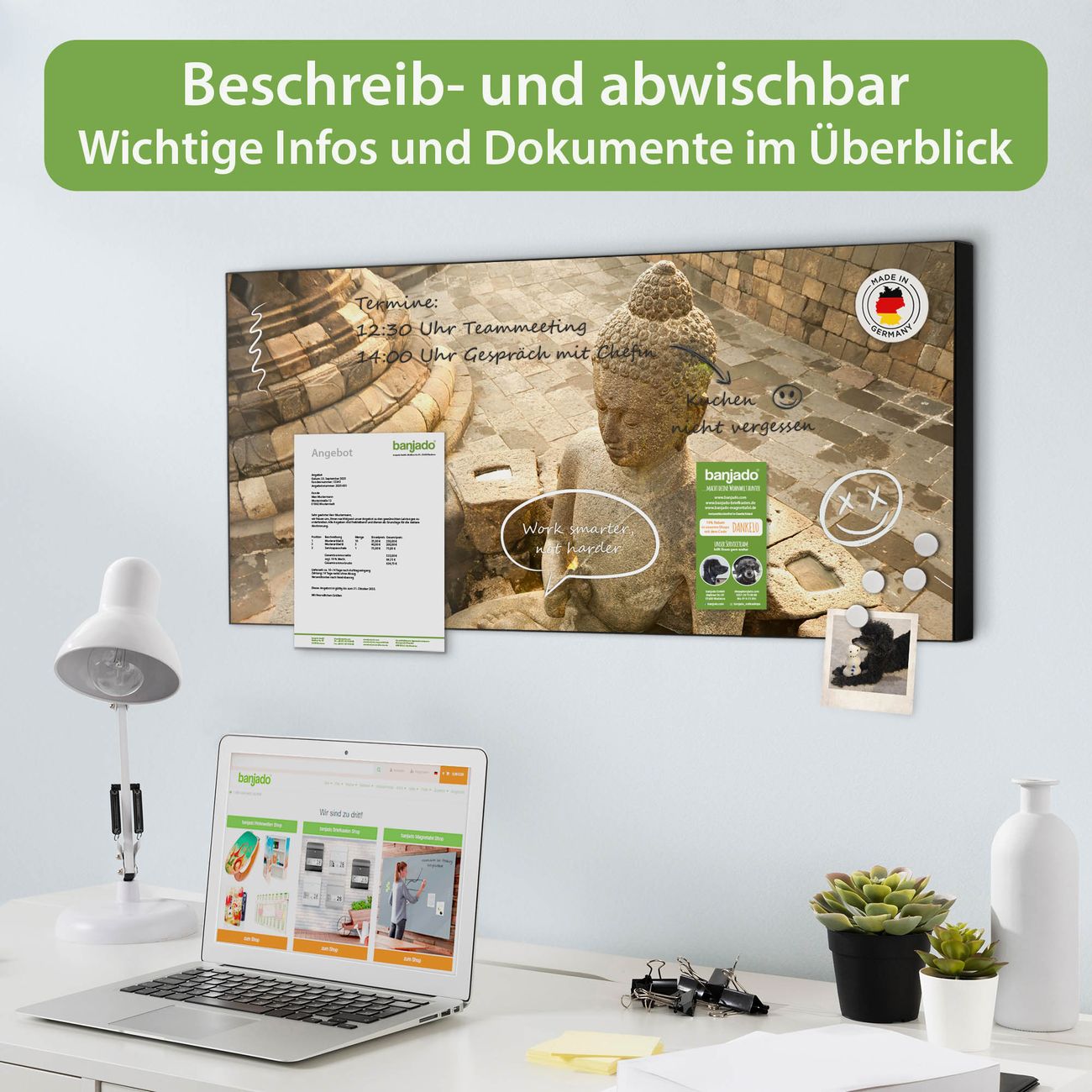 FUNKTION: Die banjado Magnettafel 78x37 cm im Design Motiv Sitzender Buddha vereint Funktionalität und modernes Wohndesign auf stilvolle Weise. Diese hochwertige Magnetwand aus Metall hilft Ihnen dabei, Notizen, Fotos, Termine, Einkaufslisten oder Rezepte übersichtlich zu organisieren. Als praktisches Memoboard sorgt sie für Struktur im Alltag und setzt gleichzeitig einen dekorativen Akzent an Ihrer Wand. DESIGN: Die Metalltafel besteht aus robustem, lackiertem Stahl und ist mit allen handelsüblichen Magneten nutzbar. Besonders praktisch ist die beschreibbare Oberfläche. Sie können die Magnettafel ganz einfach mit Kreidestiften beschriften und die Inhalte bei Bedarf mit einem feuchten Tuch wieder entfernen. So eignet sich das Memoboard ideal für Wochenpläne, Menüpläne, To Do Listen oder kreative Botschaften. DETAILS: Mit ihrem großzügigen Querformat von 78x37 cm bietet die Magnettafel ausreichend Platz für Ihre Organisation. Das Motiv Motiv Sitzender Buddha bringt eine warme, natürliche Optik in Küche, Flur, Büro oder Homeoffice und wirkt auch ohne Magnete oder Beschriftung wie ein modernes Wandbild. NUTZEN: Auf der Rückseite befinden sich vorgefertigte Löcher für eine schnelle und unkomplizierte Wandmontage. Jede banjado Magnettafel wird in Deutschland gefertigt und steht für Qualität, Langlebigkeit und liebevolle Verarbeitung. Dieses beschreibbare Memoboard ist die perfekte Kombination aus Metalltafel, Designobjekt und praktischer Magnetwand für Ihren Alltag. BANJADO: Wir sind ein kleines Team aus dem Herzen von Sachsen. Wir fertigen alle Artikel von Hand für Sie an, Sie erhalten keine preiswerte Importware. Auf Wunsch können Sie auch Ihr eigenes Foto auf die Magnettafel aufbringen, schreiben Sie uns an. Herzlichst, Ihr banjado-Team