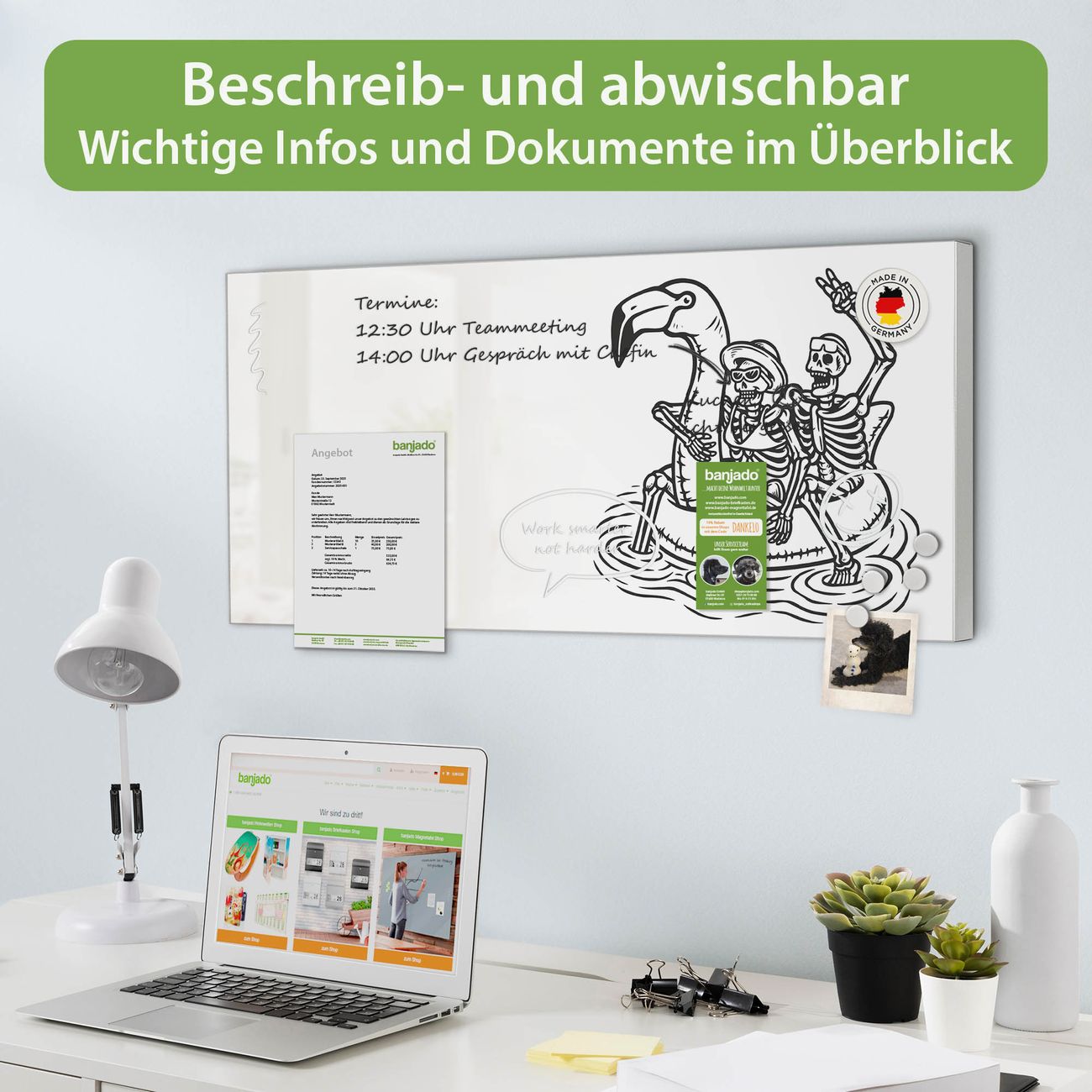 FUNKTION: Die banjado Magnettafel 78x37 cm im Design Motiv Skelette mit Flamingoschwimmring 2 vereint Funktionalität und modernes Wohndesign auf stilvolle Weise. Diese hochwertige Magnetwand aus Metall hilft Ihnen dabei, Notizen, Fotos, Termine, Einkaufslisten oder Rezepte übersichtlich zu organisieren. Als praktisches Memoboard sorgt sie für Struktur im Alltag und setzt gleichzeitig einen dekorativen Akzent an Ihrer Wand. DESIGN: Die Metalltafel besteht aus robustem, lackiertem Stahl und ist mit allen handelsüblichen Magneten nutzbar. Besonders praktisch ist die beschreibbare Oberfläche. Sie können die Magnettafel ganz einfach mit Kreidestiften beschriften und die Inhalte bei Bedarf mit einem feuchten Tuch wieder entfernen. So eignet sich das Memoboard ideal für Wochenpläne, Menüpläne, To Do Listen oder kreative Botschaften. DETAILS: Mit ihrem großzügigen Querformat von 78x37 cm bietet die Magnettafel ausreichend Platz für Ihre Organisation. Das Motiv Motiv Skelette mit Flamingoschwimmring 2 bringt eine warme, natürliche Optik in Küche, Flur, Büro oder Homeoffice und wirkt auch ohne Magnete oder Beschriftung wie ein modernes Wandbild. NUTZEN: Auf der Rückseite befinden sich vorgefertigte Löcher für eine schnelle und unkomplizierte Wandmontage. Jede banjado Magnettafel wird in Deutschland gefertigt und steht für Qualität, Langlebigkeit und liebevolle Verarbeitung. Dieses beschreibbare Memoboard ist die perfekte Kombination aus Metalltafel, Designobjekt und praktischer Magnetwand für Ihren Alltag. BANJADO: Wir sind ein kleines Team aus dem Herzen von Sachsen. Wir fertigen alle Artikel von Hand für Sie an, Sie erhalten keine preiswerte Importware. Auf Wunsch können Sie auch Ihr eigenes Foto auf die Magnettafel aufbringen, schreiben Sie uns an. Herzlichst, Ihr banjado-Team