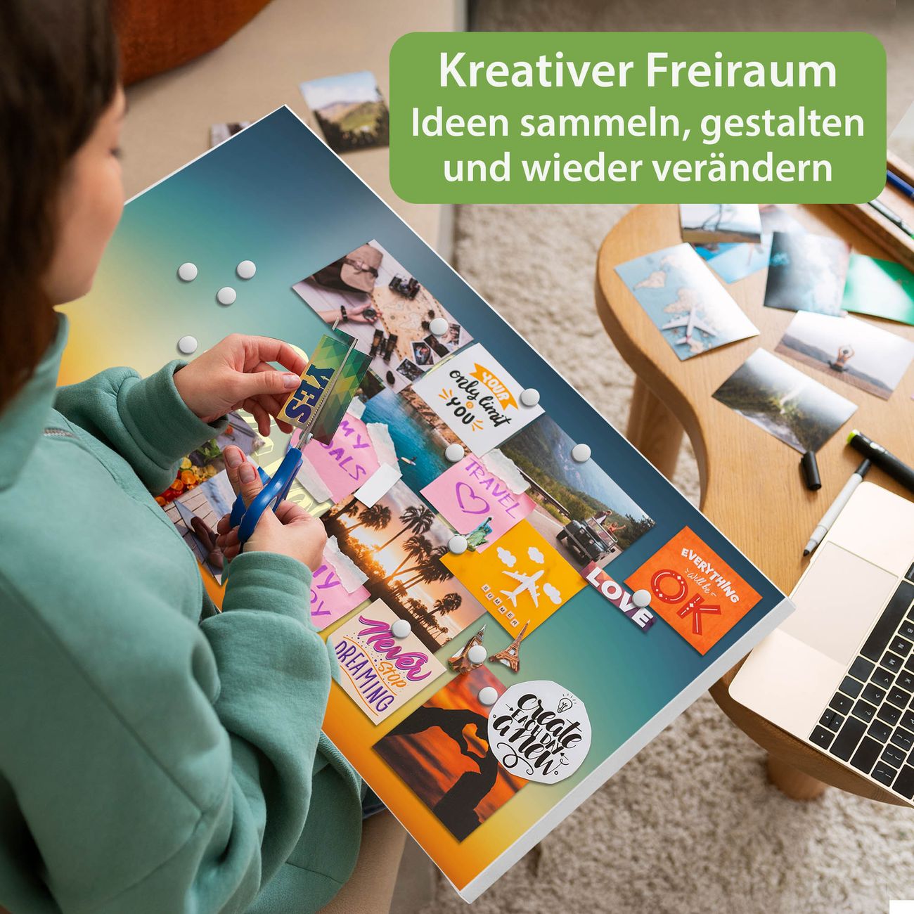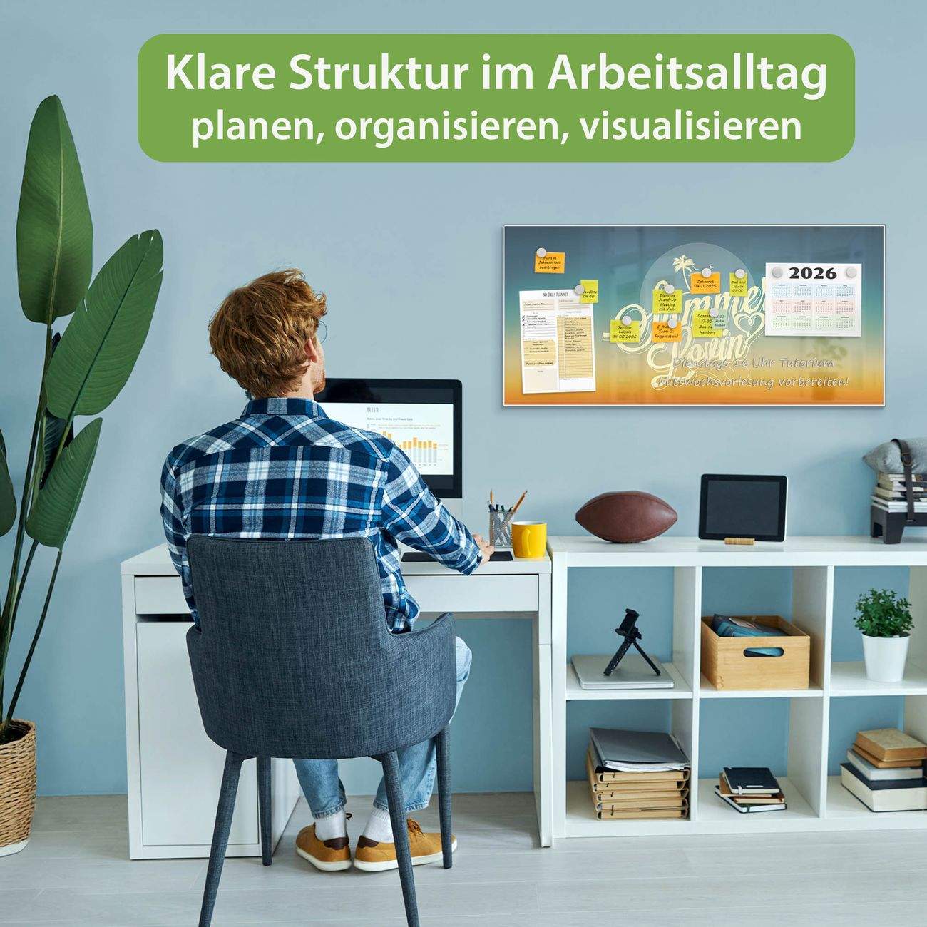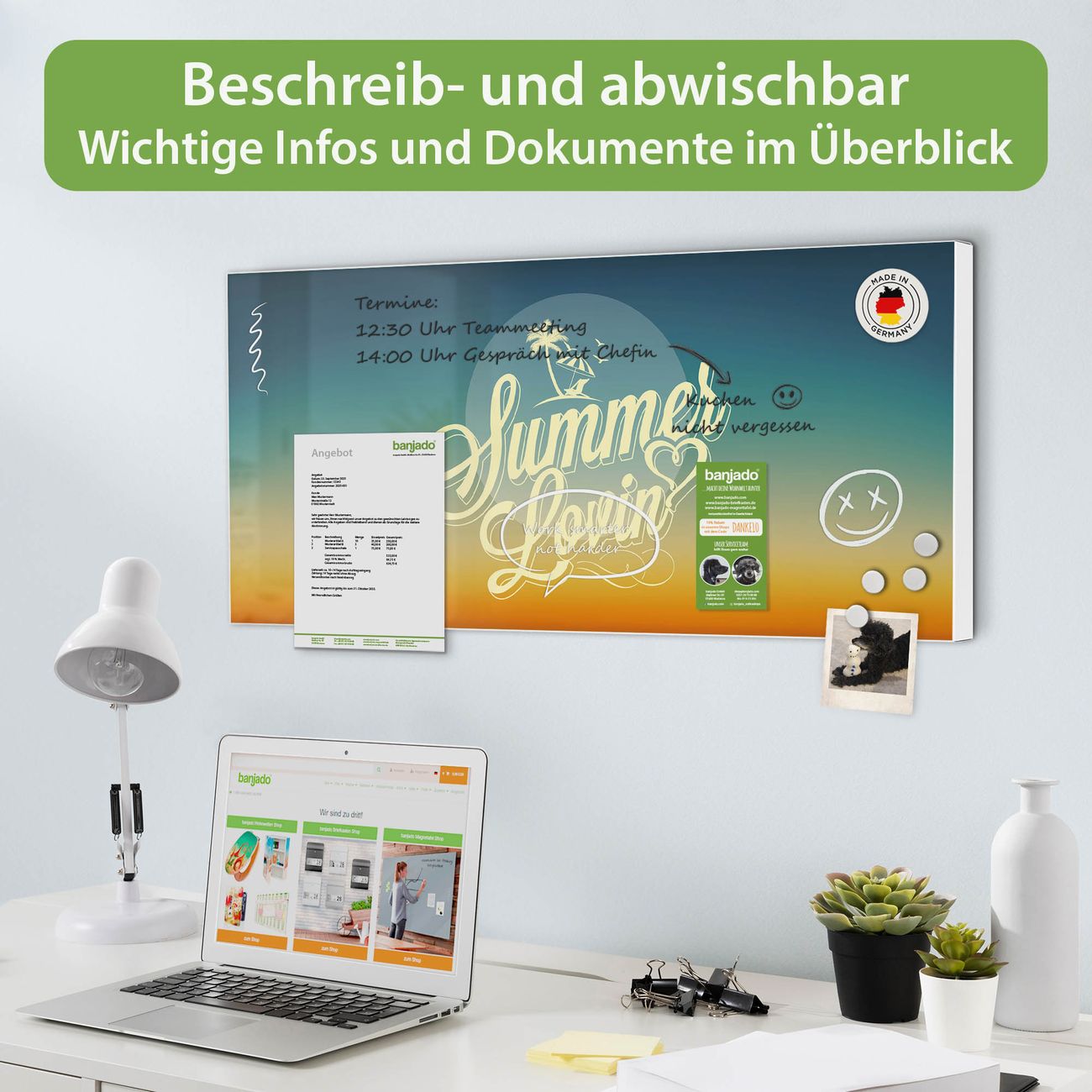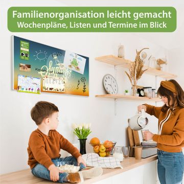 FUNKTION: Die banjado Magnettafel 78x37 cm im Design Motiv Sommer Lovin vereint Funktionalität und modernes Wohndesign auf stilvolle Weise. Diese hochwertige Magnetwand aus Metall hilft Ihnen dabei, Notizen, Fotos, Termine, Einkaufslisten oder Rezepte übersichtlich zu organisieren. Als praktisches Memoboard sorgt sie für Struktur im Alltag und setzt gleichzeitig einen dekorativen Akzent an Ihrer Wand. DESIGN: Die Metalltafel besteht aus robustem, lackiertem Stahl und ist mit allen handelsüblichen Magneten nutzbar. Besonders praktisch ist die beschreibbare Oberfläche. Sie können die Magnettafel ganz einfach mit Kreidestiften beschriften und die Inhalte bei Bedarf mit einem feuchten Tuch wieder entfernen. So eignet sich das Memoboard ideal für Wochenpläne, Menüpläne, To Do Listen oder kreative Botschaften. DETAILS: Mit ihrem großzügigen Querformat von 78x37 cm bietet die Magnettafel ausreichend Platz für Ihre Organisation. Das Motiv Motiv Sommer Lovin bringt eine warme, natürliche Optik in Küche, Flur, Büro oder Homeoffice und wirkt auch ohne Magnete oder Beschriftung wie ein modernes Wandbild. NUTZEN: Auf der Rückseite befinden sich vorgefertigte Löcher für eine schnelle und unkomplizierte Wandmontage. Jede banjado Magnettafel wird in Deutschland gefertigt und steht für Qualität, Langlebigkeit und liebevolle Verarbeitung. Dieses beschreibbare Memoboard ist die perfekte Kombination aus Metalltafel, Designobjekt und praktischer Magnetwand für Ihren Alltag. BANJADO: Wir sind ein kleines Team aus dem Herzen von Sachsen. Wir fertigen alle Artikel von Hand für Sie an, Sie erhalten keine preiswerte Importware. Auf Wunsch können Sie auch Ihr eigenes Foto auf die Magnettafel aufbringen, schreiben Sie uns an. Herzlichst, Ihr banjado-Team