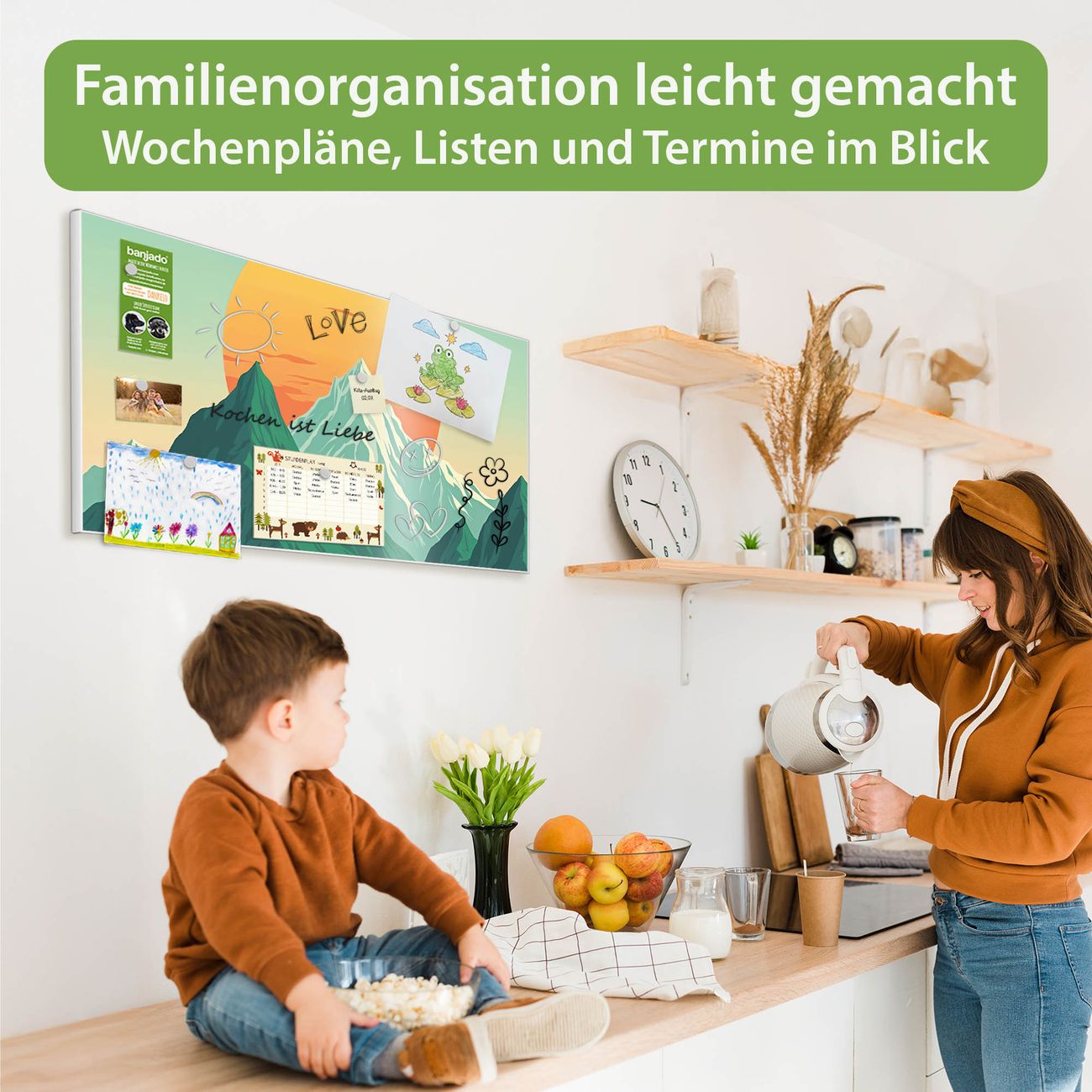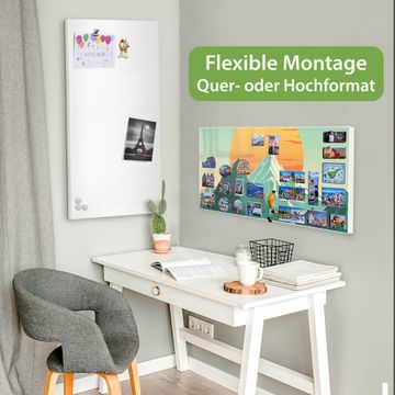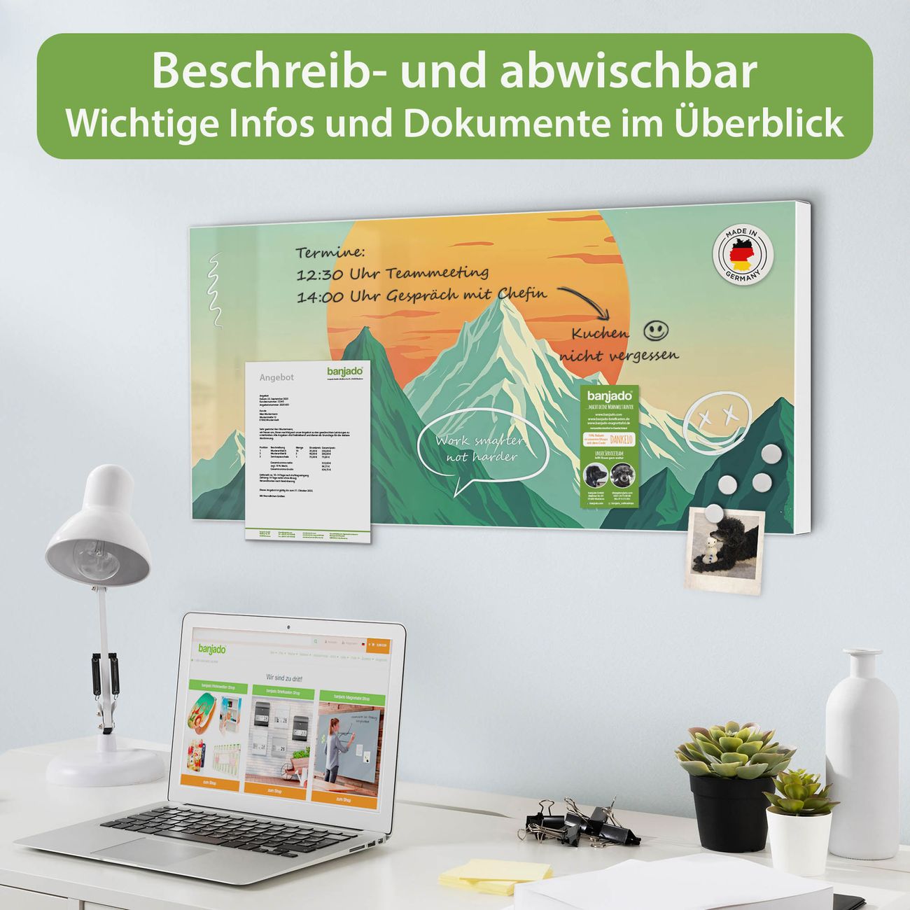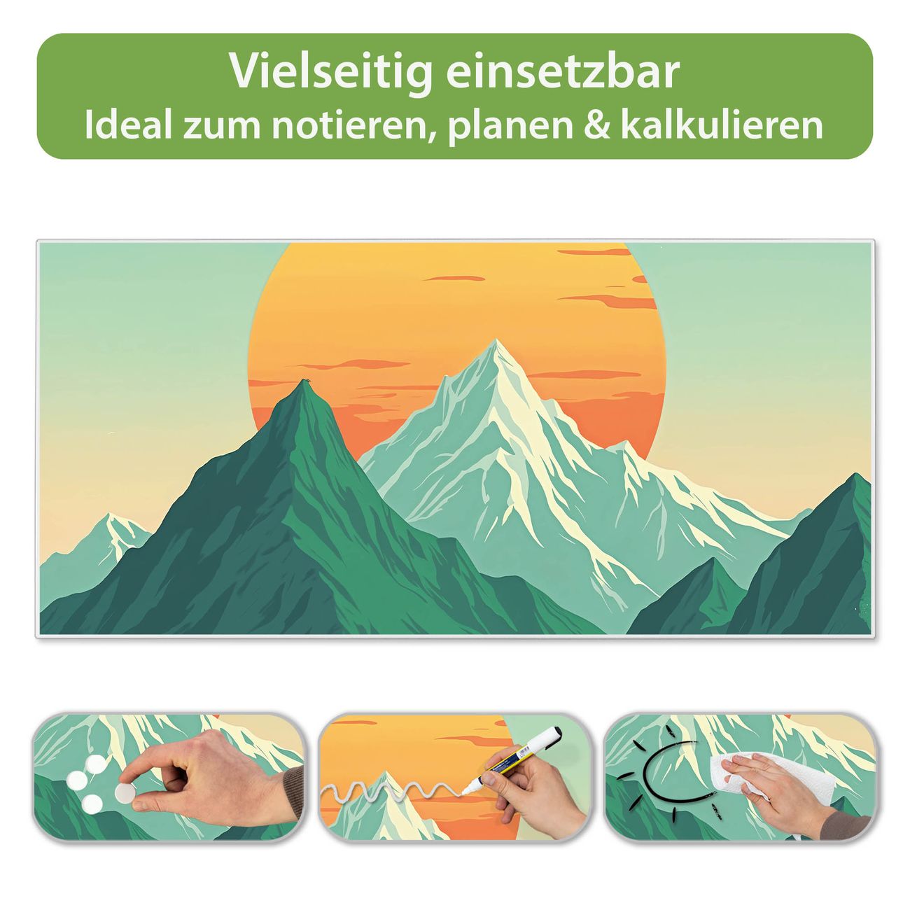 FUNKTION: Die banjado Magnettafel 78x37 cm im Design Motiv Sonnenaufgang über den Bergen vereint Funktionalität und modernes Wohndesign auf stilvolle Weise. Diese hochwertige Magnetwand aus Metall hilft Ihnen dabei, Notizen, Fotos, Termine, Einkaufslisten oder Rezepte übersichtlich zu organisieren. Als praktisches Memoboard sorgt sie für Struktur im Alltag und setzt gleichzeitig einen dekorativen Akzent an Ihrer Wand. DESIGN: Die Metalltafel besteht aus robustem, lackiertem Stahl und ist mit allen handelsüblichen Magneten nutzbar. Besonders praktisch ist die beschreibbare Oberfläche. Sie können die Magnettafel ganz einfach mit Kreidestiften beschriften und die Inhalte bei Bedarf mit einem feuchten Tuch wieder entfernen. So eignet sich das Memoboard ideal für Wochenpläne, Menüpläne, To Do Listen oder kreative Botschaften. DETAILS: Mit ihrem großzügigen Querformat von 78x37 cm bietet die Magnettafel ausreichend Platz für Ihre Organisation. Das Motiv Motiv Sonnenaufgang über den Bergen bringt eine warme, natürliche Optik in Küche, Flur, Büro oder Homeoffice und wirkt auch ohne Magnete oder Beschriftung wie ein modernes Wandbild. NUTZEN: Auf der Rückseite befinden sich vorgefertigte Löcher für eine schnelle und unkomplizierte Wandmontage. Jede banjado Magnettafel wird in Deutschland gefertigt und steht für Qualität, Langlebigkeit und liebevolle Verarbeitung. Dieses beschreibbare Memoboard ist die perfekte Kombination aus Metalltafel, Designobjekt und praktischer Magnetwand für Ihren Alltag. BANJADO: Wir sind ein kleines Team aus dem Herzen von Sachsen. Wir fertigen alle Artikel von Hand für Sie an, Sie erhalten keine preiswerte Importware. Auf Wunsch können Sie auch Ihr eigenes Foto auf die Magnettafel aufbringen, schreiben Sie uns an. Herzlichst, Ihr banjado-Team