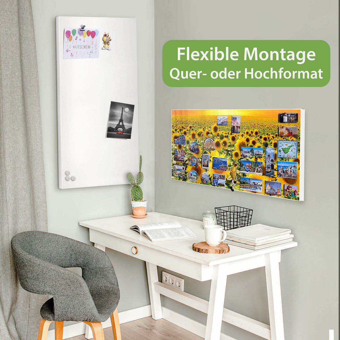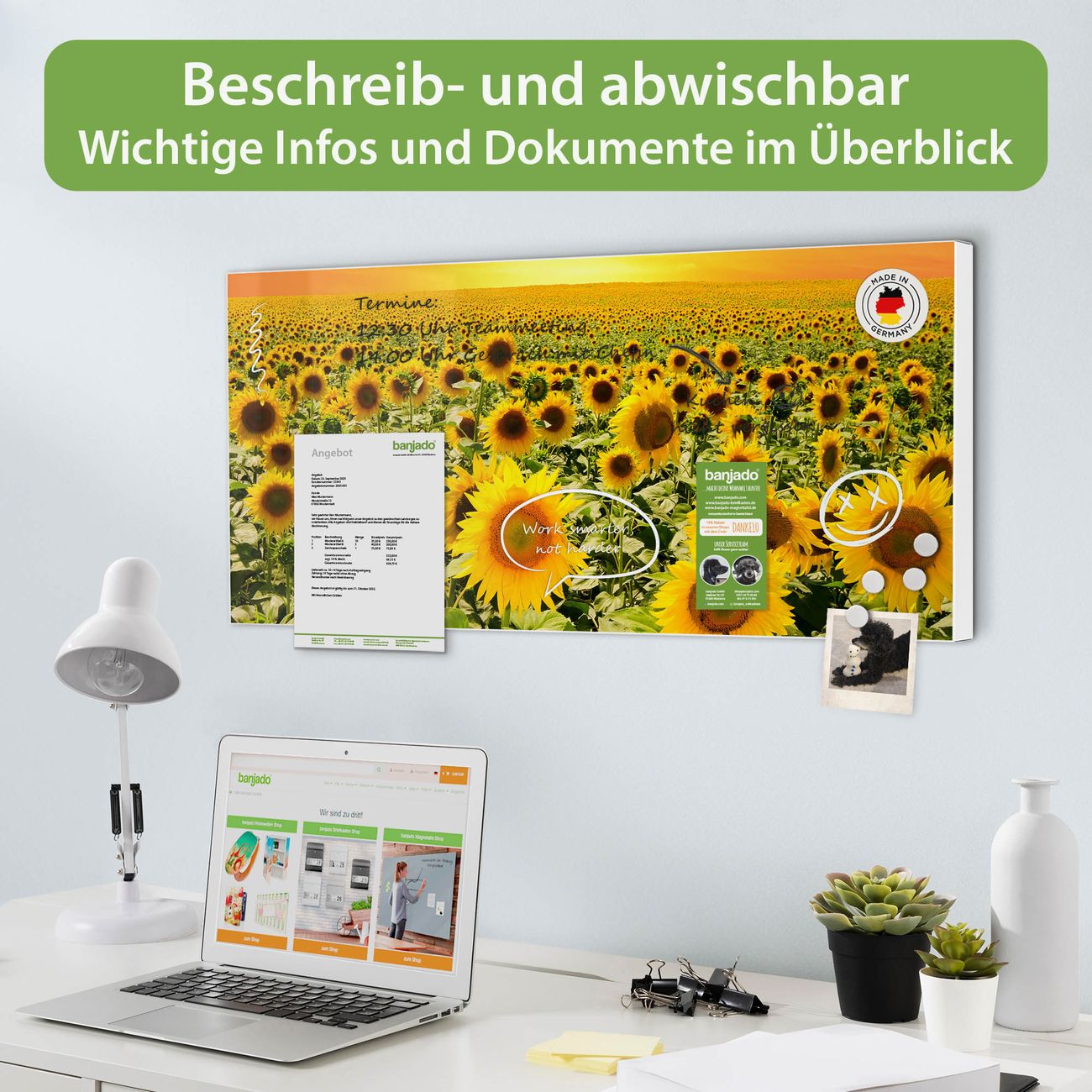 FUNKTION: Die banjado Magnettafel 78x37 cm im Design Motiv Sonnenblumenmeer vereint Funktionalität und modernes Wohndesign auf stilvolle Weise. Diese hochwertige Magnetwand aus Metall hilft Ihnen dabei, Notizen, Fotos, Termine, Einkaufslisten oder Rezepte übersichtlich zu organisieren. Als praktisches Memoboard sorgt sie für Struktur im Alltag und setzt gleichzeitig einen dekorativen Akzent an Ihrer Wand. DESIGN: Die Metalltafel besteht aus robustem, lackiertem Stahl und ist mit allen handelsüblichen Magneten nutzbar. Besonders praktisch ist die beschreibbare Oberfläche. Sie können die Magnettafel ganz einfach mit Kreidestiften beschriften und die Inhalte bei Bedarf mit einem feuchten Tuch wieder entfernen. So eignet sich das Memoboard ideal für Wochenpläne, Menüpläne, To Do Listen oder kreative Botschaften. DETAILS: Mit ihrem großzügigen Querformat von 78x37 cm bietet die Magnettafel ausreichend Platz für Ihre Organisation. Das Motiv Motiv Sonnenblumenmeer bringt eine warme, natürliche Optik in Küche, Flur, Büro oder Homeoffice und wirkt auch ohne Magnete oder Beschriftung wie ein modernes Wandbild. NUTZEN: Auf der Rückseite befinden sich vorgefertigte Löcher für eine schnelle und unkomplizierte Wandmontage. Jede banjado Magnettafel wird in Deutschland gefertigt und steht für Qualität, Langlebigkeit und liebevolle Verarbeitung. Dieses beschreibbare Memoboard ist die perfekte Kombination aus Metalltafel, Designobjekt und praktischer Magnetwand für Ihren Alltag. BANJADO: Wir sind ein kleines Team aus dem Herzen von Sachsen. Wir fertigen alle Artikel von Hand für Sie an, Sie erhalten keine preiswerte Importware. Auf Wunsch können Sie auch Ihr eigenes Foto auf die Magnettafel aufbringen, schreiben Sie uns an. Herzlichst, Ihr banjado-Team