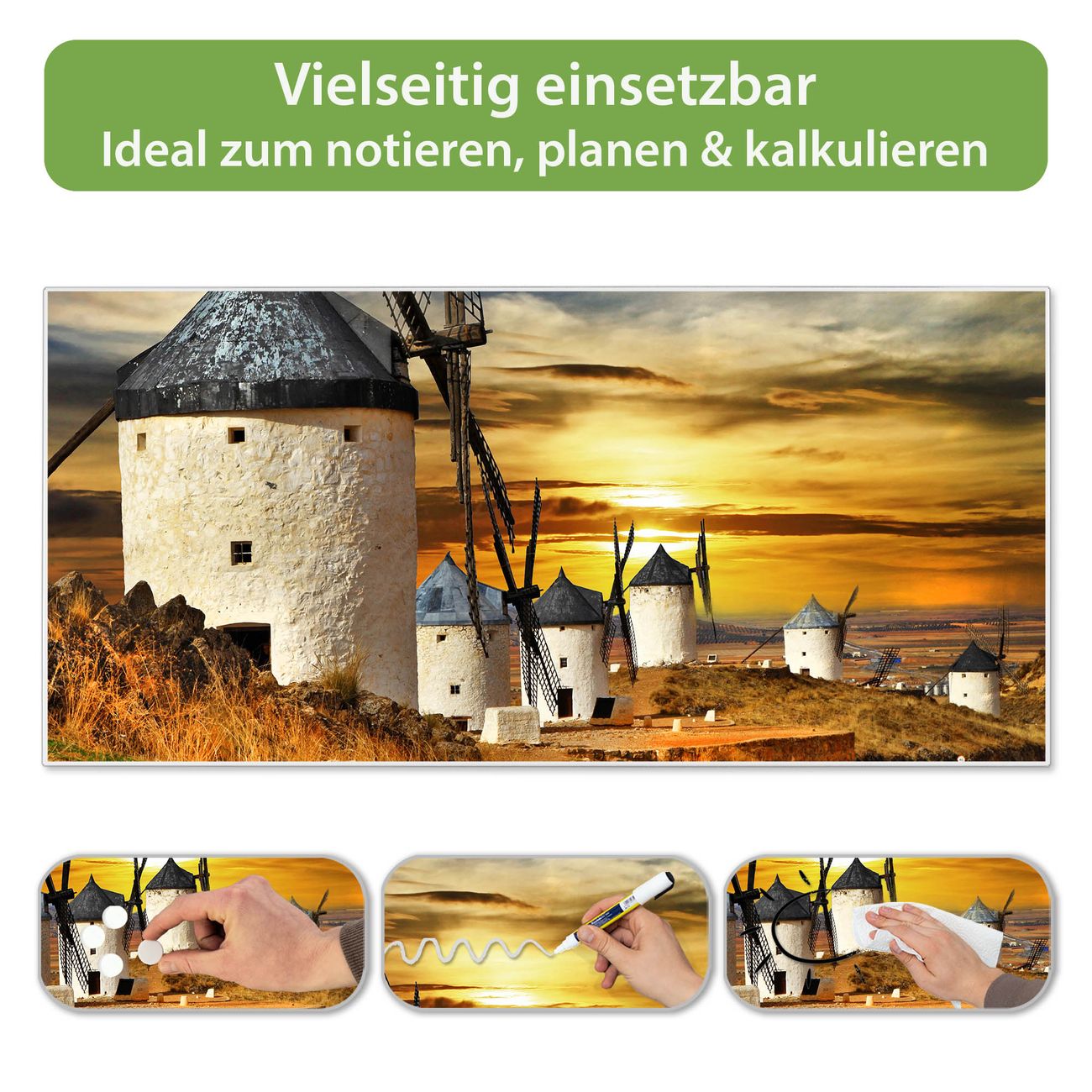 Metall Magnettafel beschreibbar 78x37cm Motiv Spanische Windmühlen