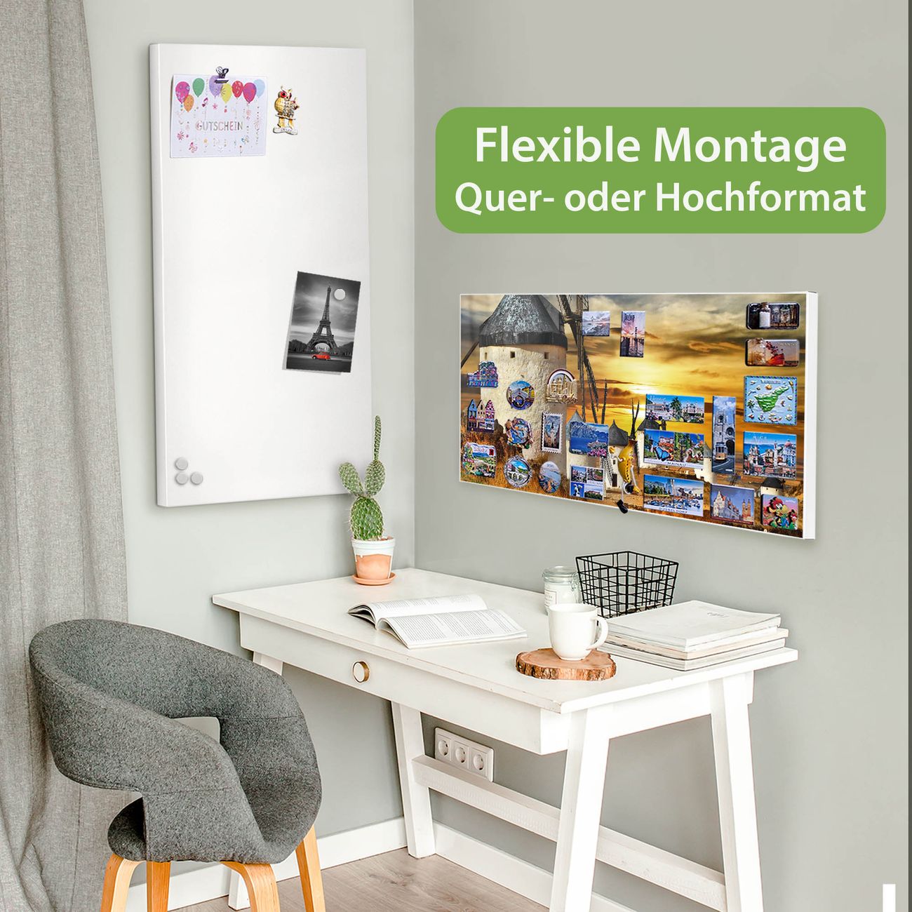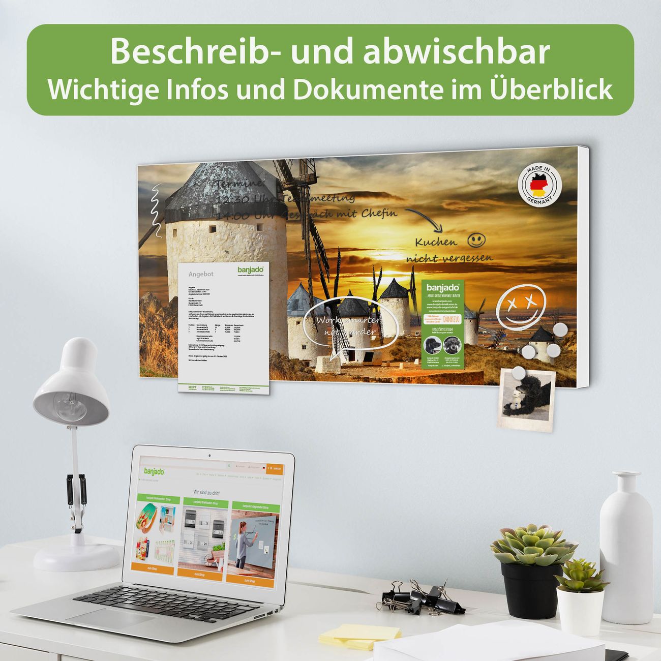 FUNKTION: Die banjado Magnettafel 78x37 cm im Design Motiv Spanische Windmühlen vereint Funktionalität und modernes Wohndesign auf stilvolle Weise. Diese hochwertige Magnetwand aus Metall hilft Ihnen dabei, Notizen, Fotos, Termine, Einkaufslisten oder Rezepte übersichtlich zu organisieren. Als praktisches Memoboard sorgt sie für Struktur im Alltag und setzt gleichzeitig einen dekorativen Akzent an Ihrer Wand. DESIGN: Die Metalltafel besteht aus robustem, lackiertem Stahl und ist mit allen handelsüblichen Magneten nutzbar. Besonders praktisch ist die beschreibbare Oberfläche. Sie können die Magnettafel ganz einfach mit Kreidestiften beschriften und die Inhalte bei Bedarf mit einem feuchten Tuch wieder entfernen. So eignet sich das Memoboard ideal für Wochenpläne, Menüpläne, To Do Listen oder kreative Botschaften. DETAILS: Mit ihrem großzügigen Querformat von 78x37 cm bietet die Magnettafel ausreichend Platz für Ihre Organisation. Das Motiv Motiv Spanische Windmühlen bringt eine warme, natürliche Optik in Küche, Flur, Büro oder Homeoffice und wirkt auch ohne Magnete oder Beschriftung wie ein modernes Wandbild. NUTZEN: Auf der Rückseite befinden sich vorgefertigte Löcher für eine schnelle und unkomplizierte Wandmontage. Jede banjado Magnettafel wird in Deutschland gefertigt und steht für Qualität, Langlebigkeit und liebevolle Verarbeitung. Dieses beschreibbare Memoboard ist die perfekte Kombination aus Metalltafel, Designobjekt und praktischer Magnetwand für Ihren Alltag. BANJADO: Wir sind ein kleines Team aus dem Herzen von Sachsen. Wir fertigen alle Artikel von Hand für Sie an, Sie erhalten keine preiswerte Importware. Auf Wunsch können Sie auch Ihr eigenes Foto auf die Magnettafel aufbringen, schreiben Sie uns an. Herzlichst, Ihr banjado-Team