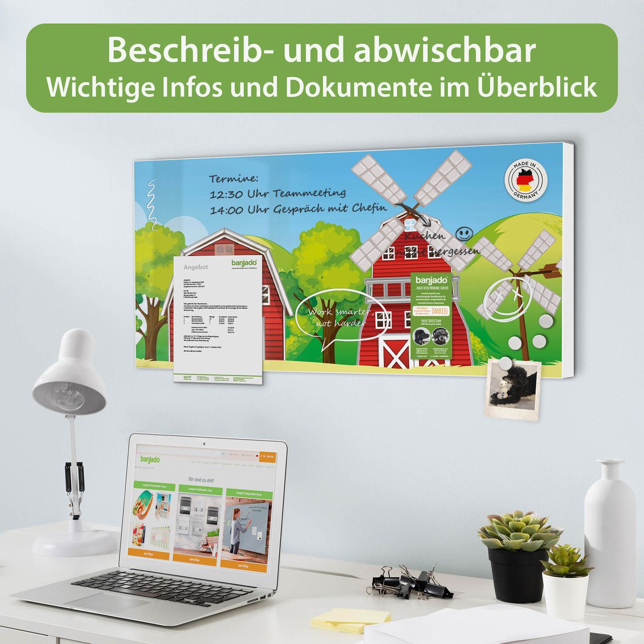 FUNKTION: Die banjado Magnettafel 78x37 cm im Design Motiv Spielbrett 7 vereint Funktionalität und modernes Wohndesign auf stilvolle Weise. Diese hochwertige Magnetwand aus Metall hilft Ihnen dabei, Notizen, Fotos, Termine, Einkaufslisten oder Rezepte übersichtlich zu organisieren. Als praktisches Memoboard sorgt sie für Struktur im Alltag und setzt gleichzeitig einen dekorativen Akzent an Ihrer Wand. DESIGN: Die Metalltafel besteht aus robustem, lackiertem Stahl und ist mit allen handelsüblichen Magneten nutzbar. Besonders praktisch ist die beschreibbare Oberfläche. Sie können die Magnettafel ganz einfach mit Kreidestiften beschriften und die Inhalte bei Bedarf mit einem feuchten Tuch wieder entfernen. So eignet sich das Memoboard ideal für Wochenpläne, Menüpläne, To Do Listen oder kreative Botschaften. DETAILS: Mit ihrem großzügigen Querformat von 78x37 cm bietet die Magnettafel ausreichend Platz für Ihre Organisation. Das Motiv Motiv Spielbrett 7 bringt eine warme, natürliche Optik in Küche, Flur, Büro oder Homeoffice und wirkt auch ohne Magnete oder Beschriftung wie ein modernes Wandbild. NUTZEN: Auf der Rückseite befinden sich vorgefertigte Löcher für eine schnelle und unkomplizierte Wandmontage. Jede banjado Magnettafel wird in Deutschland gefertigt und steht für Qualität, Langlebigkeit und liebevolle Verarbeitung. Dieses beschreibbare Memoboard ist die perfekte Kombination aus Metalltafel, Designobjekt und praktischer Magnetwand für Ihren Alltag. BANJADO: Wir sind ein kleines Team aus dem Herzen von Sachsen. Wir fertigen alle Artikel von Hand für Sie an, Sie erhalten keine preiswerte Importware. Auf Wunsch können Sie auch Ihr eigenes Foto auf die Magnettafel aufbringen, schreiben Sie uns an. Herzlichst, Ihr banjado-Team