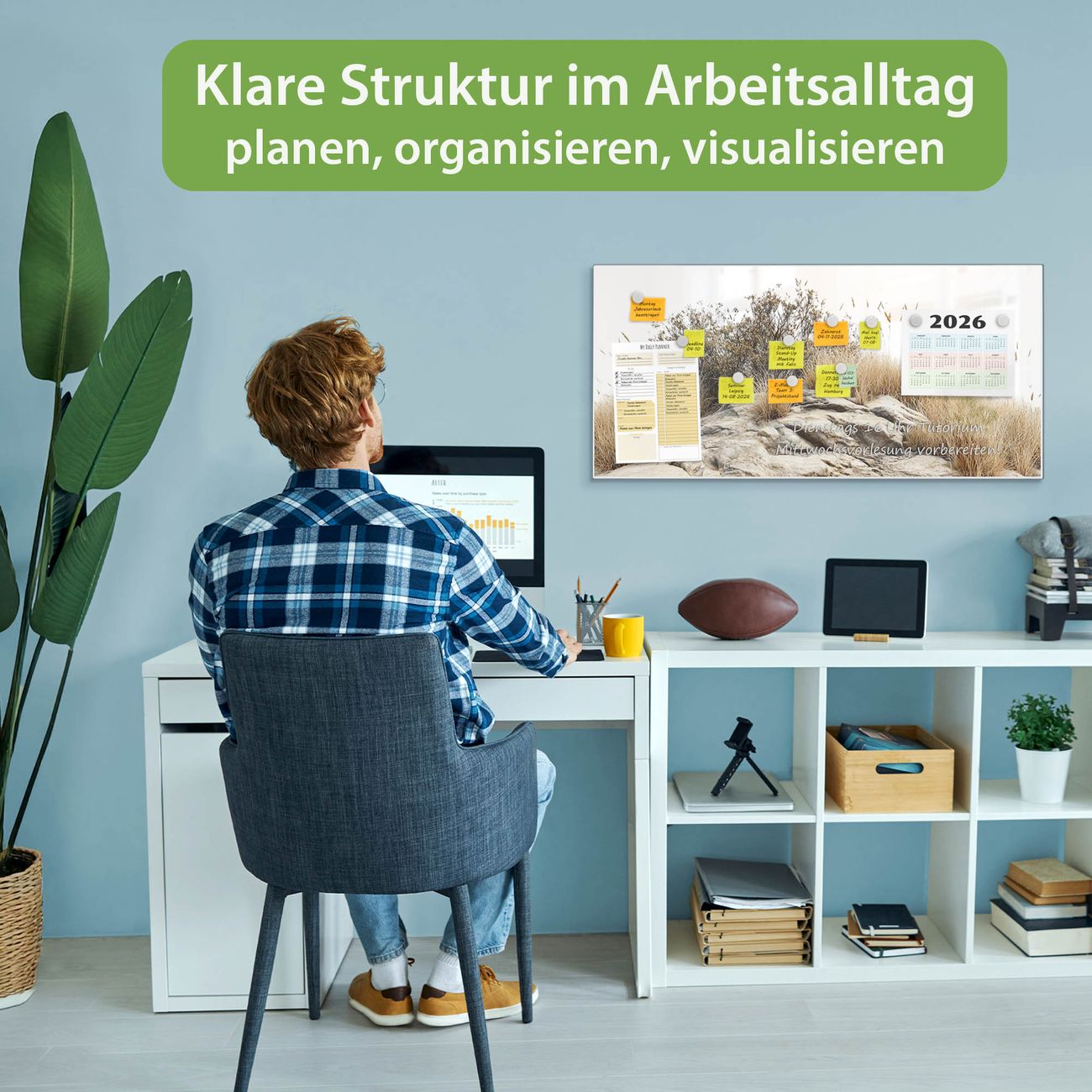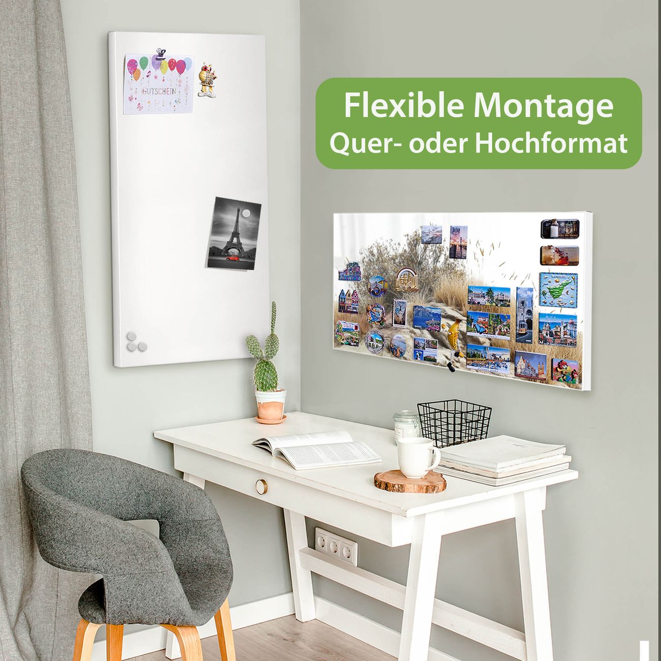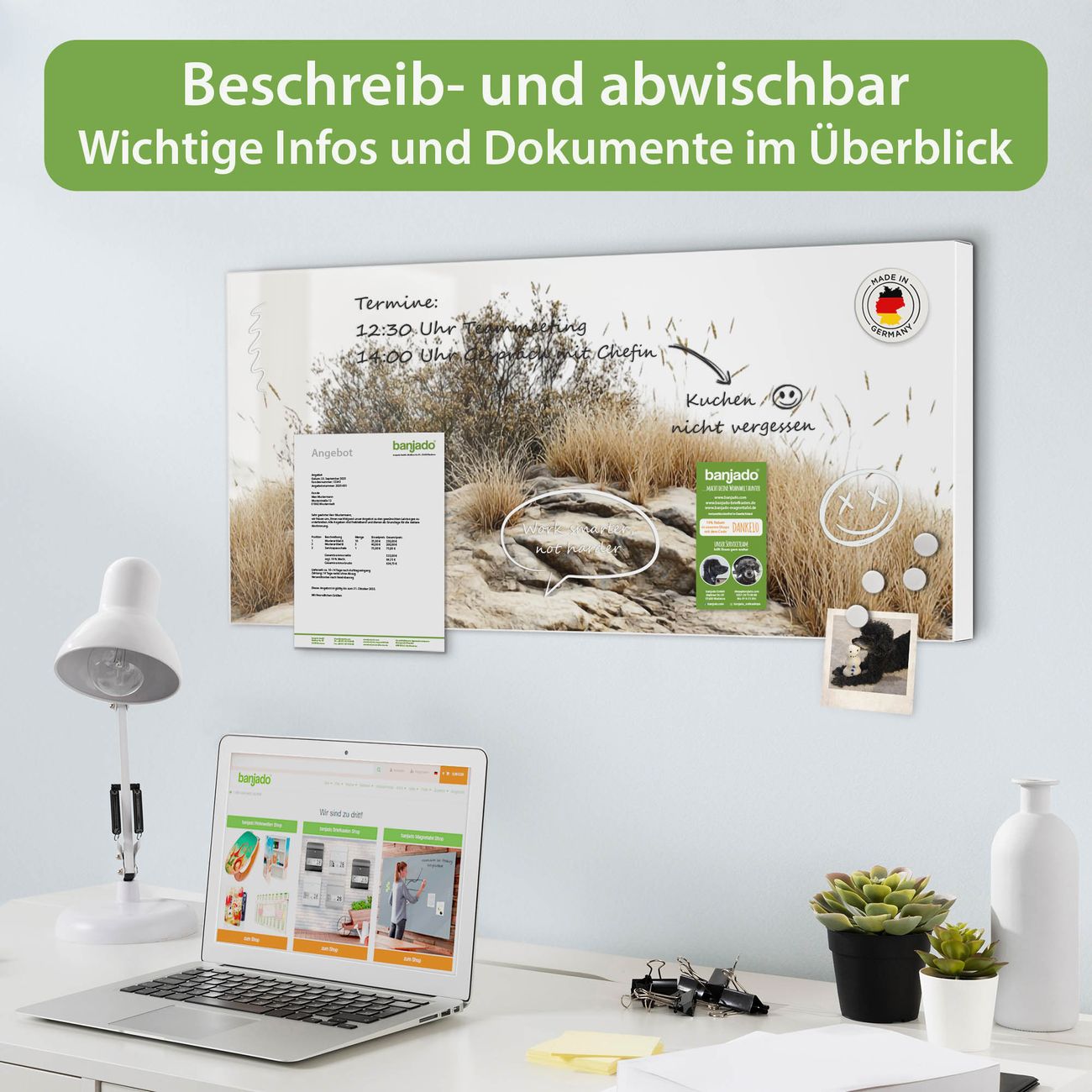 FUNKTION: Die banjado Magnettafel 78x37 cm im Design Motiv Steinige Landschaft vereint Funktionalität und modernes Wohndesign auf stilvolle Weise. Diese hochwertige Magnetwand aus Metall hilft Ihnen dabei, Notizen, Fotos, Termine, Einkaufslisten oder Rezepte übersichtlich zu organisieren. Als praktisches Memoboard sorgt sie für Struktur im Alltag und setzt gleichzeitig einen dekorativen Akzent an Ihrer Wand. DESIGN: Die Metalltafel besteht aus robustem, lackiertem Stahl und ist mit allen handelsüblichen Magneten nutzbar. Besonders praktisch ist die beschreibbare Oberfläche. Sie können die Magnettafel ganz einfach mit Kreidestiften beschriften und die Inhalte bei Bedarf mit einem feuchten Tuch wieder entfernen. So eignet sich das Memoboard ideal für Wochenpläne, Menüpläne, To Do Listen oder kreative Botschaften. DETAILS: Mit ihrem großzügigen Querformat von 78x37 cm bietet die Magnettafel ausreichend Platz für Ihre Organisation. Das Motiv Motiv Steinige Landschaft bringt eine warme, natürliche Optik in Küche, Flur, Büro oder Homeoffice und wirkt auch ohne Magnete oder Beschriftung wie ein modernes Wandbild. NUTZEN: Auf der Rückseite befinden sich vorgefertigte Löcher für eine schnelle und unkomplizierte Wandmontage. Jede banjado Magnettafel wird in Deutschland gefertigt und steht für Qualität, Langlebigkeit und liebevolle Verarbeitung. Dieses beschreibbare Memoboard ist die perfekte Kombination aus Metalltafel, Designobjekt und praktischer Magnetwand für Ihren Alltag. BANJADO: Wir sind ein kleines Team aus dem Herzen von Sachsen. Wir fertigen alle Artikel von Hand für Sie an, Sie erhalten keine preiswerte Importware. Auf Wunsch können Sie auch Ihr eigenes Foto auf die Magnettafel aufbringen, schreiben Sie uns an. Herzlichst, Ihr banjado-Team