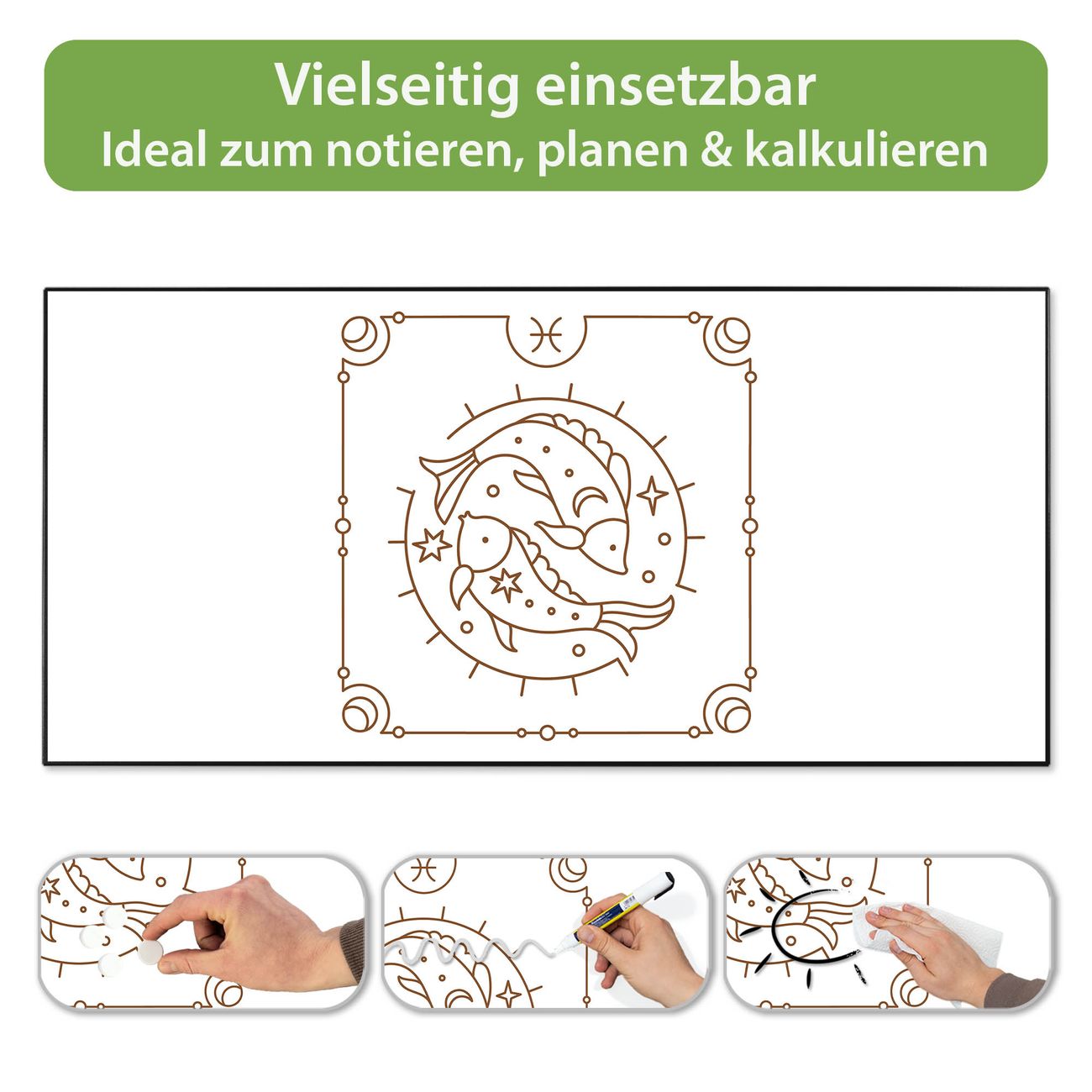 FUNKTION: Die banjado Magnettafel 78x37 cm im Design Motiv Sternzeichen Fische vereint Funktionalität und modernes Wohndesign auf stilvolle Weise. Diese hochwertige Magnetwand aus Metall hilft Ihnen dabei, Notizen, Fotos, Termine, Einkaufslisten oder Rezepte übersichtlich zu organisieren. Als praktisches Memoboard sorgt sie für Struktur im Alltag und setzt gleichzeitig einen dekorativen Akzent an Ihrer Wand. DESIGN: Die Metalltafel besteht aus robustem, lackiertem Stahl und ist mit allen handelsüblichen Magneten nutzbar. Besonders praktisch ist die beschreibbare Oberfläche. Sie können die Magnettafel ganz einfach mit Kreidestiften beschriften und die Inhalte bei Bedarf mit einem feuchten Tuch wieder entfernen. So eignet sich das Memoboard ideal für Wochenpläne, Menüpläne, To Do Listen oder kreative Botschaften. DETAILS: Mit ihrem großzügigen Querformat von 78x37 cm bietet die Magnettafel ausreichend Platz für Ihre Organisation. Das Motiv Motiv Sternzeichen Fische bringt eine warme, natürliche Optik in Küche, Flur, Büro oder Homeoffice und wirkt auch ohne Magnete oder Beschriftung wie ein modernes Wandbild. NUTZEN: Auf der Rückseite befinden sich vorgefertigte Löcher für eine schnelle und unkomplizierte Wandmontage. Jede banjado Magnettafel wird in Deutschland gefertigt und steht für Qualität, Langlebigkeit und liebevolle Verarbeitung. Dieses beschreibbare Memoboard ist die perfekte Kombination aus Metalltafel, Designobjekt und praktischer Magnetwand für Ihren Alltag. BANJADO: Wir sind ein kleines Team aus dem Herzen von Sachsen. Wir fertigen alle Artikel von Hand für Sie an, Sie erhalten keine preiswerte Importware. Auf Wunsch können Sie auch Ihr eigenes Foto auf die Magnettafel aufbringen, schreiben Sie uns an. Herzlichst, Ihr banjado-Team