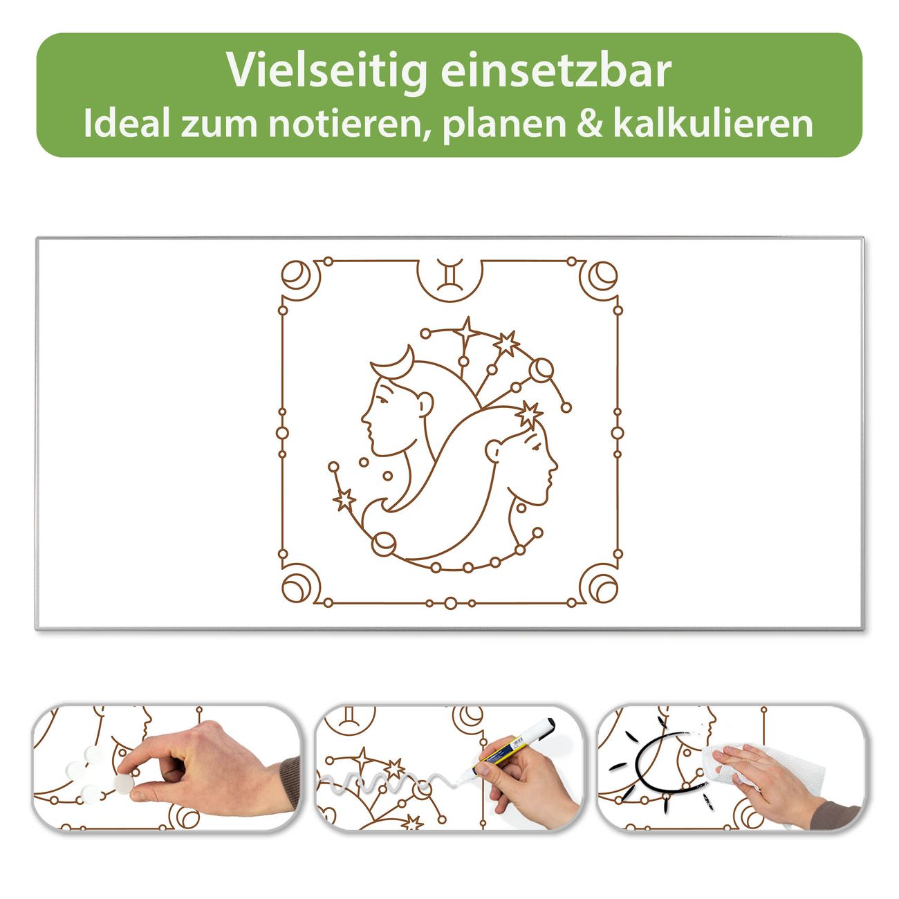 FUNKTION: Die banjado Magnettafel 78x37 cm im Design Motiv Sternzeichen Zwilling vereint Funktionalität und modernes Wohndesign auf stilvolle Weise. Diese hochwertige Magnetwand aus Metall hilft Ihnen dabei, Notizen, Fotos, Termine, Einkaufslisten oder Rezepte übersichtlich zu organisieren. Als praktisches Memoboard sorgt sie für Struktur im Alltag und setzt gleichzeitig einen dekorativen Akzent an Ihrer Wand. DESIGN: Die Metalltafel besteht aus robustem, lackiertem Stahl und ist mit allen handelsüblichen Magneten nutzbar. Besonders praktisch ist die beschreibbare Oberfläche. Sie können die Magnettafel ganz einfach mit Kreidestiften beschriften und die Inhalte bei Bedarf mit einem feuchten Tuch wieder entfernen. So eignet sich das Memoboard ideal für Wochenpläne, Menüpläne, To Do Listen oder kreative Botschaften. DETAILS: Mit ihrem großzügigen Querformat von 78x37 cm bietet die Magnettafel ausreichend Platz für Ihre Organisation. Das Motiv Motiv Sternzeichen Zwilling bringt eine warme, natürliche Optik in Küche, Flur, Büro oder Homeoffice und wirkt auch ohne Magnete oder Beschriftung wie ein modernes Wandbild. NUTZEN: Auf der Rückseite befinden sich vorgefertigte Löcher für eine schnelle und unkomplizierte Wandmontage. Jede banjado Magnettafel wird in Deutschland gefertigt und steht für Qualität, Langlebigkeit und liebevolle Verarbeitung. Dieses beschreibbare Memoboard ist die perfekte Kombination aus Metalltafel, Designobjekt und praktischer Magnetwand für Ihren Alltag. BANJADO: Wir sind ein kleines Team aus dem Herzen von Sachsen. Wir fertigen alle Artikel von Hand für Sie an, Sie erhalten keine preiswerte Importware. Auf Wunsch können Sie auch Ihr eigenes Foto auf die Magnettafel aufbringen, schreiben Sie uns an. Herzlichst, Ihr banjado-Team