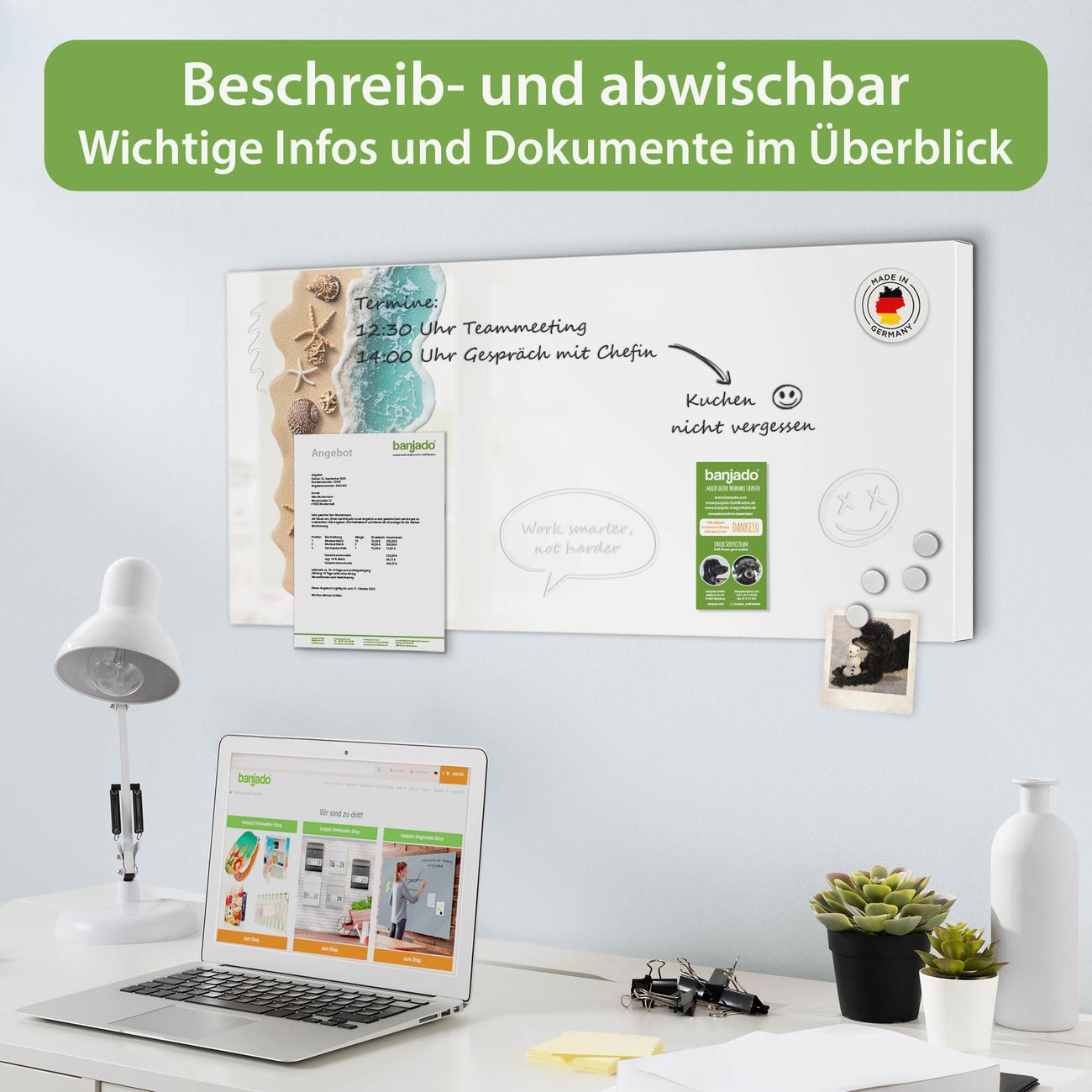 FUNKTION: Die banjado Magnettafel 78x37 cm im Design Motiv Strandparadies vereint Funktionalität und modernes Wohndesign auf stilvolle Weise. Diese hochwertige Magnetwand aus Metall hilft Ihnen dabei, Notizen, Fotos, Termine, Einkaufslisten oder Rezepte übersichtlich zu organisieren. Als praktisches Memoboard sorgt sie für Struktur im Alltag und setzt gleichzeitig einen dekorativen Akzent an Ihrer Wand. DESIGN: Die Metalltafel besteht aus robustem, lackiertem Stahl und ist mit allen handelsüblichen Magneten nutzbar. Besonders praktisch ist die beschreibbare Oberfläche. Sie können die Magnettafel ganz einfach mit Kreidestiften beschriften und die Inhalte bei Bedarf mit einem feuchten Tuch wieder entfernen. So eignet sich das Memoboard ideal für Wochenpläne, Menüpläne, To Do Listen oder kreative Botschaften. DETAILS: Mit ihrem großzügigen Querformat von 78x37 cm bietet die Magnettafel ausreichend Platz für Ihre Organisation. Das Motiv Motiv Strandparadies bringt eine warme, natürliche Optik in Küche, Flur, Büro oder Homeoffice und wirkt auch ohne Magnete oder Beschriftung wie ein modernes Wandbild. NUTZEN: Auf der Rückseite befinden sich vorgefertigte Löcher für eine schnelle und unkomplizierte Wandmontage. Jede banjado Magnettafel wird in Deutschland gefertigt und steht für Qualität, Langlebigkeit und liebevolle Verarbeitung. Dieses beschreibbare Memoboard ist die perfekte Kombination aus Metalltafel, Designobjekt und praktischer Magnetwand für Ihren Alltag. BANJADO: Wir sind ein kleines Team aus dem Herzen von Sachsen. Wir fertigen alle Artikel von Hand für Sie an, Sie erhalten keine preiswerte Importware. Auf Wunsch können Sie auch Ihr eigenes Foto auf die Magnettafel aufbringen, schreiben Sie uns an. Herzlichst, Ihr banjado-Team