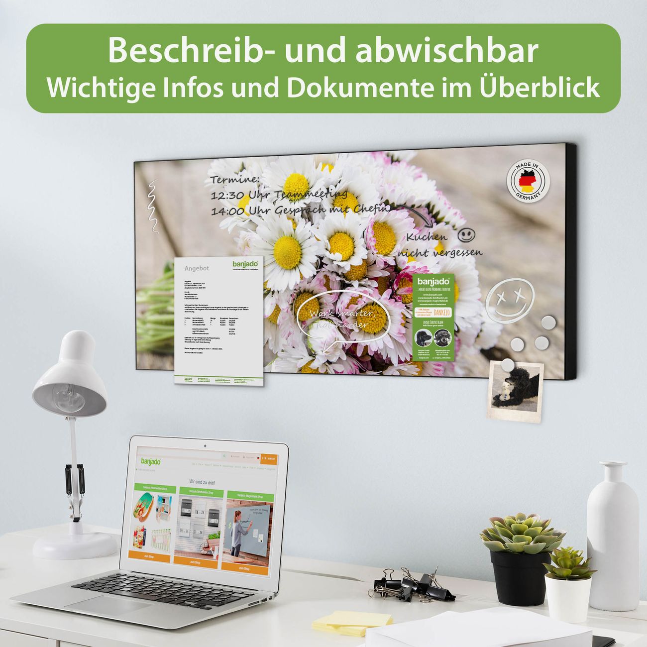 FUNKTION: Die banjado Magnettafel 78x37 cm im Design Motiv Strauß Gänseblümchen vereint Funktionalität und modernes Wohndesign auf stilvolle Weise. Diese hochwertige Magnetwand aus Metall hilft Ihnen dabei, Notizen, Fotos, Termine, Einkaufslisten oder Rezepte übersichtlich zu organisieren. Als praktisches Memoboard sorgt sie für Struktur im Alltag und setzt gleichzeitig einen dekorativen Akzent an Ihrer Wand. DESIGN: Die Metalltafel besteht aus robustem, lackiertem Stahl und ist mit allen handelsüblichen Magneten nutzbar. Besonders praktisch ist die beschreibbare Oberfläche. Sie können die Magnettafel ganz einfach mit Kreidestiften beschriften und die Inhalte bei Bedarf mit einem feuchten Tuch wieder entfernen. So eignet sich das Memoboard ideal für Wochenpläne, Menüpläne, To Do Listen oder kreative Botschaften. DETAILS: Mit ihrem großzügigen Querformat von 78x37 cm bietet die Magnettafel ausreichend Platz für Ihre Organisation. Das Motiv Motiv Strauß Gänseblümchen bringt eine warme, natürliche Optik in Küche, Flur, Büro oder Homeoffice und wirkt auch ohne Magnete oder Beschriftung wie ein modernes Wandbild. NUTZEN: Auf der Rückseite befinden sich vorgefertigte Löcher für eine schnelle und unkomplizierte Wandmontage. Jede banjado Magnettafel wird in Deutschland gefertigt und steht für Qualität, Langlebigkeit und liebevolle Verarbeitung. Dieses beschreibbare Memoboard ist die perfekte Kombination aus Metalltafel, Designobjekt und praktischer Magnetwand für Ihren Alltag. BANJADO: Wir sind ein kleines Team aus dem Herzen von Sachsen. Wir fertigen alle Artikel von Hand für Sie an, Sie erhalten keine preiswerte Importware. Auf Wunsch können Sie auch Ihr eigenes Foto auf die Magnettafel aufbringen, schreiben Sie uns an. Herzlichst, Ihr banjado-Team