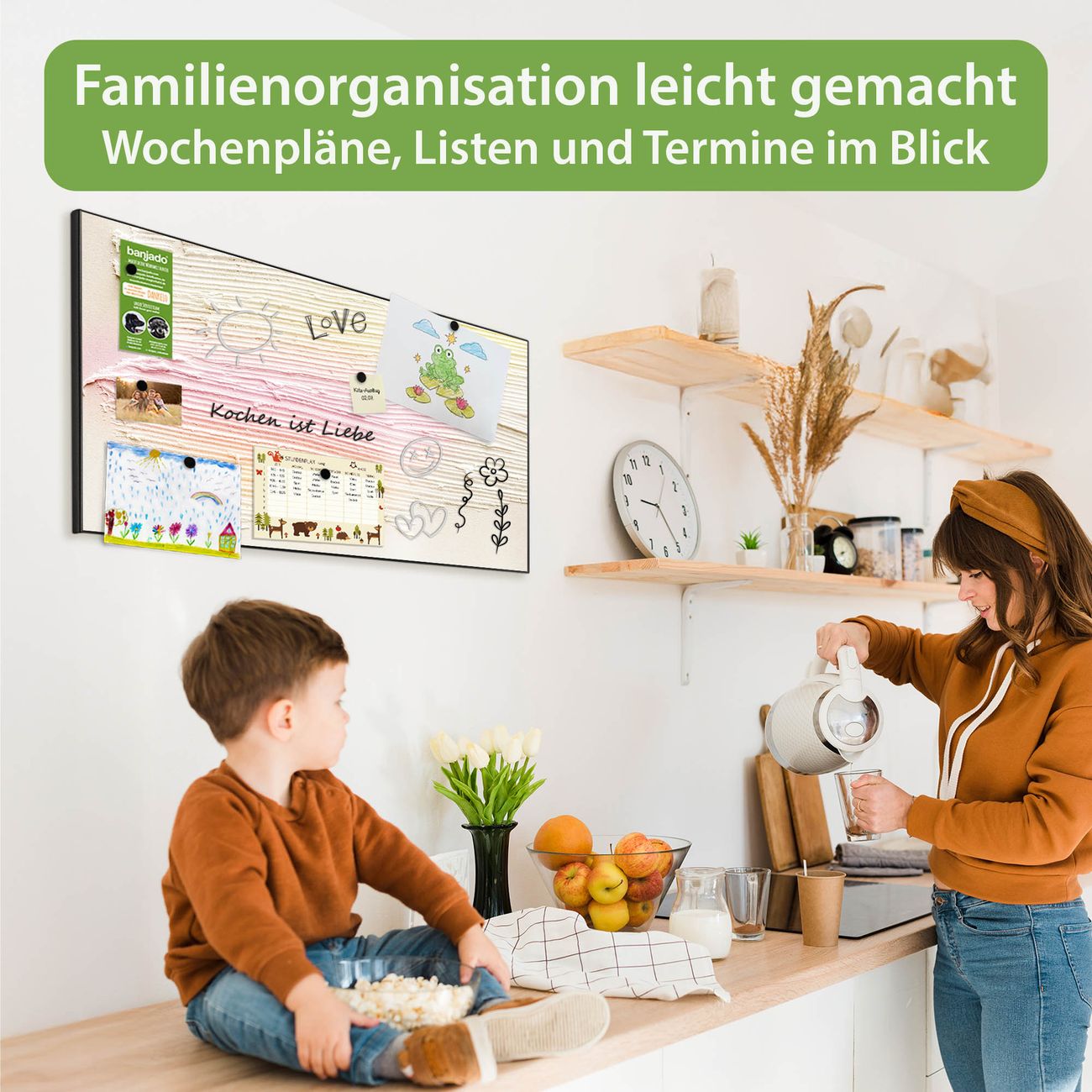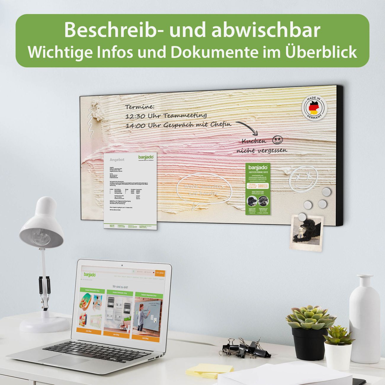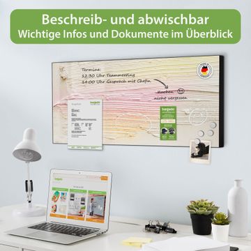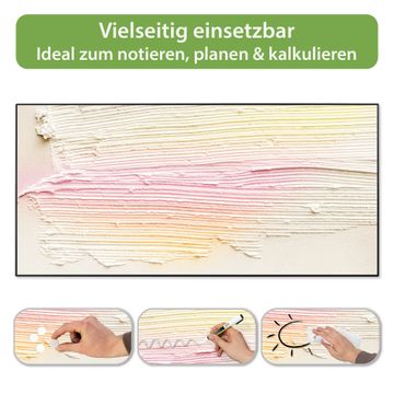 FUNKTION: Die banjado Magnettafel 78x37 cm im Design Motiv Struktur Pastell vereint Funktionalität und modernes Wohndesign auf stilvolle Weise. Diese hochwertige Magnetwand aus Metall hilft Ihnen dabei, Notizen, Fotos, Termine, Einkaufslisten oder Rezepte übersichtlich zu organisieren. Als praktisches Memoboard sorgt sie für Struktur im Alltag und setzt gleichzeitig einen dekorativen Akzent an Ihrer Wand. DESIGN: Die Metalltafel besteht aus robustem, lackiertem Stahl und ist mit allen handelsüblichen Magneten nutzbar. Besonders praktisch ist die beschreibbare Oberfläche. Sie können die Magnettafel ganz einfach mit Kreidestiften beschriften und die Inhalte bei Bedarf mit einem feuchten Tuch wieder entfernen. So eignet sich das Memoboard ideal für Wochenpläne, Menüpläne, To Do Listen oder kreative Botschaften. DETAILS: Mit ihrem großzügigen Querformat von 78x37 cm bietet die Magnettafel ausreichend Platz für Ihre Organisation. Das Motiv Motiv Struktur Pastell bringt eine warme, natürliche Optik in Küche, Flur, Büro oder Homeoffice und wirkt auch ohne Magnete oder Beschriftung wie ein modernes Wandbild. NUTZEN: Auf der Rückseite befinden sich vorgefertigte Löcher für eine schnelle und unkomplizierte Wandmontage. Jede banjado Magnettafel wird in Deutschland gefertigt und steht für Qualität, Langlebigkeit und liebevolle Verarbeitung. Dieses beschreibbare Memoboard ist die perfekte Kombination aus Metalltafel, Designobjekt und praktischer Magnetwand für Ihren Alltag. BANJADO: Wir sind ein kleines Team aus dem Herzen von Sachsen. Wir fertigen alle Artikel von Hand für Sie an, Sie erhalten keine preiswerte Importware. Auf Wunsch können Sie auch Ihr eigenes Foto auf die Magnettafel aufbringen, schreiben Sie uns an. Herzlichst, Ihr banjado-Team