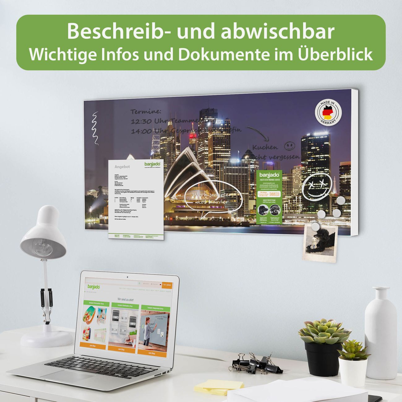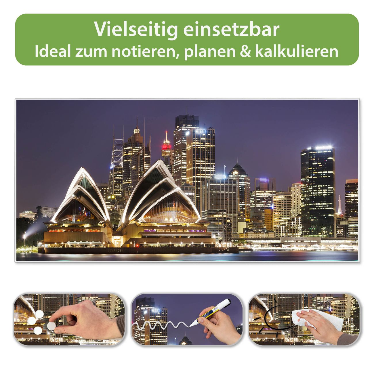 FUNKTION: Die banjado Magnettafel 78x37 cm im Design Motiv Sydney vereint Funktionalität und modernes Wohndesign auf stilvolle Weise. Diese hochwertige Magnetwand aus Metall hilft Ihnen dabei, Notizen, Fotos, Termine, Einkaufslisten oder Rezepte übersichtlich zu organisieren. Als praktisches Memoboard sorgt sie für Struktur im Alltag und setzt gleichzeitig einen dekorativen Akzent an Ihrer Wand. DESIGN: Die Metalltafel besteht aus robustem, lackiertem Stahl und ist mit allen handelsüblichen Magneten nutzbar. Besonders praktisch ist die beschreibbare Oberfläche. Sie können die Magnettafel ganz einfach mit Kreidestiften beschriften und die Inhalte bei Bedarf mit einem feuchten Tuch wieder entfernen. So eignet sich das Memoboard ideal für Wochenpläne, Menüpläne, To Do Listen oder kreative Botschaften. DETAILS: Mit ihrem großzügigen Querformat von 78x37 cm bietet die Magnettafel ausreichend Platz für Ihre Organisation. Das Motiv Motiv Sydney bringt eine warme, natürliche Optik in Küche, Flur, Büro oder Homeoffice und wirkt auch ohne Magnete oder Beschriftung wie ein modernes Wandbild. NUTZEN: Auf der Rückseite befinden sich vorgefertigte Löcher für eine schnelle und unkomplizierte Wandmontage. Jede banjado Magnettafel wird in Deutschland gefertigt und steht für Qualität, Langlebigkeit und liebevolle Verarbeitung. Dieses beschreibbare Memoboard ist die perfekte Kombination aus Metalltafel, Designobjekt und praktischer Magnetwand für Ihren Alltag. BANJADO: Wir sind ein kleines Team aus dem Herzen von Sachsen. Wir fertigen alle Artikel von Hand für Sie an, Sie erhalten keine preiswerte Importware. Auf Wunsch können Sie auch Ihr eigenes Foto auf die Magnettafel aufbringen, schreiben Sie uns an. Herzlichst, Ihr banjado-Team