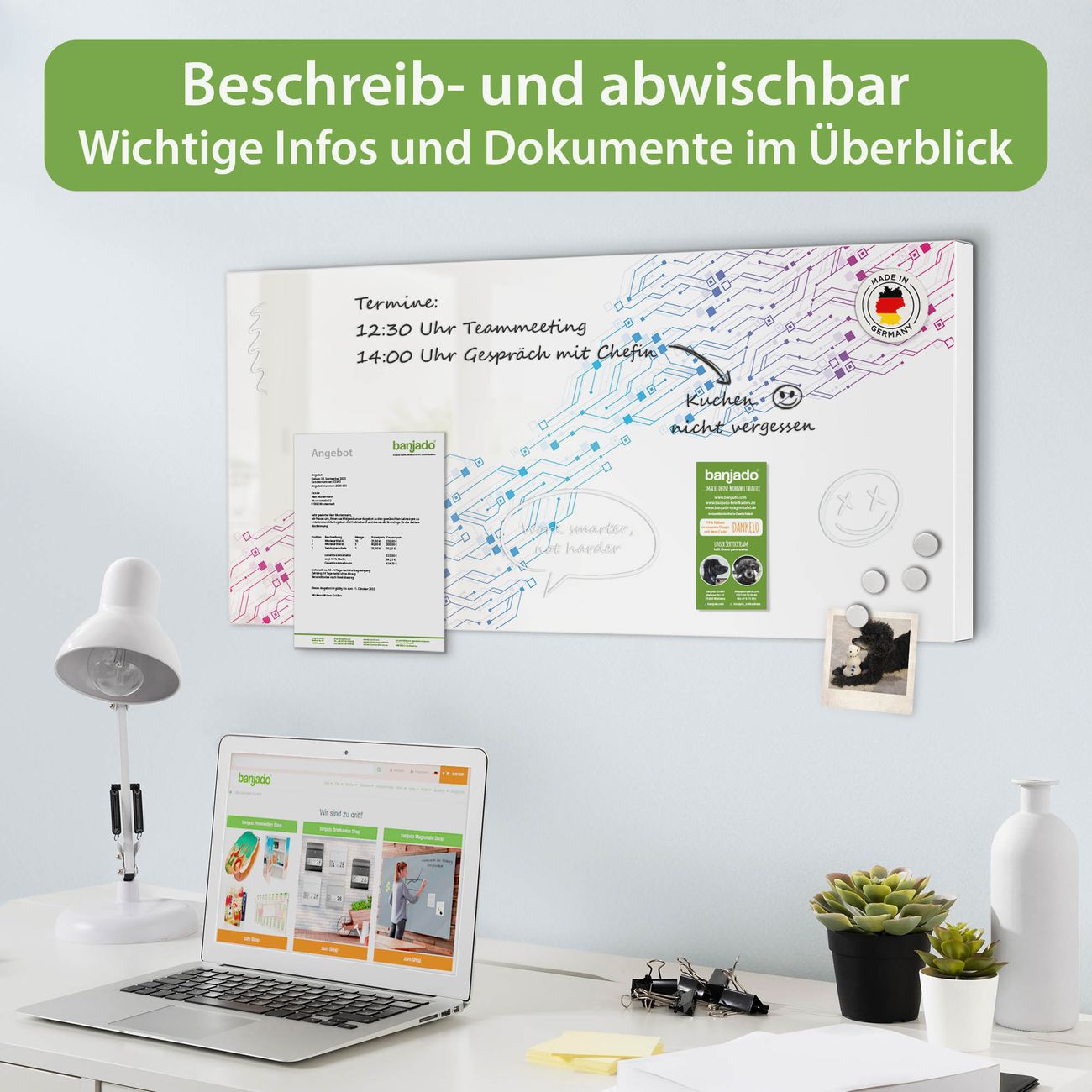 FUNKTION: Die banjado Magnettafel 78x37 cm im Design Motiv Technologiemuster vereint Funktionalität und modernes Wohndesign auf stilvolle Weise. Diese hochwertige Magnetwand aus Metall hilft Ihnen dabei, Notizen, Fotos, Termine, Einkaufslisten oder Rezepte übersichtlich zu organisieren. Als praktisches Memoboard sorgt sie für Struktur im Alltag und setzt gleichzeitig einen dekorativen Akzent an Ihrer Wand. DESIGN: Die Metalltafel besteht aus robustem, lackiertem Stahl und ist mit allen handelsüblichen Magneten nutzbar. Besonders praktisch ist die beschreibbare Oberfläche. Sie können die Magnettafel ganz einfach mit Kreidestiften beschriften und die Inhalte bei Bedarf mit einem feuchten Tuch wieder entfernen. So eignet sich das Memoboard ideal für Wochenpläne, Menüpläne, To Do Listen oder kreative Botschaften. DETAILS: Mit ihrem großzügigen Querformat von 78x37 cm bietet die Magnettafel ausreichend Platz für Ihre Organisation. Das Motiv Motiv Technologiemuster bringt eine warme, natürliche Optik in Küche, Flur, Büro oder Homeoffice und wirkt auch ohne Magnete oder Beschriftung wie ein modernes Wandbild. NUTZEN: Auf der Rückseite befinden sich vorgefertigte Löcher für eine schnelle und unkomplizierte Wandmontage. Jede banjado Magnettafel wird in Deutschland gefertigt und steht für Qualität, Langlebigkeit und liebevolle Verarbeitung. Dieses beschreibbare Memoboard ist die perfekte Kombination aus Metalltafel, Designobjekt und praktischer Magnetwand für Ihren Alltag. BANJADO: Wir sind ein kleines Team aus dem Herzen von Sachsen. Wir fertigen alle Artikel von Hand für Sie an, Sie erhalten keine preiswerte Importware. Auf Wunsch können Sie auch Ihr eigenes Foto auf die Magnettafel aufbringen, schreiben Sie uns an. Herzlichst, Ihr banjado-Team