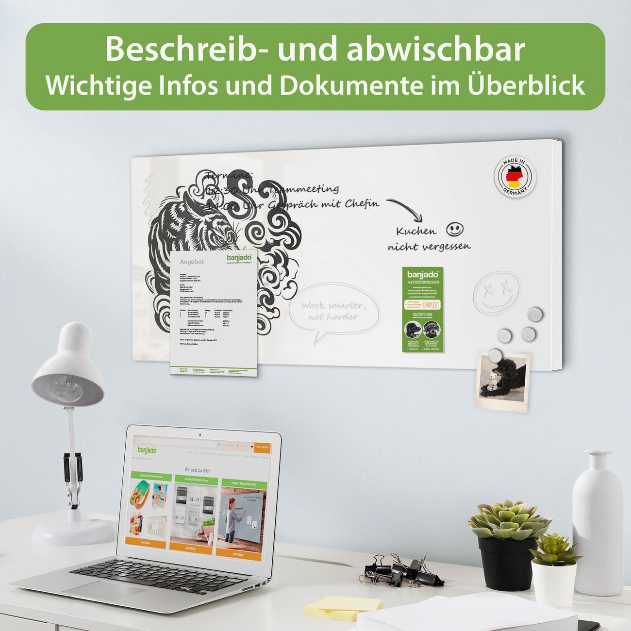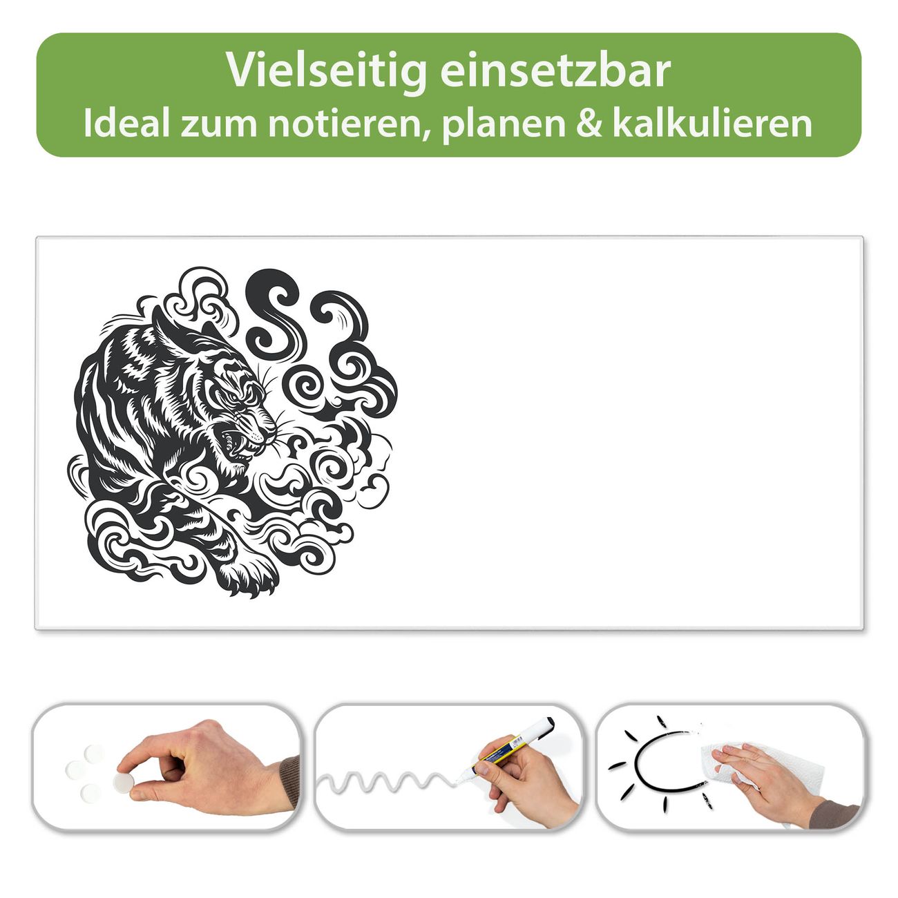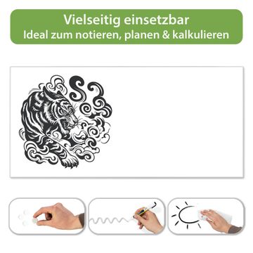 FUNKTION: Die banjado Magnettafel 78x37 cm im Design Motiv Tiger Silhouette vereint Funktionalität und modernes Wohndesign auf stilvolle Weise. Diese hochwertige Magnetwand aus Metall hilft Ihnen dabei, Notizen, Fotos, Termine, Einkaufslisten oder Rezepte übersichtlich zu organisieren. Als praktisches Memoboard sorgt sie für Struktur im Alltag und setzt gleichzeitig einen dekorativen Akzent an Ihrer Wand. DESIGN: Die Metalltafel besteht aus robustem, lackiertem Stahl und ist mit allen handelsüblichen Magneten nutzbar. Besonders praktisch ist die beschreibbare Oberfläche. Sie können die Magnettafel ganz einfach mit Kreidestiften beschriften und die Inhalte bei Bedarf mit einem feuchten Tuch wieder entfernen. So eignet sich das Memoboard ideal für Wochenpläne, Menüpläne, To Do Listen oder kreative Botschaften. DETAILS: Mit ihrem großzügigen Querformat von 78x37 cm bietet die Magnettafel ausreichend Platz für Ihre Organisation. Das Motiv Motiv Tiger Silhouette bringt eine warme, natürliche Optik in Küche, Flur, Büro oder Homeoffice und wirkt auch ohne Magnete oder Beschriftung wie ein modernes Wandbild. NUTZEN: Auf der Rückseite befinden sich vorgefertigte Löcher für eine schnelle und unkomplizierte Wandmontage. Jede banjado Magnettafel wird in Deutschland gefertigt und steht für Qualität, Langlebigkeit und liebevolle Verarbeitung. Dieses beschreibbare Memoboard ist die perfekte Kombination aus Metalltafel, Designobjekt und praktischer Magnetwand für Ihren Alltag. BANJADO: Wir sind ein kleines Team aus dem Herzen von Sachsen. Wir fertigen alle Artikel von Hand für Sie an, Sie erhalten keine preiswerte Importware. Auf Wunsch können Sie auch Ihr eigenes Foto auf die Magnettafel aufbringen, schreiben Sie uns an. Herzlichst, Ihr banjado-Team