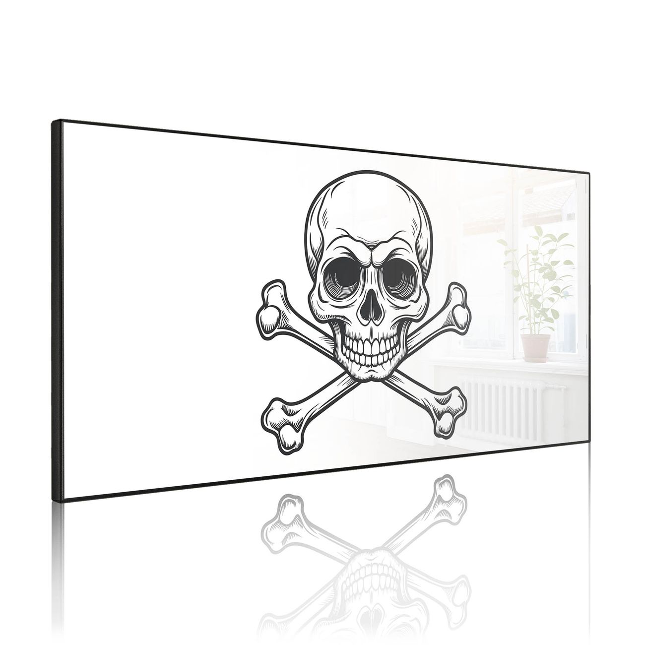 FUNKTION: Die banjado Magnettafel 78x37 cm im Design Motiv Totenkopfsymbol vereint Funktionalität und modernes Wohndesign auf stilvolle Weise. Diese hochwertige Magnetwand aus Metall hilft Ihnen dabei, Notizen, Fotos, Termine, Einkaufslisten oder Rezepte übersichtlich zu organisieren. Als praktisches Memoboard sorgt sie für Struktur im Alltag und setzt gleichzeitig einen dekorativen Akzent an Ihrer Wand. DESIGN: Die Metalltafel besteht aus robustem, lackiertem Stahl und ist mit allen handelsüblichen Magneten nutzbar. Besonders praktisch ist die beschreibbare Oberfläche. Sie können die Magnettafel ganz einfach mit Kreidestiften beschriften und die Inhalte bei Bedarf mit einem feuchten Tuch wieder entfernen. So eignet sich das Memoboard ideal für Wochenpläne, Menüpläne, To Do Listen oder kreative Botschaften. DETAILS: Mit ihrem großzügigen Querformat von 78x37 cm bietet die Magnettafel ausreichend Platz für Ihre Organisation. Das Motiv Motiv Totenkopfsymbol bringt eine warme, natürliche Optik in Küche, Flur, Büro oder Homeoffice und wirkt auch ohne Magnete oder Beschriftung wie ein modernes Wandbild. NUTZEN: Auf der Rückseite befinden sich vorgefertigte Löcher für eine schnelle und unkomplizierte Wandmontage. Jede banjado Magnettafel wird in Deutschland gefertigt und steht für Qualität, Langlebigkeit und liebevolle Verarbeitung. Dieses beschreibbare Memoboard ist die perfekte Kombination aus Metalltafel, Designobjekt und praktischer Magnetwand für Ihren Alltag. BANJADO: Wir sind ein kleines Team aus dem Herzen von Sachsen. Wir fertigen alle Artikel von Hand für Sie an, Sie erhalten keine preiswerte Importware. Auf Wunsch können Sie auch Ihr eigenes Foto auf die Magnettafel aufbringen, schreiben Sie uns an. Herzlichst, Ihr banjado-Team