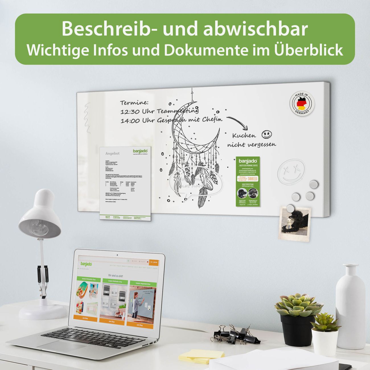 FUNKTION: Die banjado Magnettafel 78x37 cm im Design Motiv Traumfänger 2 vereint Funktionalität und modernes Wohndesign auf stilvolle Weise. Diese hochwertige Magnetwand aus Metall hilft Ihnen dabei, Notizen, Fotos, Termine, Einkaufslisten oder Rezepte übersichtlich zu organisieren. Als praktisches Memoboard sorgt sie für Struktur im Alltag und setzt gleichzeitig einen dekorativen Akzent an Ihrer Wand. DESIGN: Die Metalltafel besteht aus robustem, lackiertem Stahl und ist mit allen handelsüblichen Magneten nutzbar. Besonders praktisch ist die beschreibbare Oberfläche. Sie können die Magnettafel ganz einfach mit Kreidestiften beschriften und die Inhalte bei Bedarf mit einem feuchten Tuch wieder entfernen. So eignet sich das Memoboard ideal für Wochenpläne, Menüpläne, To Do Listen oder kreative Botschaften. DETAILS: Mit ihrem großzügigen Querformat von 78x37 cm bietet die Magnettafel ausreichend Platz für Ihre Organisation. Das Motiv Motiv Traumfänger 2 bringt eine warme, natürliche Optik in Küche, Flur, Büro oder Homeoffice und wirkt auch ohne Magnete oder Beschriftung wie ein modernes Wandbild. NUTZEN: Auf der Rückseite befinden sich vorgefertigte Löcher für eine schnelle und unkomplizierte Wandmontage. Jede banjado Magnettafel wird in Deutschland gefertigt und steht für Qualität, Langlebigkeit und liebevolle Verarbeitung. Dieses beschreibbare Memoboard ist die perfekte Kombination aus Metalltafel, Designobjekt und praktischer Magnetwand für Ihren Alltag. BANJADO: Wir sind ein kleines Team aus dem Herzen von Sachsen. Wir fertigen alle Artikel von Hand für Sie an, Sie erhalten keine preiswerte Importware. Auf Wunsch können Sie auch Ihr eigenes Foto auf die Magnettafel aufbringen, schreiben Sie uns an. Herzlichst, Ihr banjado-Team