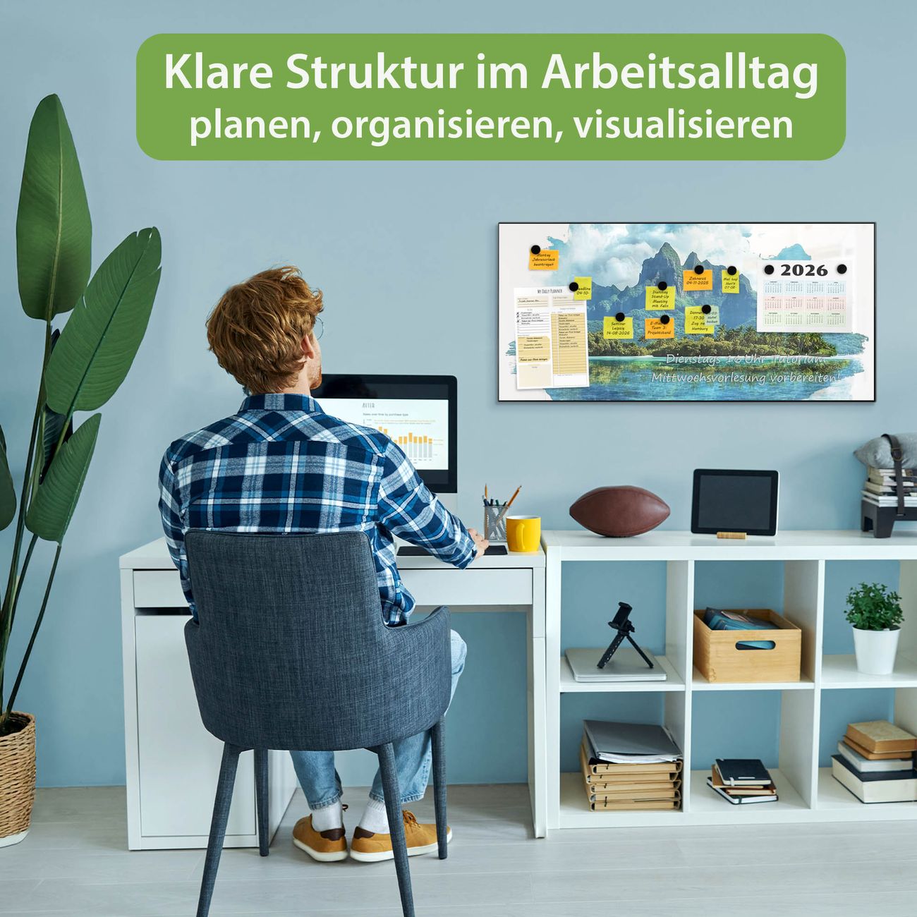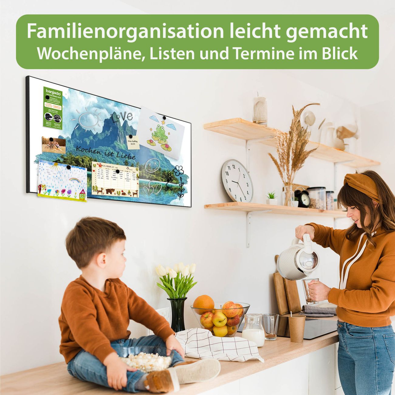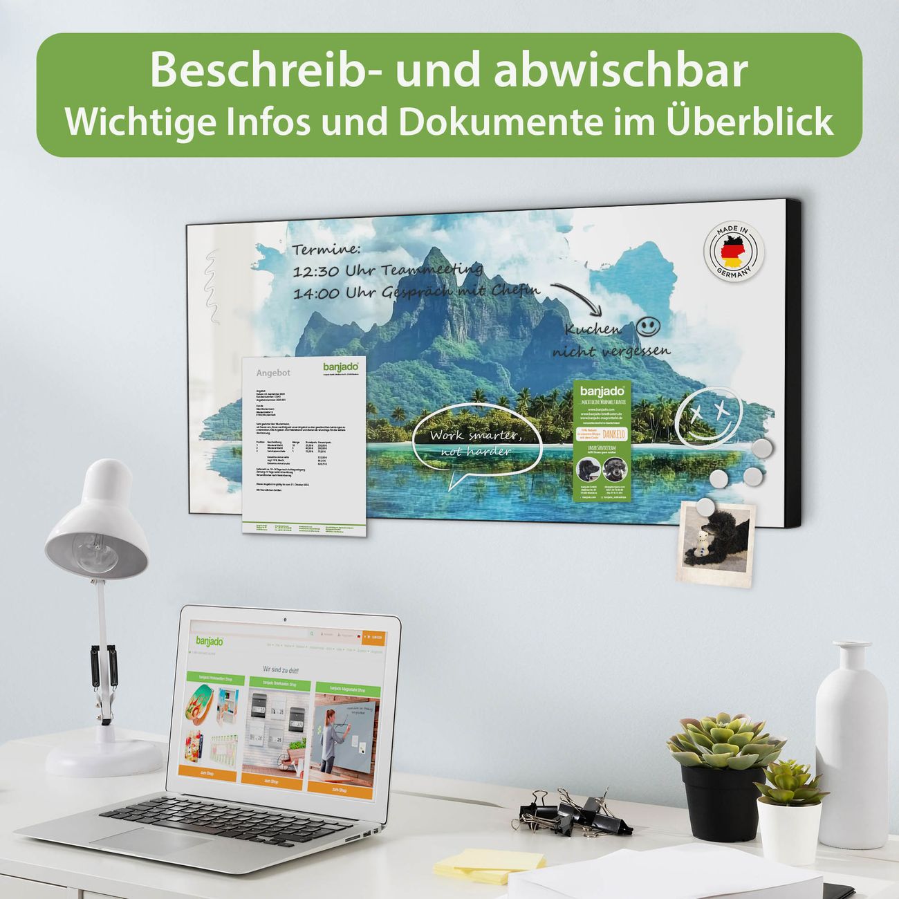FUNKTION: Die banjado Magnettafel 78x37 cm im Design Motiv Tropenparadies vereint Funktionalität und modernes Wohndesign auf stilvolle Weise. Diese hochwertige Magnetwand aus Metall hilft Ihnen dabei, Notizen, Fotos, Termine, Einkaufslisten oder Rezepte übersichtlich zu organisieren. Als praktisches Memoboard sorgt sie für Struktur im Alltag und setzt gleichzeitig einen dekorativen Akzent an Ihrer Wand. DESIGN: Die Metalltafel besteht aus robustem, lackiertem Stahl und ist mit allen handelsüblichen Magneten nutzbar. Besonders praktisch ist die beschreibbare Oberfläche. Sie können die Magnettafel ganz einfach mit Kreidestiften beschriften und die Inhalte bei Bedarf mit einem feuchten Tuch wieder entfernen. So eignet sich das Memoboard ideal für Wochenpläne, Menüpläne, To Do Listen oder kreative Botschaften. DETAILS: Mit ihrem großzügigen Querformat von 78x37 cm bietet die Magnettafel ausreichend Platz für Ihre Organisation. Das Motiv Motiv Tropenparadies bringt eine warme, natürliche Optik in Küche, Flur, Büro oder Homeoffice und wirkt auch ohne Magnete oder Beschriftung wie ein modernes Wandbild. NUTZEN: Auf der Rückseite befinden sich vorgefertigte Löcher für eine schnelle und unkomplizierte Wandmontage. Jede banjado Magnettafel wird in Deutschland gefertigt und steht für Qualität, Langlebigkeit und liebevolle Verarbeitung. Dieses beschreibbare Memoboard ist die perfekte Kombination aus Metalltafel, Designobjekt und praktischer Magnetwand für Ihren Alltag. BANJADO: Wir sind ein kleines Team aus dem Herzen von Sachsen. Wir fertigen alle Artikel von Hand für Sie an, Sie erhalten keine preiswerte Importware. Auf Wunsch können Sie auch Ihr eigenes Foto auf die Magnettafel aufbringen, schreiben Sie uns an. Herzlichst, Ihr banjado-Team