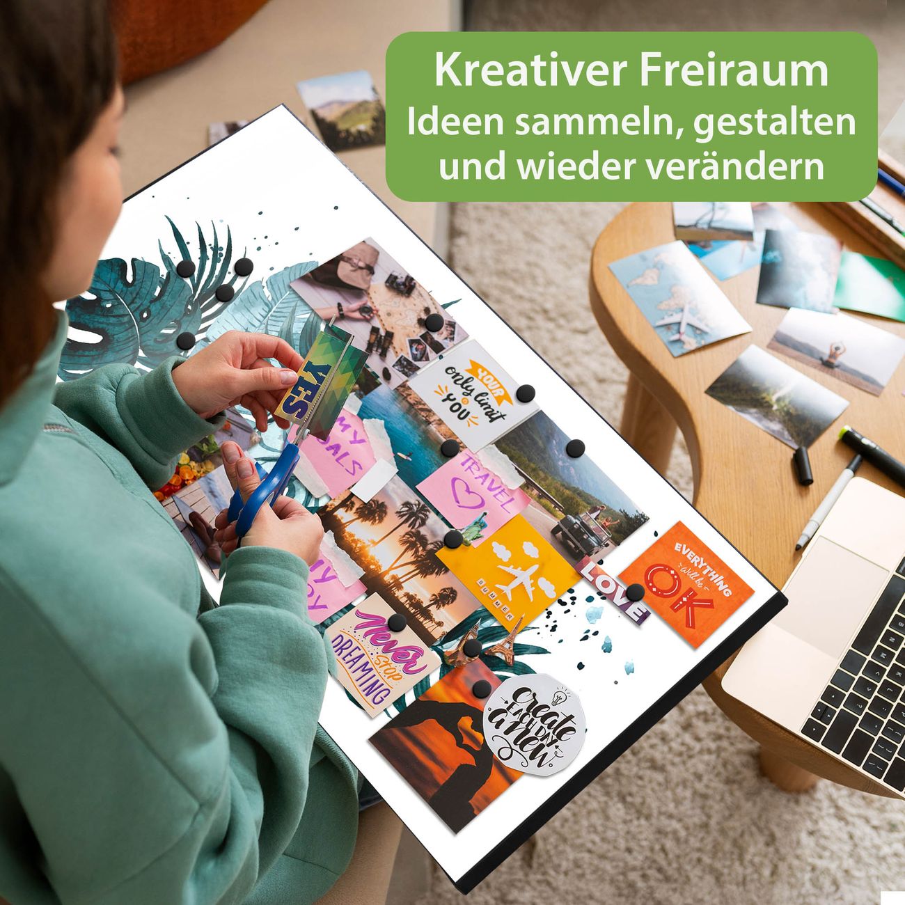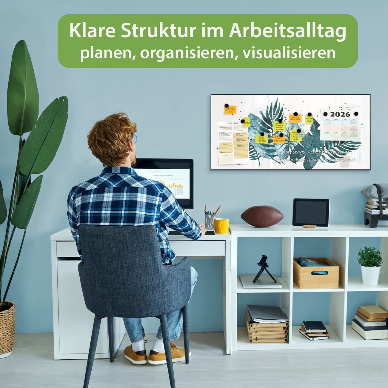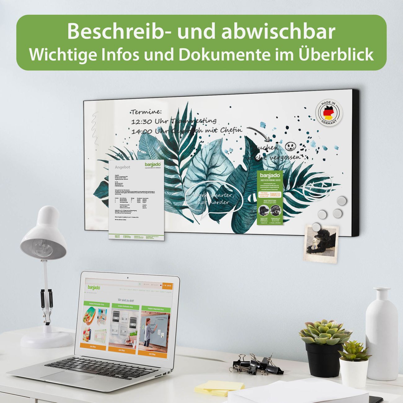 FUNKTION: Die banjado Magnettafel 78x37 cm im Design Motiv Tropisches Aquarell vereint Funktionalität und modernes Wohndesign auf stilvolle Weise. Diese hochwertige Magnetwand aus Metall hilft Ihnen dabei, Notizen, Fotos, Termine, Einkaufslisten oder Rezepte übersichtlich zu organisieren. Als praktisches Memoboard sorgt sie für Struktur im Alltag und setzt gleichzeitig einen dekorativen Akzent an Ihrer Wand. DESIGN: Die Metalltafel besteht aus robustem, lackiertem Stahl und ist mit allen handelsüblichen Magneten nutzbar. Besonders praktisch ist die beschreibbare Oberfläche. Sie können die Magnettafel ganz einfach mit Kreidestiften beschriften und die Inhalte bei Bedarf mit einem feuchten Tuch wieder entfernen. So eignet sich das Memoboard ideal für Wochenpläne, Menüpläne, To Do Listen oder kreative Botschaften. DETAILS: Mit ihrem großzügigen Querformat von 78x37 cm bietet die Magnettafel ausreichend Platz für Ihre Organisation. Das Motiv Motiv Tropisches Aquarell bringt eine warme, natürliche Optik in Küche, Flur, Büro oder Homeoffice und wirkt auch ohne Magnete oder Beschriftung wie ein modernes Wandbild. NUTZEN: Auf der Rückseite befinden sich vorgefertigte Löcher für eine schnelle und unkomplizierte Wandmontage. Jede banjado Magnettafel wird in Deutschland gefertigt und steht für Qualität, Langlebigkeit und liebevolle Verarbeitung. Dieses beschreibbare Memoboard ist die perfekte Kombination aus Metalltafel, Designobjekt und praktischer Magnetwand für Ihren Alltag. BANJADO: Wir sind ein kleines Team aus dem Herzen von Sachsen. Wir fertigen alle Artikel von Hand für Sie an, Sie erhalten keine preiswerte Importware. Auf Wunsch können Sie auch Ihr eigenes Foto auf die Magnettafel aufbringen, schreiben Sie uns an. Herzlichst, Ihr banjado-Team