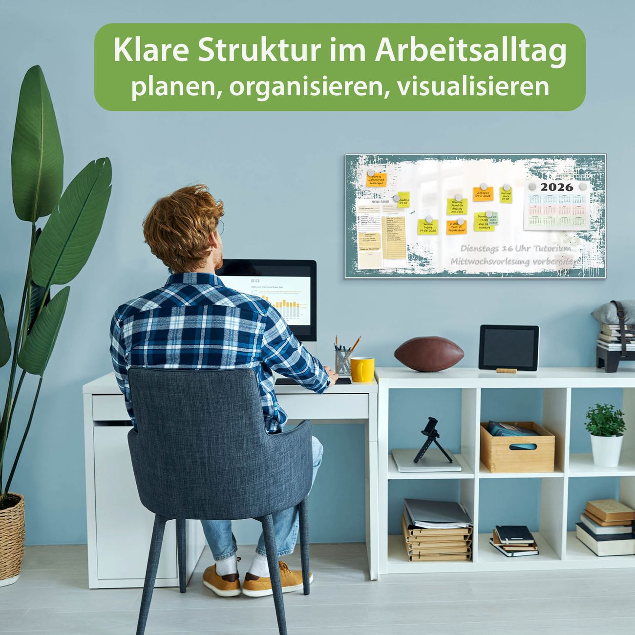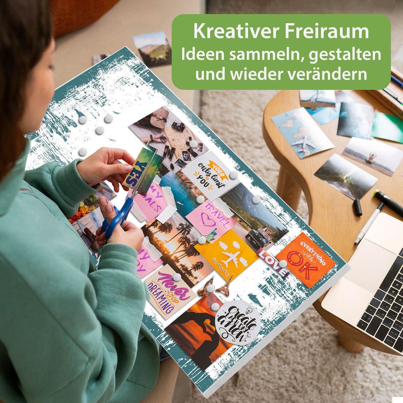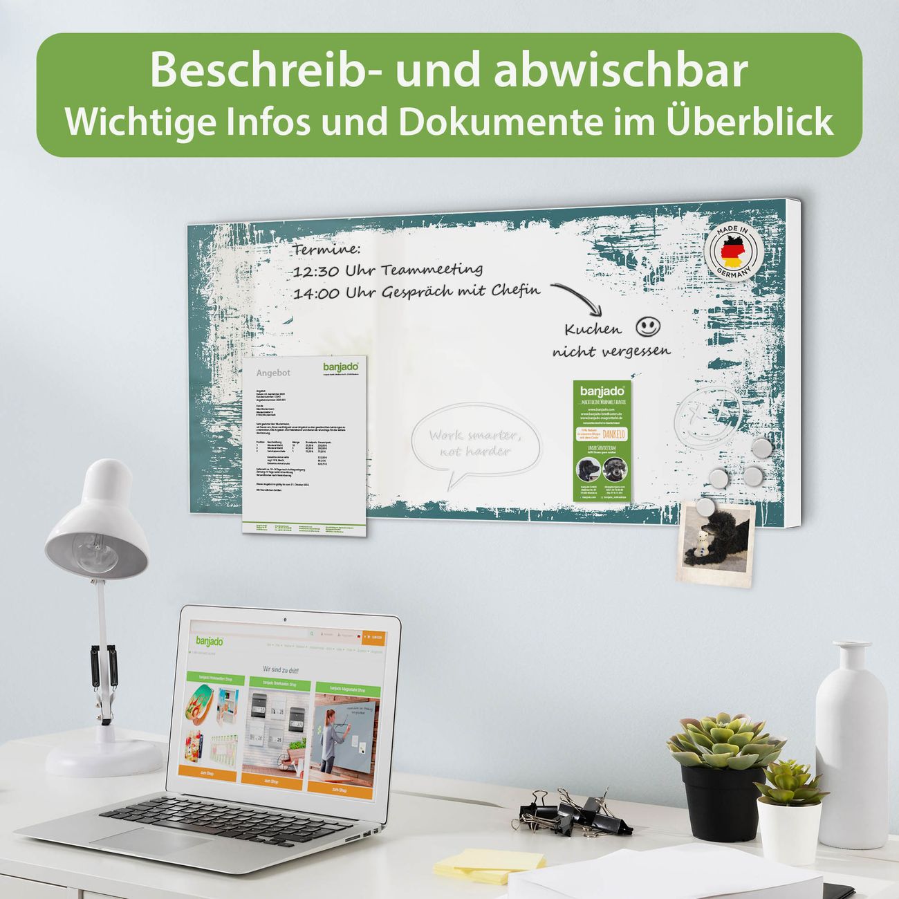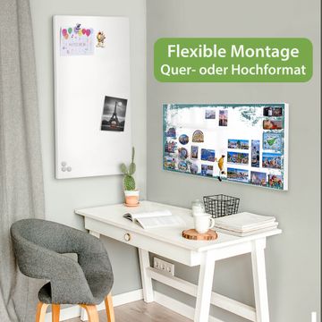 FUNKTION: Die banjado Magnettafel 78x37 cm im Design Motiv Türkis-Weiße Rahmenstruktur vereint Funktionalität und modernes Wohndesign auf stilvolle Weise. Diese hochwertige Magnetwand aus Metall hilft Ihnen dabei, Notizen, Fotos, Termine, Einkaufslisten oder Rezepte übersichtlich zu organisieren. Als praktisches Memoboard sorgt sie für Struktur im Alltag und setzt gleichzeitig einen dekorativen Akzent an Ihrer Wand. DESIGN: Die Metalltafel besteht aus robustem, lackiertem Stahl und ist mit allen handelsüblichen Magneten nutzbar. Besonders praktisch ist die beschreibbare Oberfläche. Sie können die Magnettafel ganz einfach mit Kreidestiften beschriften und die Inhalte bei Bedarf mit einem feuchten Tuch wieder entfernen. So eignet sich das Memoboard ideal für Wochenpläne, Menüpläne, To Do Listen oder kreative Botschaften. DETAILS: Mit ihrem großzügigen Querformat von 78x37 cm bietet die Magnettafel ausreichend Platz für Ihre Organisation. Das Motiv Motiv Türkis-Weiße Rahmenstruktur bringt eine warme, natürliche Optik in Küche, Flur, Büro oder Homeoffice und wirkt auch ohne Magnete oder Beschriftung wie ein modernes Wandbild. NUTZEN: Auf der Rückseite befinden sich vorgefertigte Löcher für eine schnelle und unkomplizierte Wandmontage. Jede banjado Magnettafel wird in Deutschland gefertigt und steht für Qualität, Langlebigkeit und liebevolle Verarbeitung. Dieses beschreibbare Memoboard ist die perfekte Kombination aus Metalltafel, Designobjekt und praktischer Magnetwand für Ihren Alltag. BANJADO: Wir sind ein kleines Team aus dem Herzen von Sachsen. Wir fertigen alle Artikel von Hand für Sie an, Sie erhalten keine preiswerte Importware. Auf Wunsch können Sie auch Ihr eigenes Foto auf die Magnettafel aufbringen, schreiben Sie uns an. Herzlichst, Ihr banjado-Team