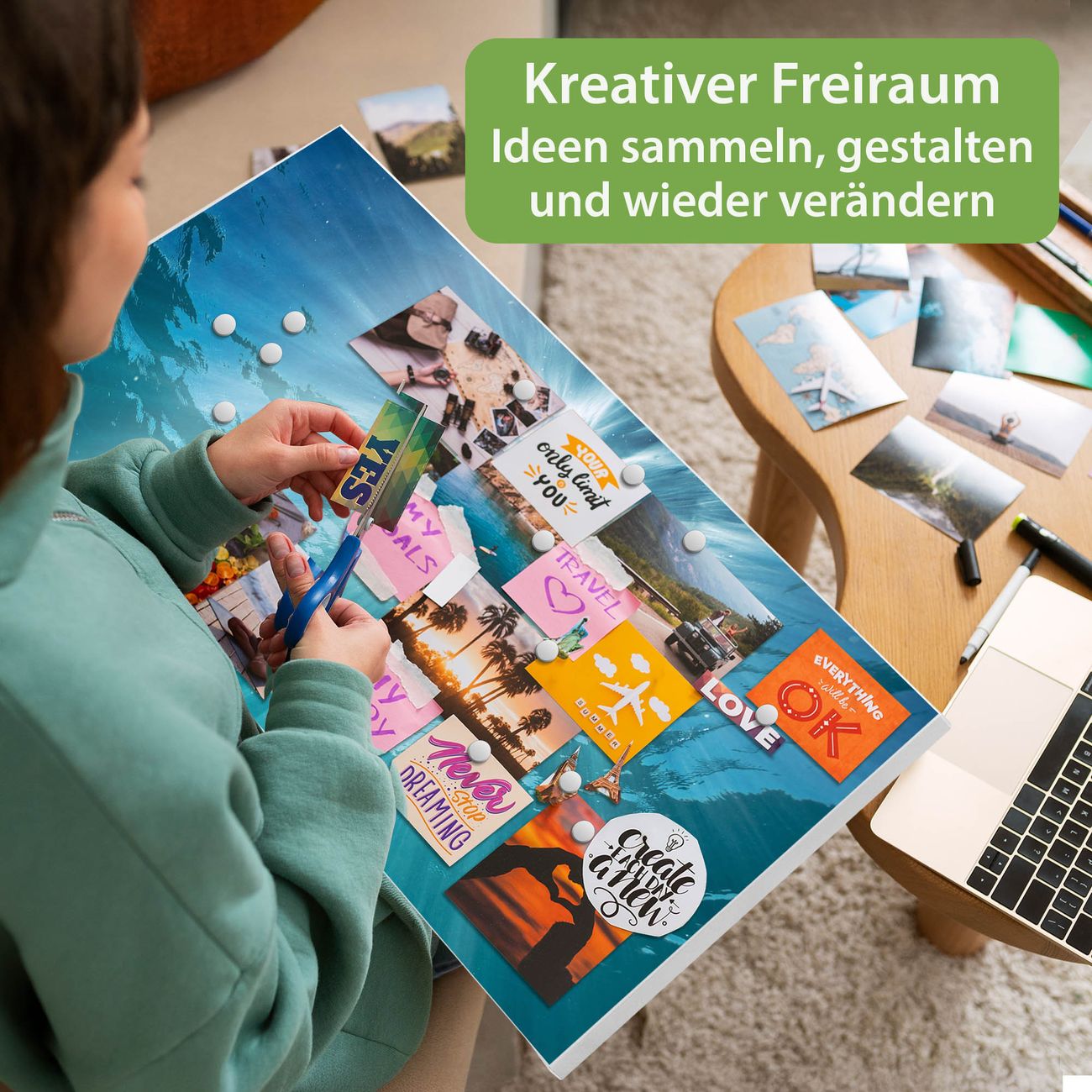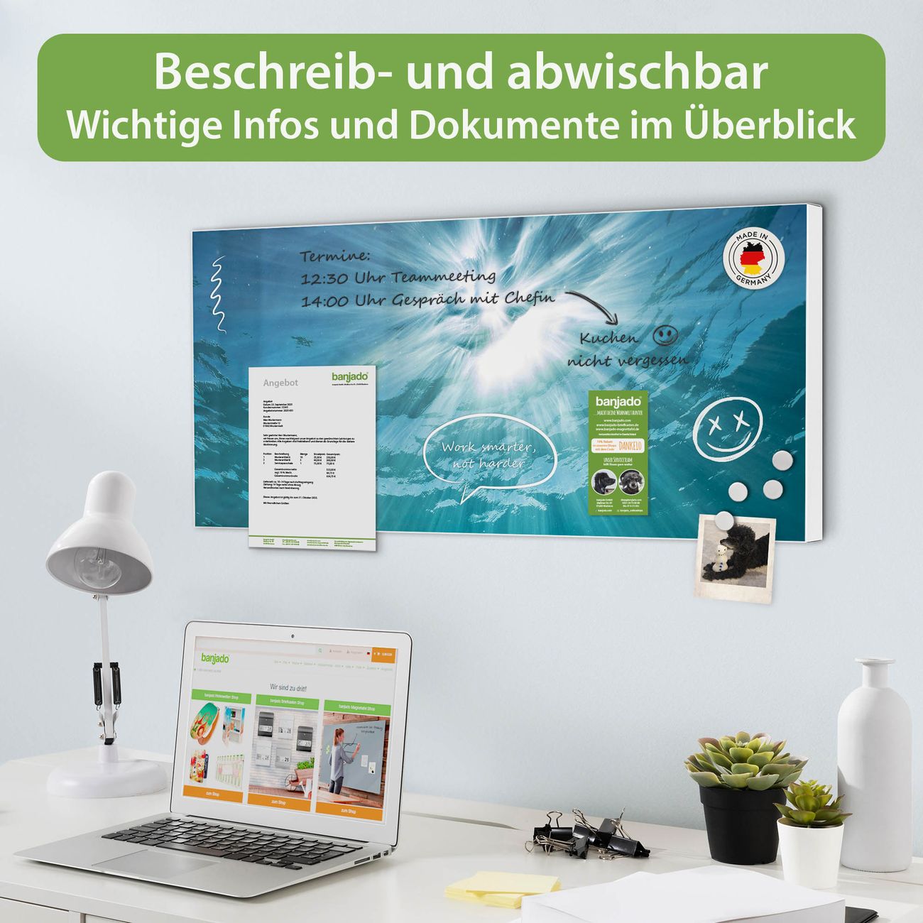 FUNKTION: Die banjado Magnettafel 78x37 cm im Design Motiv Unter der Oberfläche vereint Funktionalität und modernes Wohndesign auf stilvolle Weise. Diese hochwertige Magnetwand aus Metall hilft Ihnen dabei, Notizen, Fotos, Termine, Einkaufslisten oder Rezepte übersichtlich zu organisieren. Als praktisches Memoboard sorgt sie für Struktur im Alltag und setzt gleichzeitig einen dekorativen Akzent an Ihrer Wand. DESIGN: Die Metalltafel besteht aus robustem, lackiertem Stahl und ist mit allen handelsüblichen Magneten nutzbar. Besonders praktisch ist die beschreibbare Oberfläche. Sie können die Magnettafel ganz einfach mit Kreidestiften beschriften und die Inhalte bei Bedarf mit einem feuchten Tuch wieder entfernen. So eignet sich das Memoboard ideal für Wochenpläne, Menüpläne, To Do Listen oder kreative Botschaften. DETAILS: Mit ihrem großzügigen Querformat von 78x37 cm bietet die Magnettafel ausreichend Platz für Ihre Organisation. Das Motiv Motiv Unter der Oberfläche bringt eine warme, natürliche Optik in Küche, Flur, Büro oder Homeoffice und wirkt auch ohne Magnete oder Beschriftung wie ein modernes Wandbild. NUTZEN: Auf der Rückseite befinden sich vorgefertigte Löcher für eine schnelle und unkomplizierte Wandmontage. Jede banjado Magnettafel wird in Deutschland gefertigt und steht für Qualität, Langlebigkeit und liebevolle Verarbeitung. Dieses beschreibbare Memoboard ist die perfekte Kombination aus Metalltafel, Designobjekt und praktischer Magnetwand für Ihren Alltag. BANJADO: Wir sind ein kleines Team aus dem Herzen von Sachsen. Wir fertigen alle Artikel von Hand für Sie an, Sie erhalten keine preiswerte Importware. Auf Wunsch können Sie auch Ihr eigenes Foto auf die Magnettafel aufbringen, schreiben Sie uns an. Herzlichst, Ihr banjado-Team