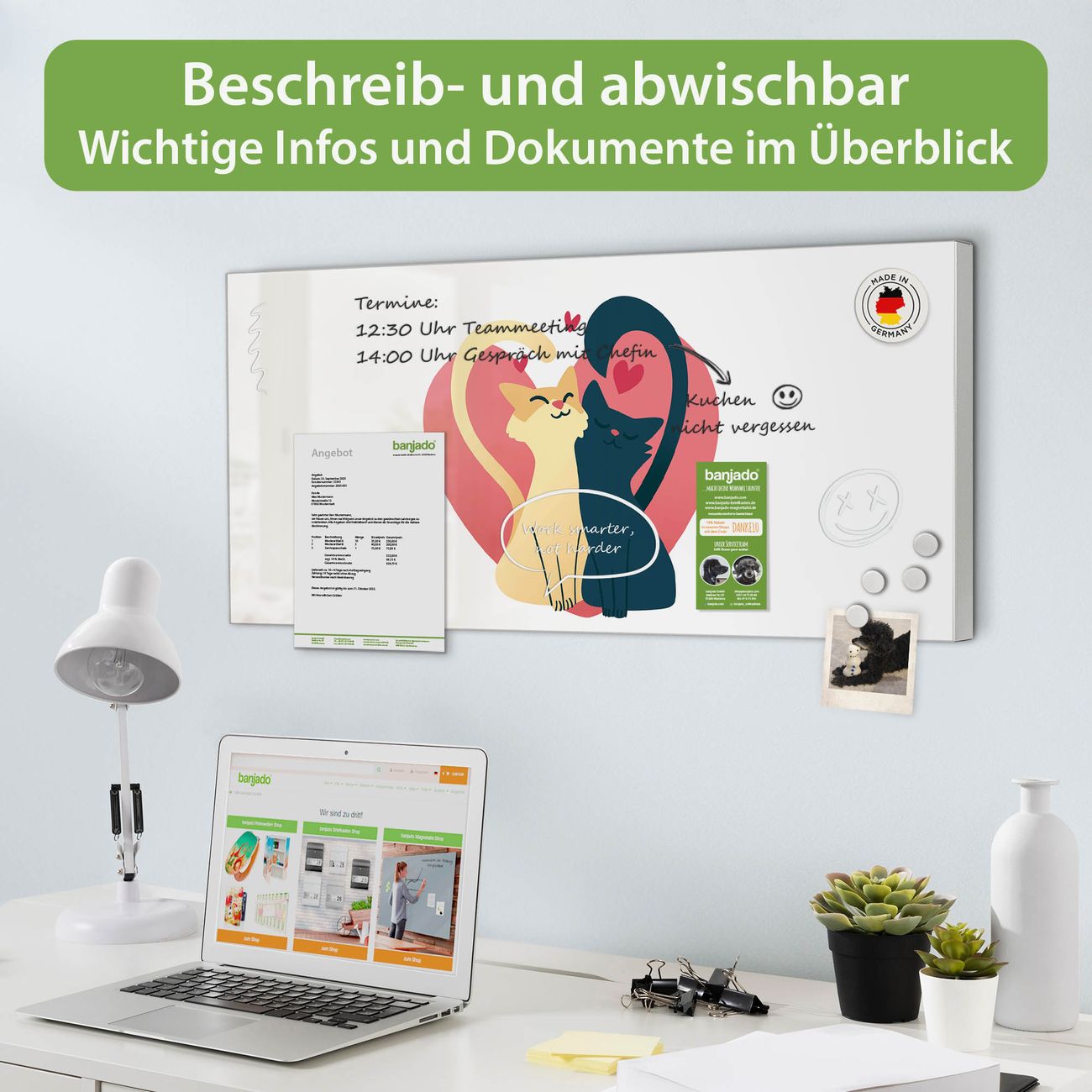 FUNKTION: Die banjado Magnettafel 78x37 cm im Design Motiv Verliebte Katzen 2 vereint Funktionalität und modernes Wohndesign auf stilvolle Weise. Diese hochwertige Magnetwand aus Metall hilft Ihnen dabei, Notizen, Fotos, Termine, Einkaufslisten oder Rezepte übersichtlich zu organisieren. Als praktisches Memoboard sorgt sie für Struktur im Alltag und setzt gleichzeitig einen dekorativen Akzent an Ihrer Wand. DESIGN: Die Metalltafel besteht aus robustem, lackiertem Stahl und ist mit allen handelsüblichen Magneten nutzbar. Besonders praktisch ist die beschreibbare Oberfläche. Sie können die Magnettafel ganz einfach mit Kreidestiften beschriften und die Inhalte bei Bedarf mit einem feuchten Tuch wieder entfernen. So eignet sich das Memoboard ideal für Wochenpläne, Menüpläne, To Do Listen oder kreative Botschaften. DETAILS: Mit ihrem großzügigen Querformat von 78x37 cm bietet die Magnettafel ausreichend Platz für Ihre Organisation. Das Motiv Motiv Verliebte Katzen 2 bringt eine warme, natürliche Optik in Küche, Flur, Büro oder Homeoffice und wirkt auch ohne Magnete oder Beschriftung wie ein modernes Wandbild. NUTZEN: Auf der Rückseite befinden sich vorgefertigte Löcher für eine schnelle und unkomplizierte Wandmontage. Jede banjado Magnettafel wird in Deutschland gefertigt und steht für Qualität, Langlebigkeit und liebevolle Verarbeitung. Dieses beschreibbare Memoboard ist die perfekte Kombination aus Metalltafel, Designobjekt und praktischer Magnetwand für Ihren Alltag. BANJADO: Wir sind ein kleines Team aus dem Herzen von Sachsen. Wir fertigen alle Artikel von Hand für Sie an, Sie erhalten keine preiswerte Importware. Auf Wunsch können Sie auch Ihr eigenes Foto auf die Magnettafel aufbringen, schreiben Sie uns an. Herzlichst, Ihr banjado-Team