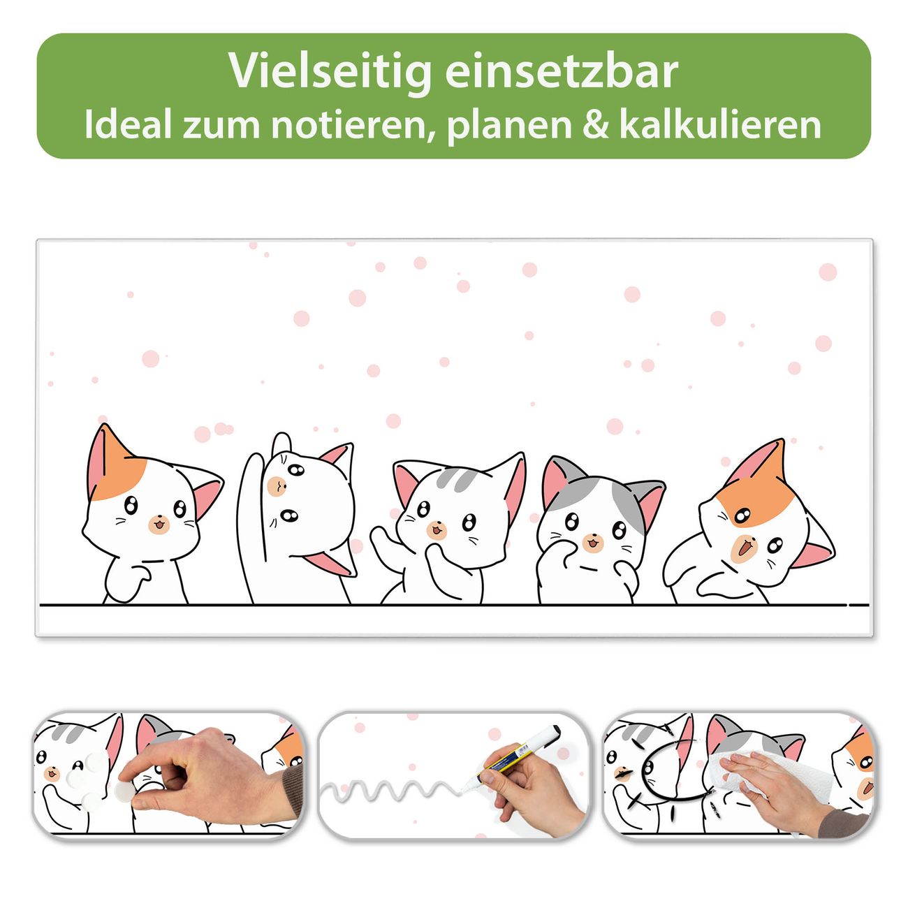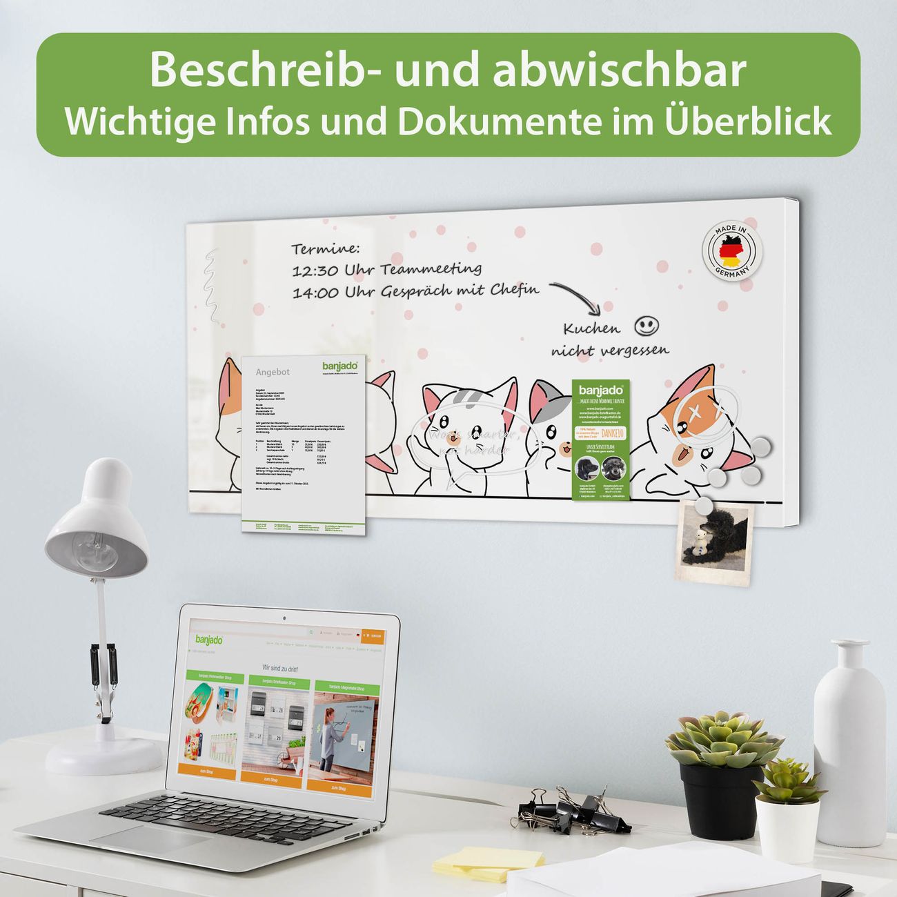 FUNKTION: Die banjado Magnettafel 78x37 cm im Design Motiv Verspielte Kätzchen vereint Funktionalität und modernes Wohndesign auf stilvolle Weise. Diese hochwertige Magnetwand aus Metall hilft Ihnen dabei, Notizen, Fotos, Termine, Einkaufslisten oder Rezepte übersichtlich zu organisieren. Als praktisches Memoboard sorgt sie für Struktur im Alltag und setzt gleichzeitig einen dekorativen Akzent an Ihrer Wand. DESIGN: Die Metalltafel besteht aus robustem, lackiertem Stahl und ist mit allen handelsüblichen Magneten nutzbar. Besonders praktisch ist die beschreibbare Oberfläche. Sie können die Magnettafel ganz einfach mit Kreidestiften beschriften und die Inhalte bei Bedarf mit einem feuchten Tuch wieder entfernen. So eignet sich das Memoboard ideal für Wochenpläne, Menüpläne, To Do Listen oder kreative Botschaften. DETAILS: Mit ihrem großzügigen Querformat von 78x37 cm bietet die Magnettafel ausreichend Platz für Ihre Organisation. Das Motiv Motiv Verspielte Kätzchen bringt eine warme, natürliche Optik in Küche, Flur, Büro oder Homeoffice und wirkt auch ohne Magnete oder Beschriftung wie ein modernes Wandbild. NUTZEN: Auf der Rückseite befinden sich vorgefertigte Löcher für eine schnelle und unkomplizierte Wandmontage. Jede banjado Magnettafel wird in Deutschland gefertigt und steht für Qualität, Langlebigkeit und liebevolle Verarbeitung. Dieses beschreibbare Memoboard ist die perfekte Kombination aus Metalltafel, Designobjekt und praktischer Magnetwand für Ihren Alltag. BANJADO: Wir sind ein kleines Team aus dem Herzen von Sachsen. Wir fertigen alle Artikel von Hand für Sie an, Sie erhalten keine preiswerte Importware. Auf Wunsch können Sie auch Ihr eigenes Foto auf die Magnettafel aufbringen, schreiben Sie uns an. Herzlichst, Ihr banjado-Team