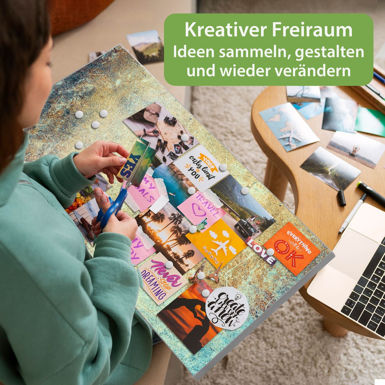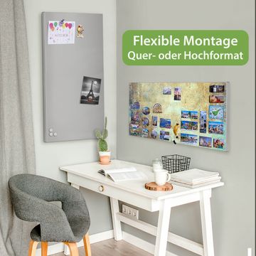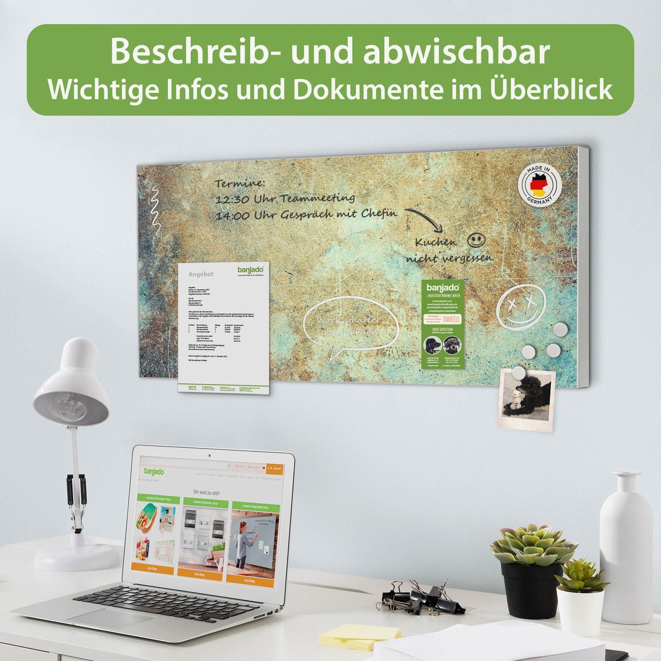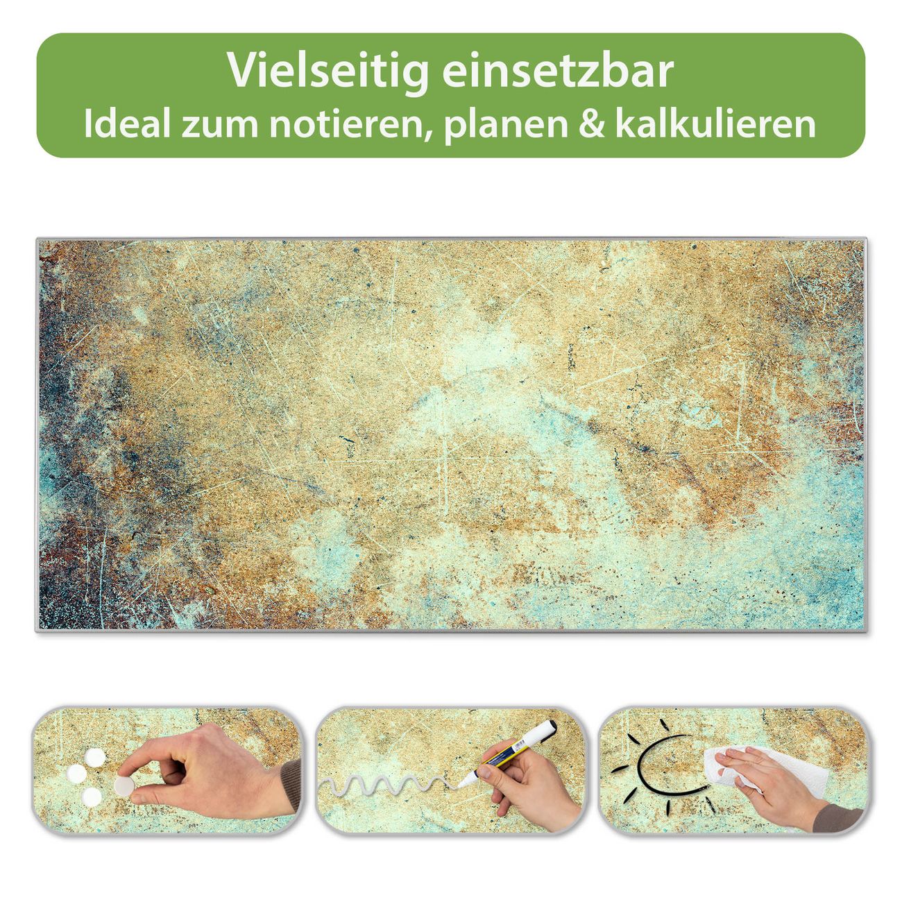 FUNKTION: Die banjado Magnettafel 78x37 cm im Design Motiv Verwitterte Patina vereint Funktionalität und modernes Wohndesign auf stilvolle Weise. Diese hochwertige Magnetwand aus Metall hilft Ihnen dabei, Notizen, Fotos, Termine, Einkaufslisten oder Rezepte übersichtlich zu organisieren. Als praktisches Memoboard sorgt sie für Struktur im Alltag und setzt gleichzeitig einen dekorativen Akzent an Ihrer Wand. DESIGN: Die Metalltafel besteht aus robustem, lackiertem Stahl und ist mit allen handelsüblichen Magneten nutzbar. Besonders praktisch ist die beschreibbare Oberfläche. Sie können die Magnettafel ganz einfach mit Kreidestiften beschriften und die Inhalte bei Bedarf mit einem feuchten Tuch wieder entfernen. So eignet sich das Memoboard ideal für Wochenpläne, Menüpläne, To Do Listen oder kreative Botschaften. DETAILS: Mit ihrem großzügigen Querformat von 78x37 cm bietet die Magnettafel ausreichend Platz für Ihre Organisation. Das Motiv Motiv Verwitterte Patina bringt eine warme, natürliche Optik in Küche, Flur, Büro oder Homeoffice und wirkt auch ohne Magnete oder Beschriftung wie ein modernes Wandbild. NUTZEN: Auf der Rückseite befinden sich vorgefertigte Löcher für eine schnelle und unkomplizierte Wandmontage. Jede banjado Magnettafel wird in Deutschland gefertigt und steht für Qualität, Langlebigkeit und liebevolle Verarbeitung. Dieses beschreibbare Memoboard ist die perfekte Kombination aus Metalltafel, Designobjekt und praktischer Magnetwand für Ihren Alltag. BANJADO: Wir sind ein kleines Team aus dem Herzen von Sachsen. Wir fertigen alle Artikel von Hand für Sie an, Sie erhalten keine preiswerte Importware. Auf Wunsch können Sie auch Ihr eigenes Foto auf die Magnettafel aufbringen, schreiben Sie uns an. Herzlichst, Ihr banjado-Team