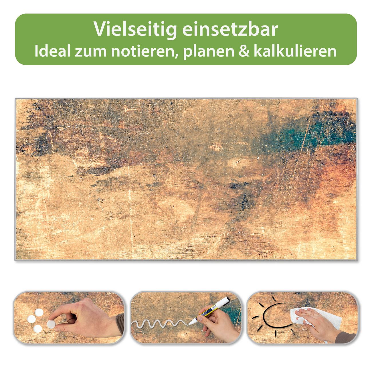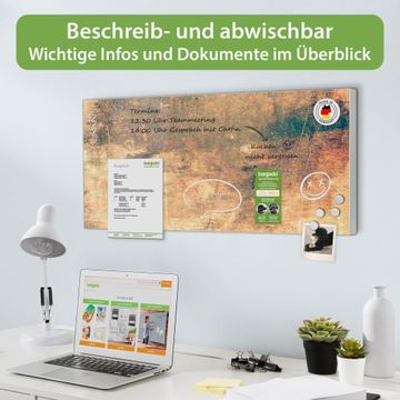 FUNKTION: Die banjado Magnettafel 78x37 cm im Design Motiv Verwittertes Holz 2 vereint Funktionalität und modernes Wohndesign auf stilvolle Weise. Diese hochwertige Magnetwand aus Metall hilft Ihnen dabei, Notizen, Fotos, Termine, Einkaufslisten oder Rezepte übersichtlich zu organisieren. Als praktisches Memoboard sorgt sie für Struktur im Alltag und setzt gleichzeitig einen dekorativen Akzent an Ihrer Wand. DESIGN: Die Metalltafel besteht aus robustem, lackiertem Stahl und ist mit allen handelsüblichen Magneten nutzbar. Besonders praktisch ist die beschreibbare Oberfläche. Sie können die Magnettafel ganz einfach mit Kreidestiften beschriften und die Inhalte bei Bedarf mit einem feuchten Tuch wieder entfernen. So eignet sich das Memoboard ideal für Wochenpläne, Menüpläne, To Do Listen oder kreative Botschaften. DETAILS: Mit ihrem großzügigen Querformat von 78x37 cm bietet die Magnettafel ausreichend Platz für Ihre Organisation. Das Motiv Motiv Verwittertes Holz 2 bringt eine warme, natürliche Optik in Küche, Flur, Büro oder Homeoffice und wirkt auch ohne Magnete oder Beschriftung wie ein modernes Wandbild. NUTZEN: Auf der Rückseite befinden sich vorgefertigte Löcher für eine schnelle und unkomplizierte Wandmontage. Jede banjado Magnettafel wird in Deutschland gefertigt und steht für Qualität, Langlebigkeit und liebevolle Verarbeitung. Dieses beschreibbare Memoboard ist die perfekte Kombination aus Metalltafel, Designobjekt und praktischer Magnetwand für Ihren Alltag. BANJADO: Wir sind ein kleines Team aus dem Herzen von Sachsen. Wir fertigen alle Artikel von Hand für Sie an, Sie erhalten keine preiswerte Importware. Auf Wunsch können Sie auch Ihr eigenes Foto auf die Magnettafel aufbringen, schreiben Sie uns an. Herzlichst, Ihr banjado-Team
