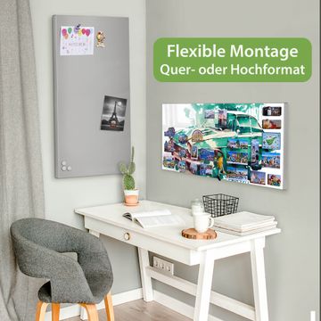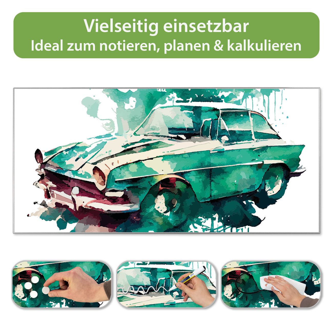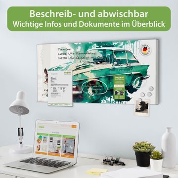 FUNKTION: Die banjado Magnettafel 78x37 cm im Design Motiv Vintage Auto Aquarell vereint Funktionalität und modernes Wohndesign auf stilvolle Weise. Diese hochwertige Magnetwand aus Metall hilft Ihnen dabei, Notizen, Fotos, Termine, Einkaufslisten oder Rezepte übersichtlich zu organisieren. Als praktisches Memoboard sorgt sie für Struktur im Alltag und setzt gleichzeitig einen dekorativen Akzent an Ihrer Wand. DESIGN: Die Metalltafel besteht aus robustem, lackiertem Stahl und ist mit allen handelsüblichen Magneten nutzbar. Besonders praktisch ist die beschreibbare Oberfläche. Sie können die Magnettafel ganz einfach mit Kreidestiften beschriften und die Inhalte bei Bedarf mit einem feuchten Tuch wieder entfernen. So eignet sich das Memoboard ideal für Wochenpläne, Menüpläne, To Do Listen oder kreative Botschaften. DETAILS: Mit ihrem großzügigen Querformat von 78x37 cm bietet die Magnettafel ausreichend Platz für Ihre Organisation. Das Motiv Motiv Vintage Auto Aquarell bringt eine warme, natürliche Optik in Küche, Flur, Büro oder Homeoffice und wirkt auch ohne Magnete oder Beschriftung wie ein modernes Wandbild. NUTZEN: Auf der Rückseite befinden sich vorgefertigte Löcher für eine schnelle und unkomplizierte Wandmontage. Jede banjado Magnettafel wird in Deutschland gefertigt und steht für Qualität, Langlebigkeit und liebevolle Verarbeitung. Dieses beschreibbare Memoboard ist die perfekte Kombination aus Metalltafel, Designobjekt und praktischer Magnetwand für Ihren Alltag. BANJADO: Wir sind ein kleines Team aus dem Herzen von Sachsen. Wir fertigen alle Artikel von Hand für Sie an, Sie erhalten keine preiswerte Importware. Auf Wunsch können Sie auch Ihr eigenes Foto auf die Magnettafel aufbringen, schreiben Sie uns an. Herzlichst, Ihr banjado-Team