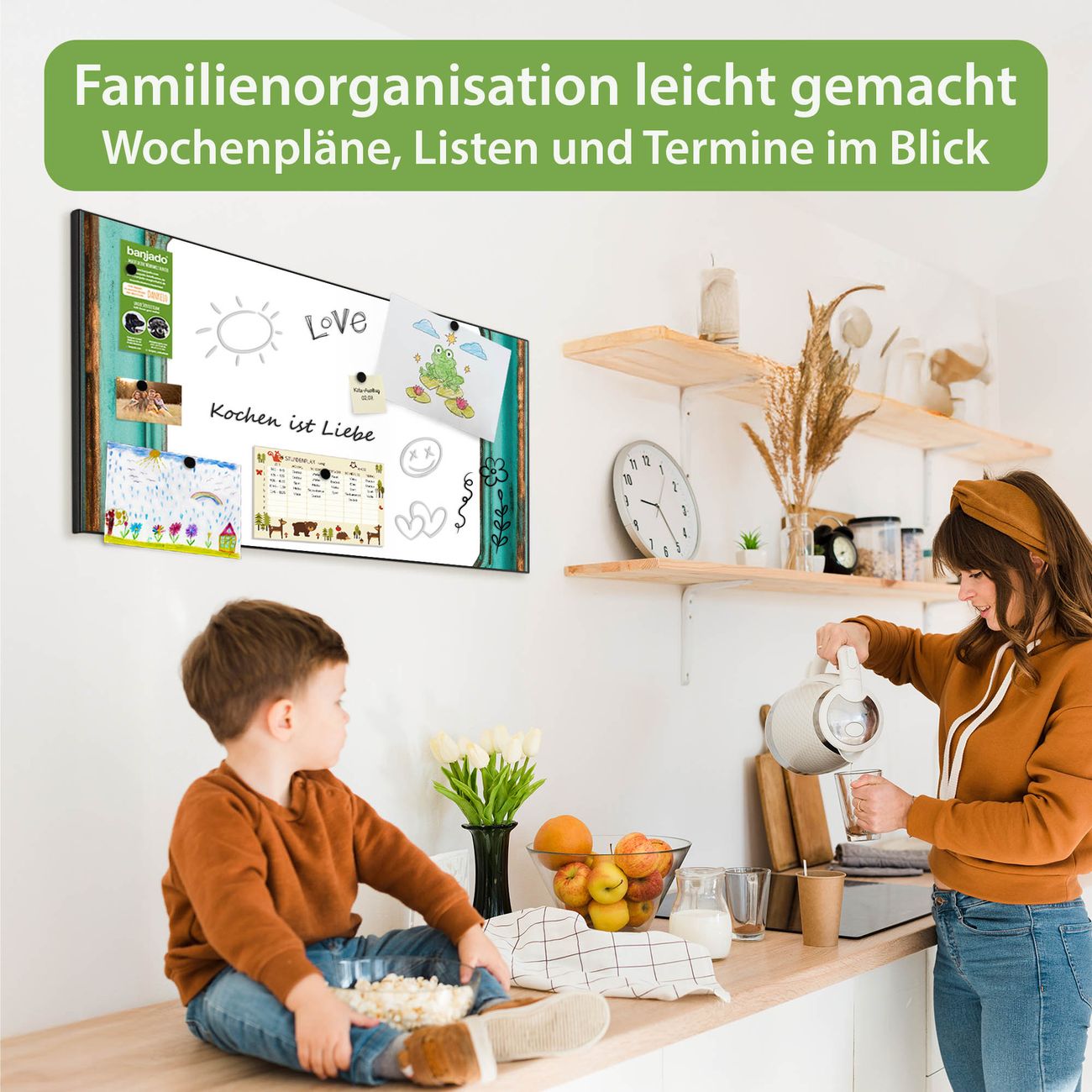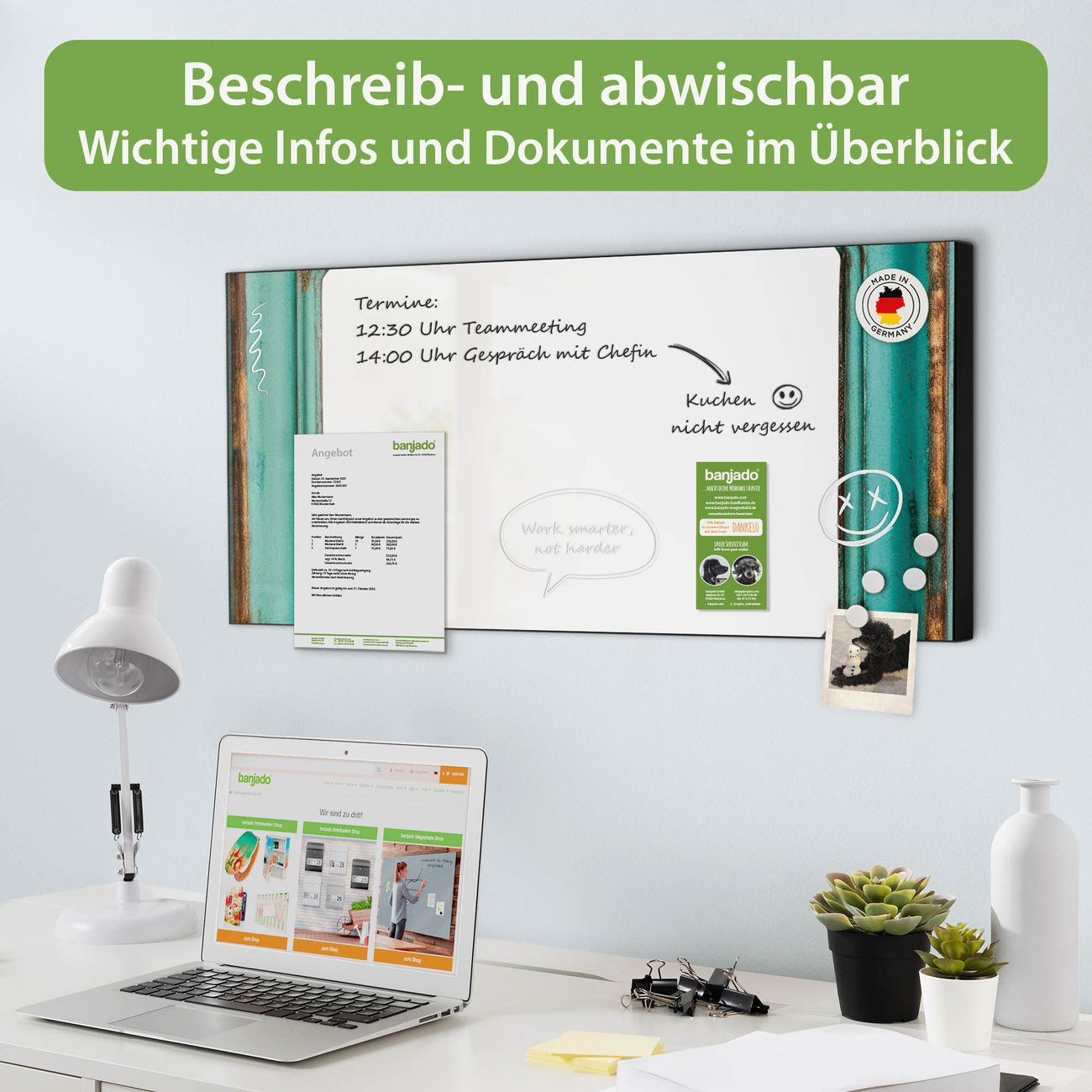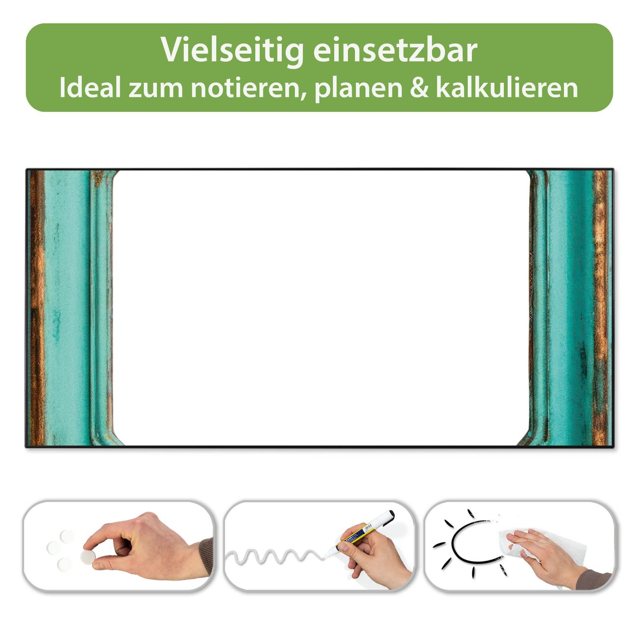 FUNKTION: Die banjado Magnettafel 78x37 cm im Design Motiv Vintage Metallrahmen vereint Funktionalität und modernes Wohndesign auf stilvolle Weise. Diese hochwertige Magnetwand aus Metall hilft Ihnen dabei, Notizen, Fotos, Termine, Einkaufslisten oder Rezepte übersichtlich zu organisieren. Als praktisches Memoboard sorgt sie für Struktur im Alltag und setzt gleichzeitig einen dekorativen Akzent an Ihrer Wand. DESIGN: Die Metalltafel besteht aus robustem, lackiertem Stahl und ist mit allen handelsüblichen Magneten nutzbar. Besonders praktisch ist die beschreibbare Oberfläche. Sie können die Magnettafel ganz einfach mit Kreidestiften beschriften und die Inhalte bei Bedarf mit einem feuchten Tuch wieder entfernen. So eignet sich das Memoboard ideal für Wochenpläne, Menüpläne, To Do Listen oder kreative Botschaften. DETAILS: Mit ihrem großzügigen Querformat von 78x37 cm bietet die Magnettafel ausreichend Platz für Ihre Organisation. Das Motiv Motiv Vintage Metallrahmen bringt eine warme, natürliche Optik in Küche, Flur, Büro oder Homeoffice und wirkt auch ohne Magnete oder Beschriftung wie ein modernes Wandbild. NUTZEN: Auf der Rückseite befinden sich vorgefertigte Löcher für eine schnelle und unkomplizierte Wandmontage. Jede banjado Magnettafel wird in Deutschland gefertigt und steht für Qualität, Langlebigkeit und liebevolle Verarbeitung. Dieses beschreibbare Memoboard ist die perfekte Kombination aus Metalltafel, Designobjekt und praktischer Magnetwand für Ihren Alltag. BANJADO: Wir sind ein kleines Team aus dem Herzen von Sachsen. Wir fertigen alle Artikel von Hand für Sie an, Sie erhalten keine preiswerte Importware. Auf Wunsch können Sie auch Ihr eigenes Foto auf die Magnettafel aufbringen, schreiben Sie uns an. Herzlichst, Ihr banjado-Team