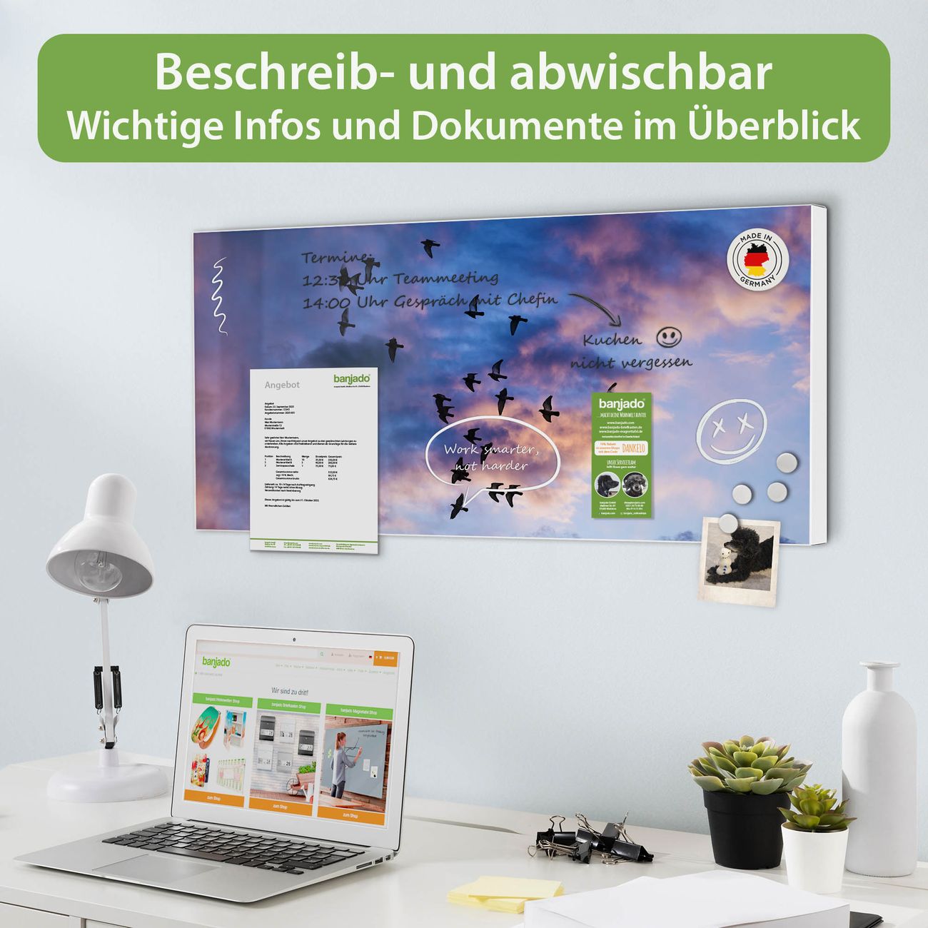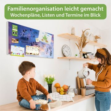 FUNKTION: Die banjado Magnettafel 78x37 cm im Design Motiv Vögel am Himmel 3 vereint Funktionalität und modernes Wohndesign auf stilvolle Weise. Diese hochwertige Magnetwand aus Metall hilft Ihnen dabei, Notizen, Fotos, Termine, Einkaufslisten oder Rezepte übersichtlich zu organisieren. Als praktisches Memoboard sorgt sie für Struktur im Alltag und setzt gleichzeitig einen dekorativen Akzent an Ihrer Wand. DESIGN: Die Metalltafel besteht aus robustem, lackiertem Stahl und ist mit allen handelsüblichen Magneten nutzbar. Besonders praktisch ist die beschreibbare Oberfläche. Sie können die Magnettafel ganz einfach mit Kreidestiften beschriften und die Inhalte bei Bedarf mit einem feuchten Tuch wieder entfernen. So eignet sich das Memoboard ideal für Wochenpläne, Menüpläne, To Do Listen oder kreative Botschaften. DETAILS: Mit ihrem großzügigen Querformat von 78x37 cm bietet die Magnettafel ausreichend Platz für Ihre Organisation. Das Motiv Motiv Vögel am Himmel 3 bringt eine warme, natürliche Optik in Küche, Flur, Büro oder Homeoffice und wirkt auch ohne Magnete oder Beschriftung wie ein modernes Wandbild. NUTZEN: Auf der Rückseite befinden sich vorgefertigte Löcher für eine schnelle und unkomplizierte Wandmontage. Jede banjado Magnettafel wird in Deutschland gefertigt und steht für Qualität, Langlebigkeit und liebevolle Verarbeitung. Dieses beschreibbare Memoboard ist die perfekte Kombination aus Metalltafel, Designobjekt und praktischer Magnetwand für Ihren Alltag. BANJADO: Wir sind ein kleines Team aus dem Herzen von Sachsen. Wir fertigen alle Artikel von Hand für Sie an, Sie erhalten keine preiswerte Importware. Auf Wunsch können Sie auch Ihr eigenes Foto auf die Magnettafel aufbringen, schreiben Sie uns an. Herzlichst, Ihr banjado-Team